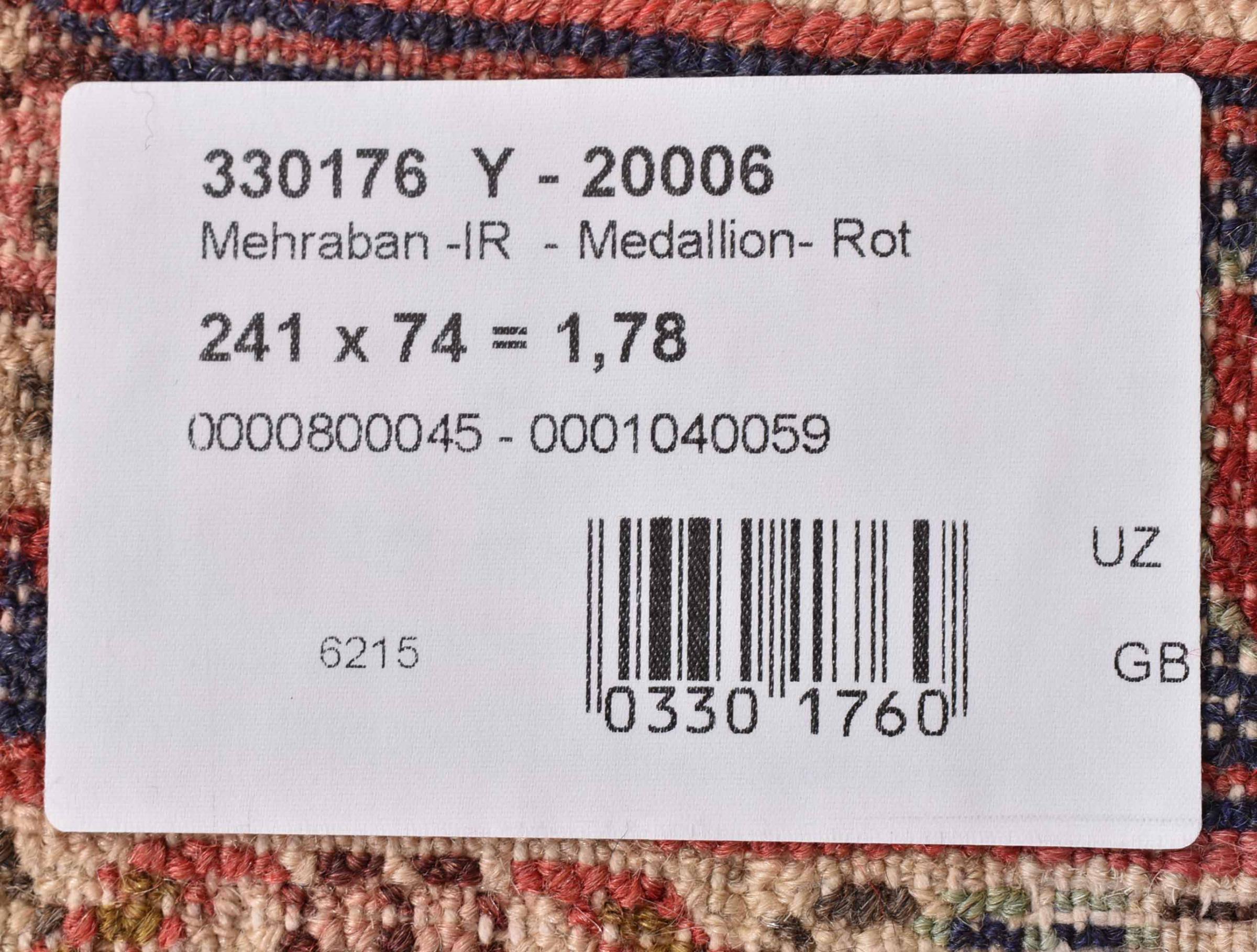 Alfombra número: 300815005078758 Tamaño: 242x73 cm Espesor: alrededor de 12 mm Nudos: 128 000 - 160 000 / m² Elaboración: Anudado a mano Crespón: Lana hilada a mano Urdimbre: Algodón Origen: Persia / Iran Edad: Nuevo Peso: alrededor de 6 kg También conocido como Meriban Cantidad en stock: Única - Solo 1 en stock