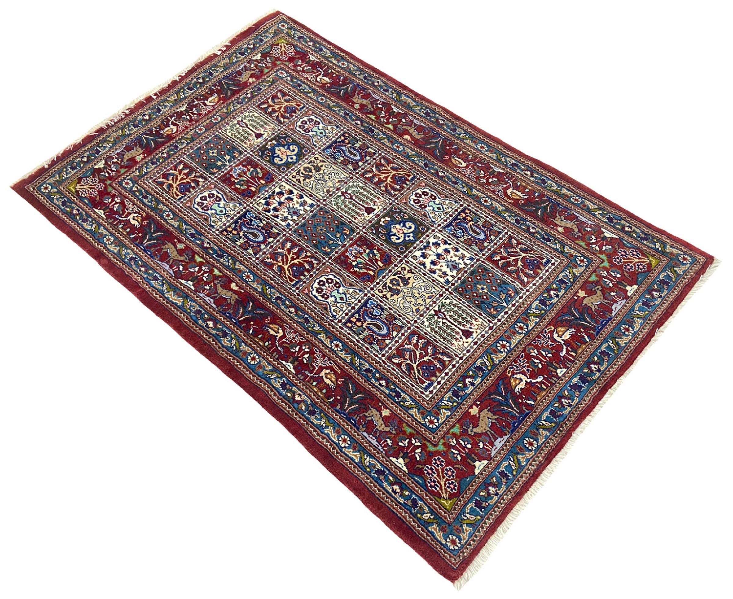 Esta alfombra de Moud, una ciudad situada a 300 km al sur de Mashhad, es realmente cautivadora. Sus motivos hérati son muy apreciados por los conocedores y amantes de las alfombras persas. Si lo que busca es una alfombra de fina calidad, para un uso variado en distintas circunstancias, está en el lugar correcto.
