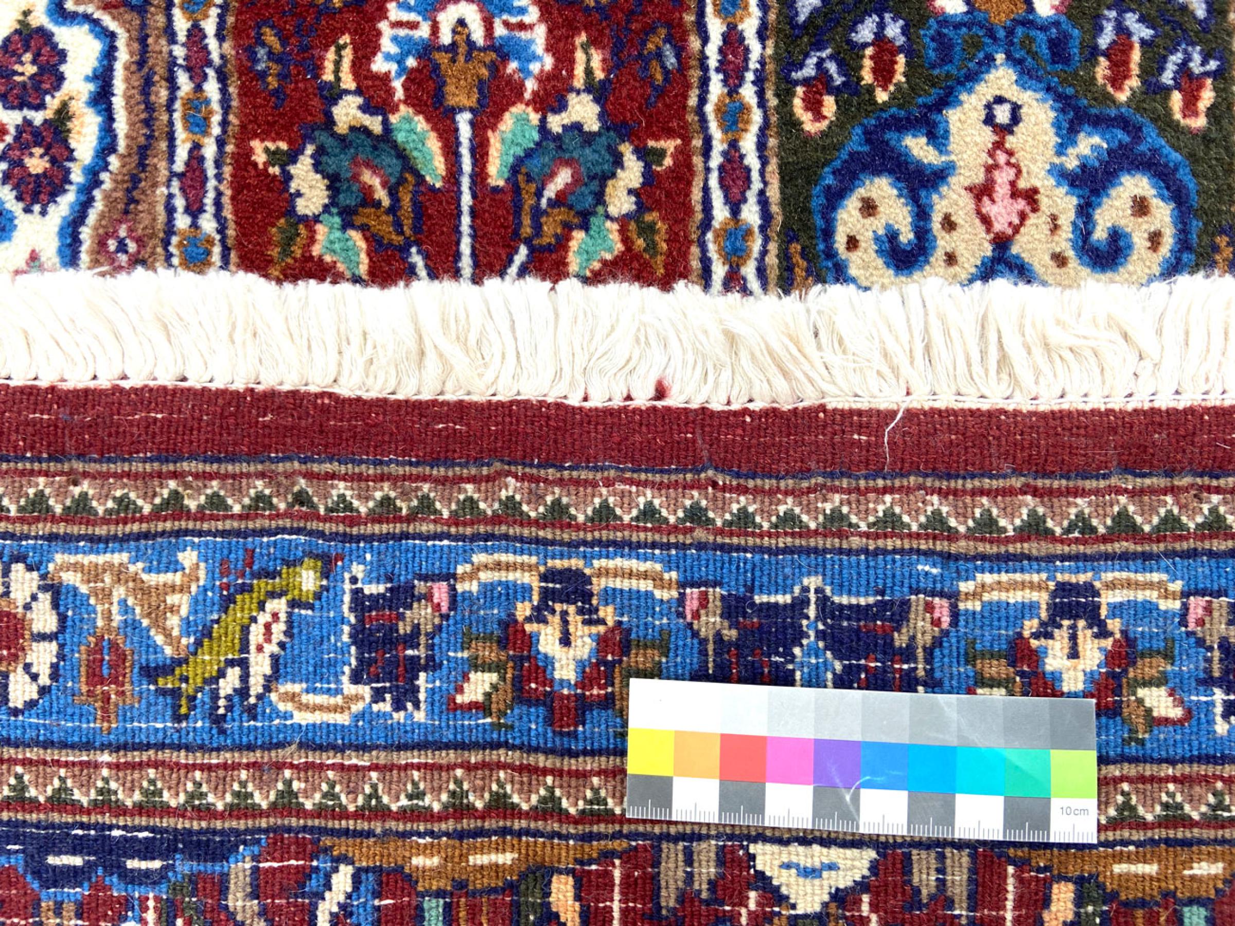 Esta alfombra está hecha de lana de oveja hilada a mano de la más alta calidad. Especialmente en Irán (antigua Persia), la lana de Afganistán y Pakistán sigue siendo hilada a mano antes de que comience el anudado de la alfombra. La lana ha demostrado ser un material natural y extremadamente resistente a lo largo de los siglos. Entre otras cosas, tiene propiedades repelentes de la suciedad y aislantes del calor. Al mismo tiempo, la lana es incomparablemente suave y tiene un brillo natural.