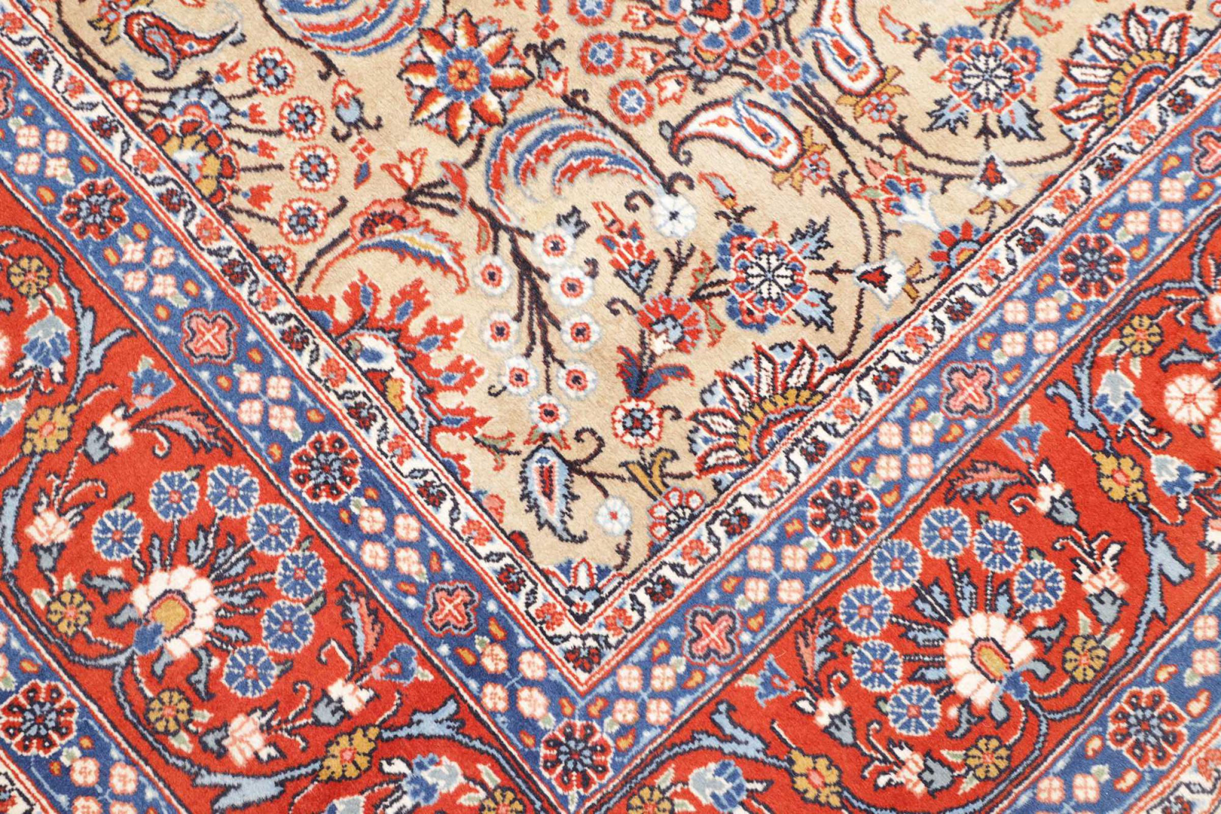 Esta alfombra está hecha de lana de oveja hilada a mano de la más alta calidad. Especialmente en Irán (antigua Persia), la lana de Afganistán y Pakistán sigue siendo hilada a mano antes de que comience el anudado de la alfombra. La lana ha demostrado ser un material natural y extremadamente resistente a lo largo de los siglos. Entre otras cosas, tiene propiedades repelentes de la suciedad y aislantes del calor. Al mismo tiempo, la lana es incomparablemente suave y tiene un brillo natural.