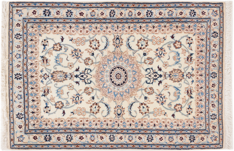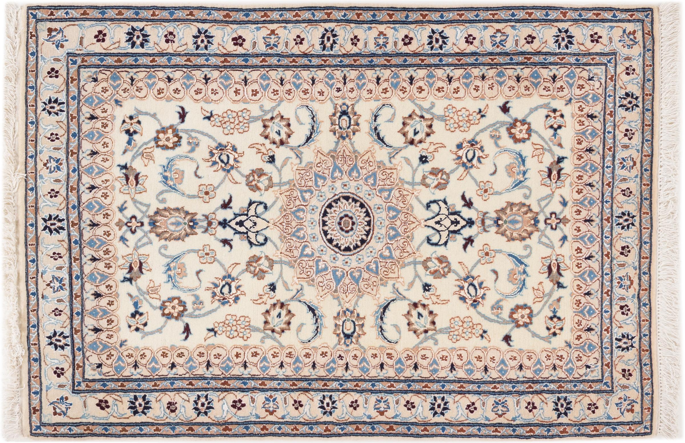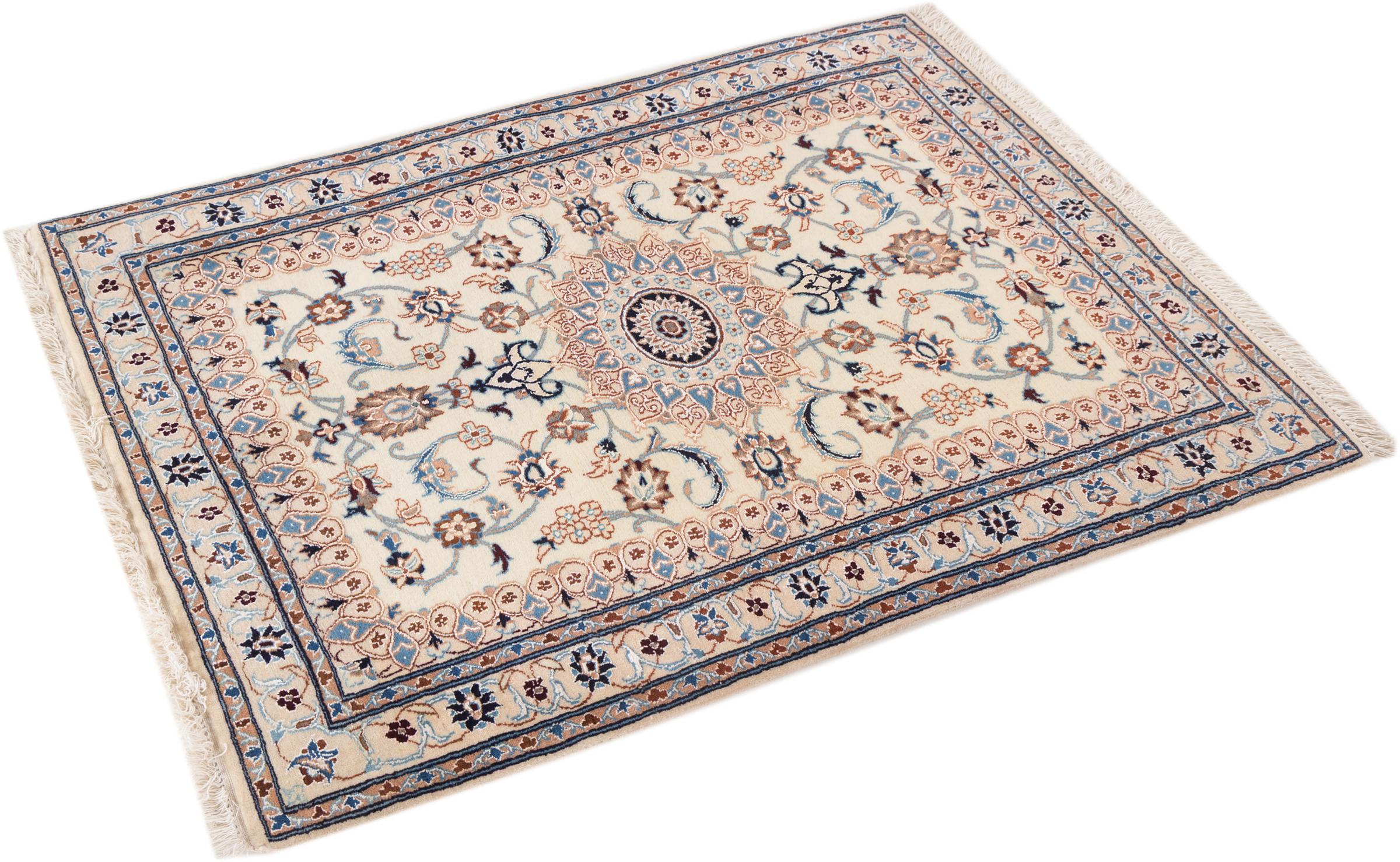 Las alfombras de la ciudad de Nain, en la frontera de uno de los mayores desiertos de Irán, están entre las alfombras persas más famosas del mundo. Su diseño típico es inconfundible con adornos florales, un medallón central y tonos beige y rojo o azul. Gracias a sus designaciones 4La, 6La, 9La y 12La, las sutilezas de una alfombra de Nain se pueden ver a simple vista. Cuanto más bajo sea el número "La", más alta es la densidad del nudo y por lo tanto más fina es la alfombra.