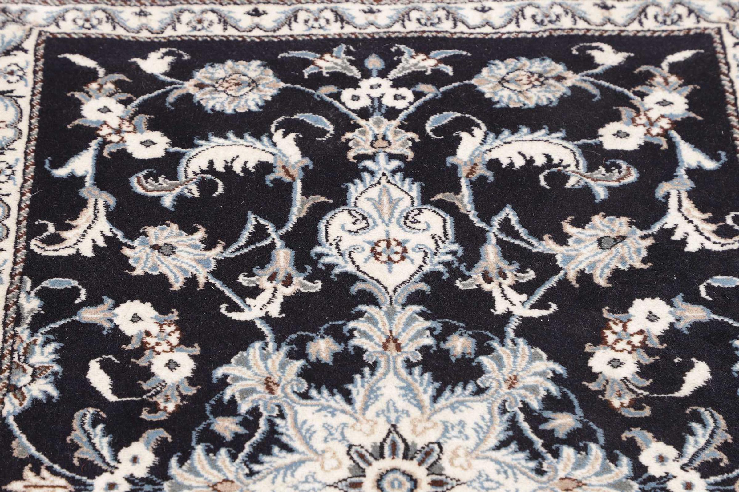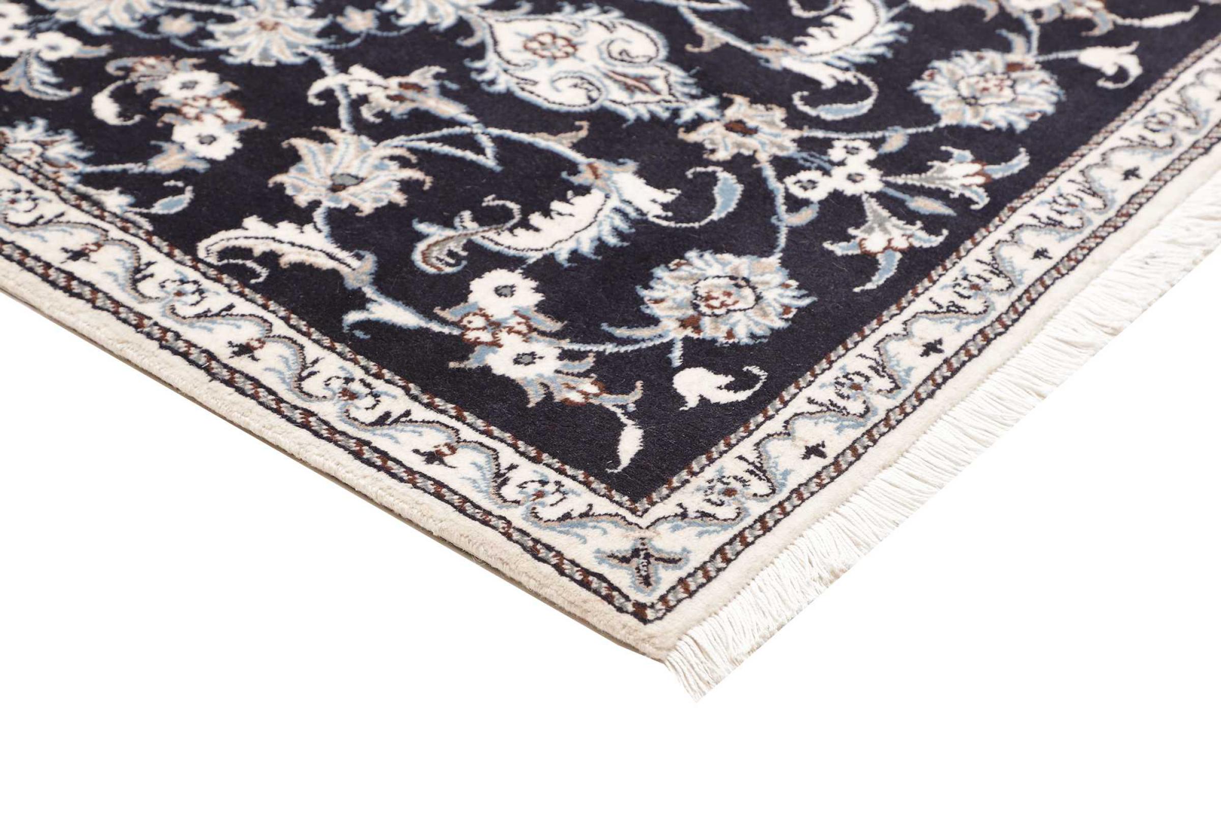 Esta alfombra Nain está clasificada como 12La. Tiene un aspecto elegante y refinado con su colorido típico de Naín. Esta alfombra persa fue anudada a mano en la ciudad de Naín, situada en el extremo occidental del desierto de Dasht-e-Kavir, con lana de alta calidad y seda natural. Con un tamaño de 12La, no está tan finamente detallada con ornamentos como una Nain 9La o 6La.