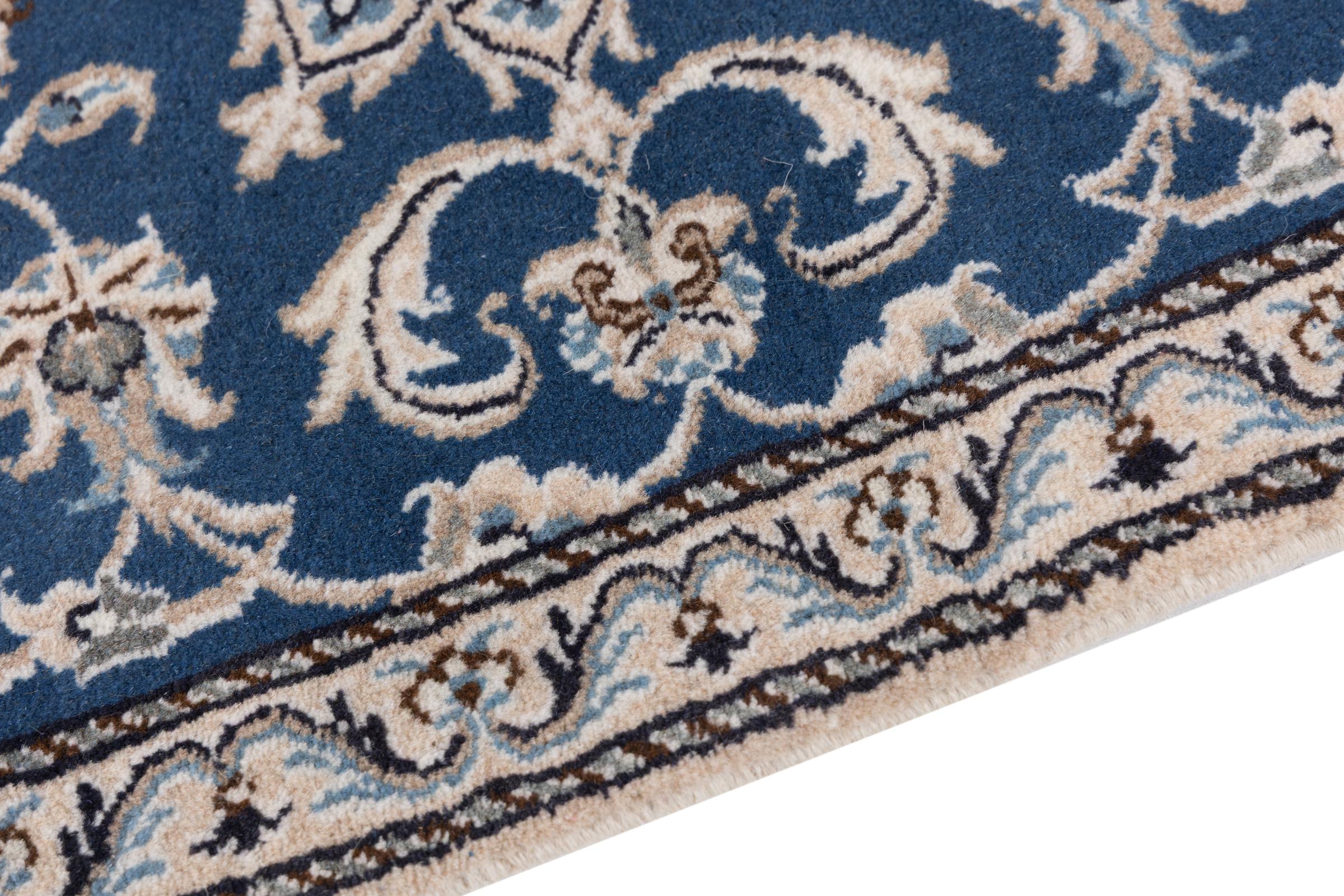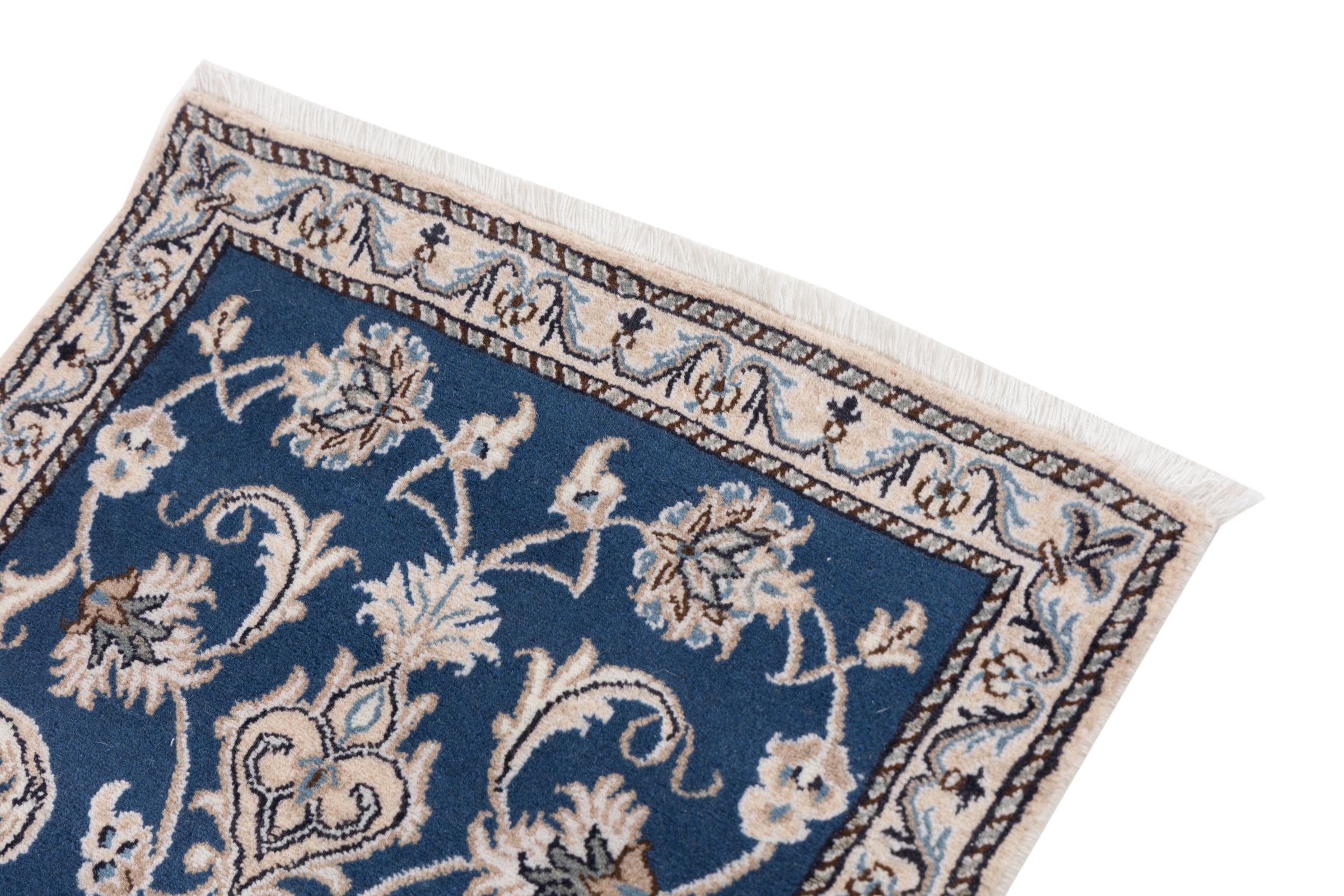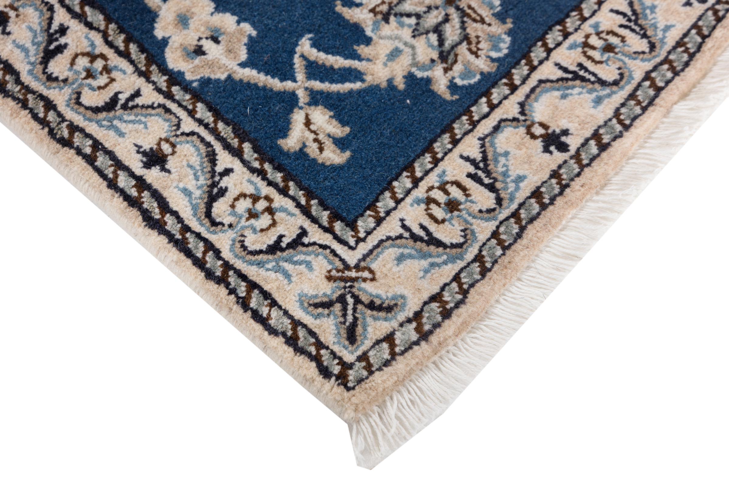 Esta alfombra Nain está clasificada como 12La. Tiene un aspecto elegante y refinado con su colorido típico de Naín. Esta alfombra persa fue anudada a mano en la ciudad de Naín, situada en el extremo occidental del desierto de Dasht-e-Kavir, con lana de alta calidad y seda natural. Con un tamaño de 12La, no está tan finamente detallada con ornamentos como una Nain 9La o 6La.
