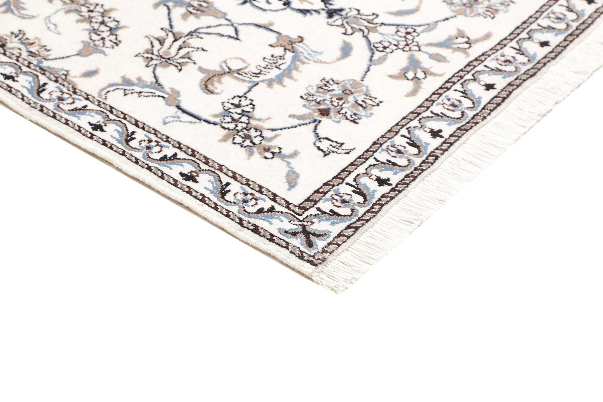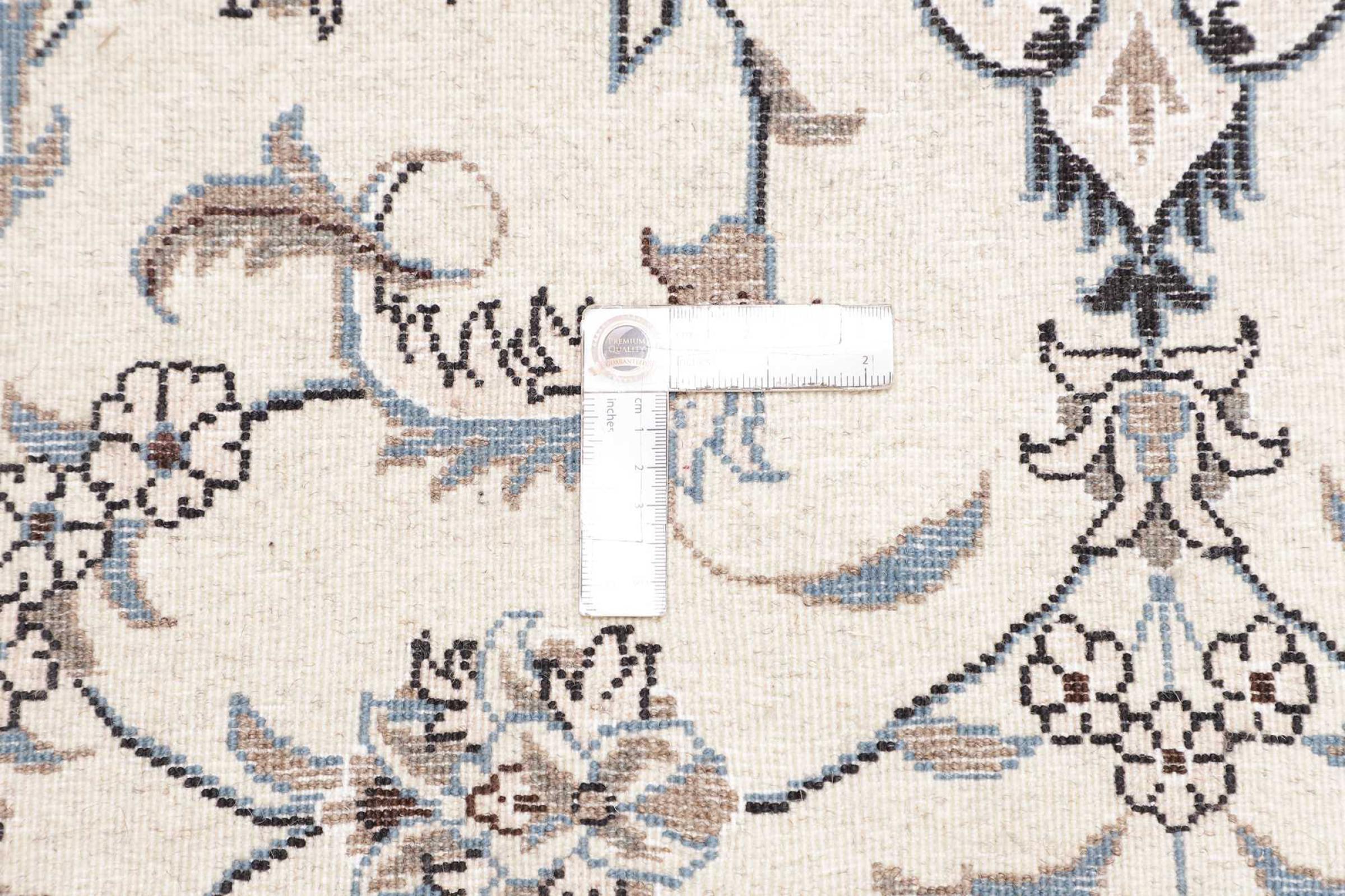 Esta alfombra Nain está clasificada como 12La. Tiene un aspecto elegante y refinado con su colorido típico de Naín. Esta alfombra persa fue anudada a mano en la ciudad de Naín, situada en el extremo occidental del desierto de Dasht-e-Kavir, con lana de alta calidad y seda natural. Con un tamaño de 12La, no está tan finamente detallada con ornamentos como una Nain 9La o 6La.