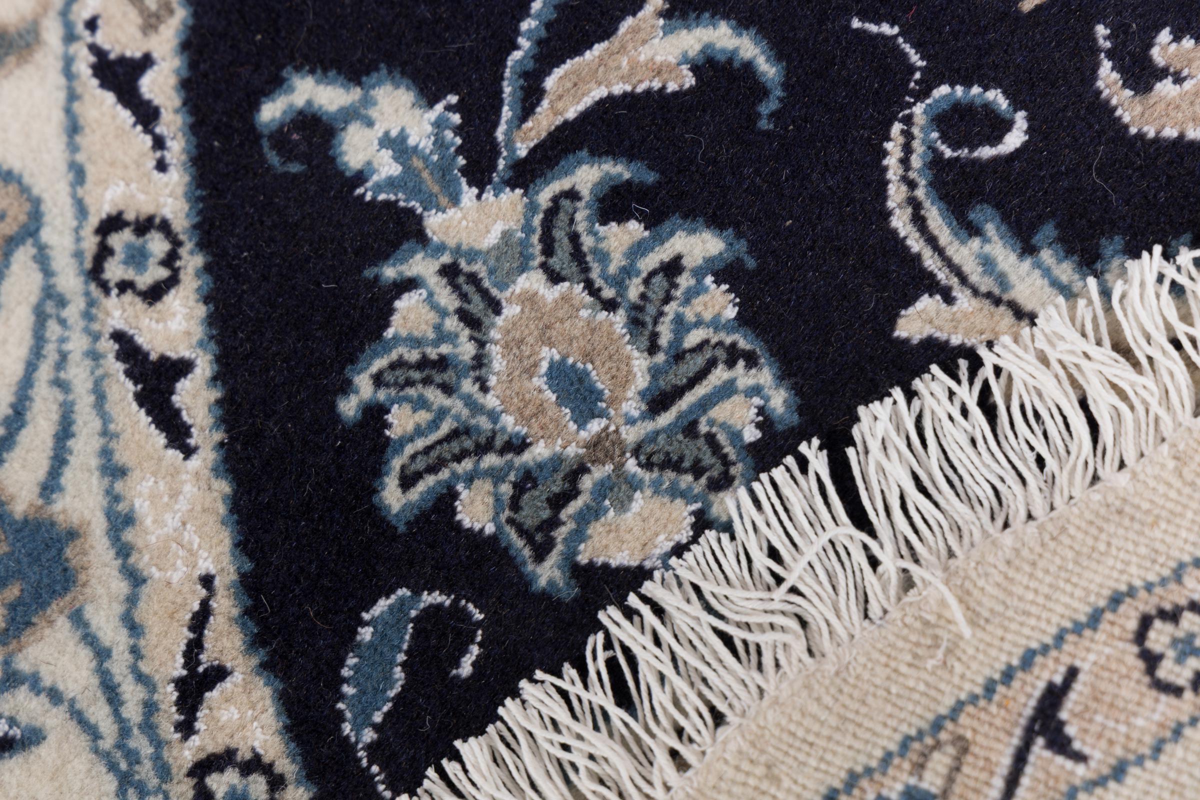 Esta alfombra Nain está clasificada como 12La. Tiene un aspecto elegante y refinado con su colorido típico de Naín. Esta alfombra persa fue anudada a mano en la ciudad de Naín, situada en el extremo occidental del desierto de Dasht-e-Kavir, con lana de alta calidad y seda natural. Con un tamaño de 12La, no está tan finamente detallada con ornamentos como una Nain 9La o 6La.