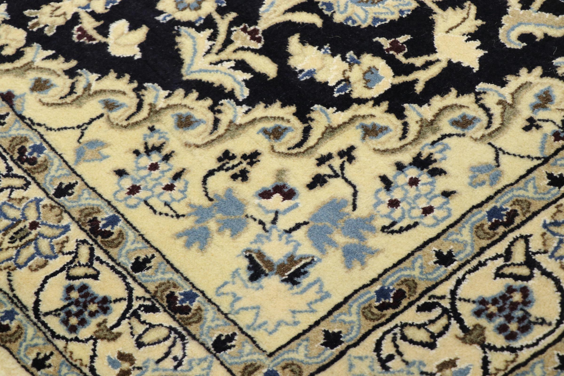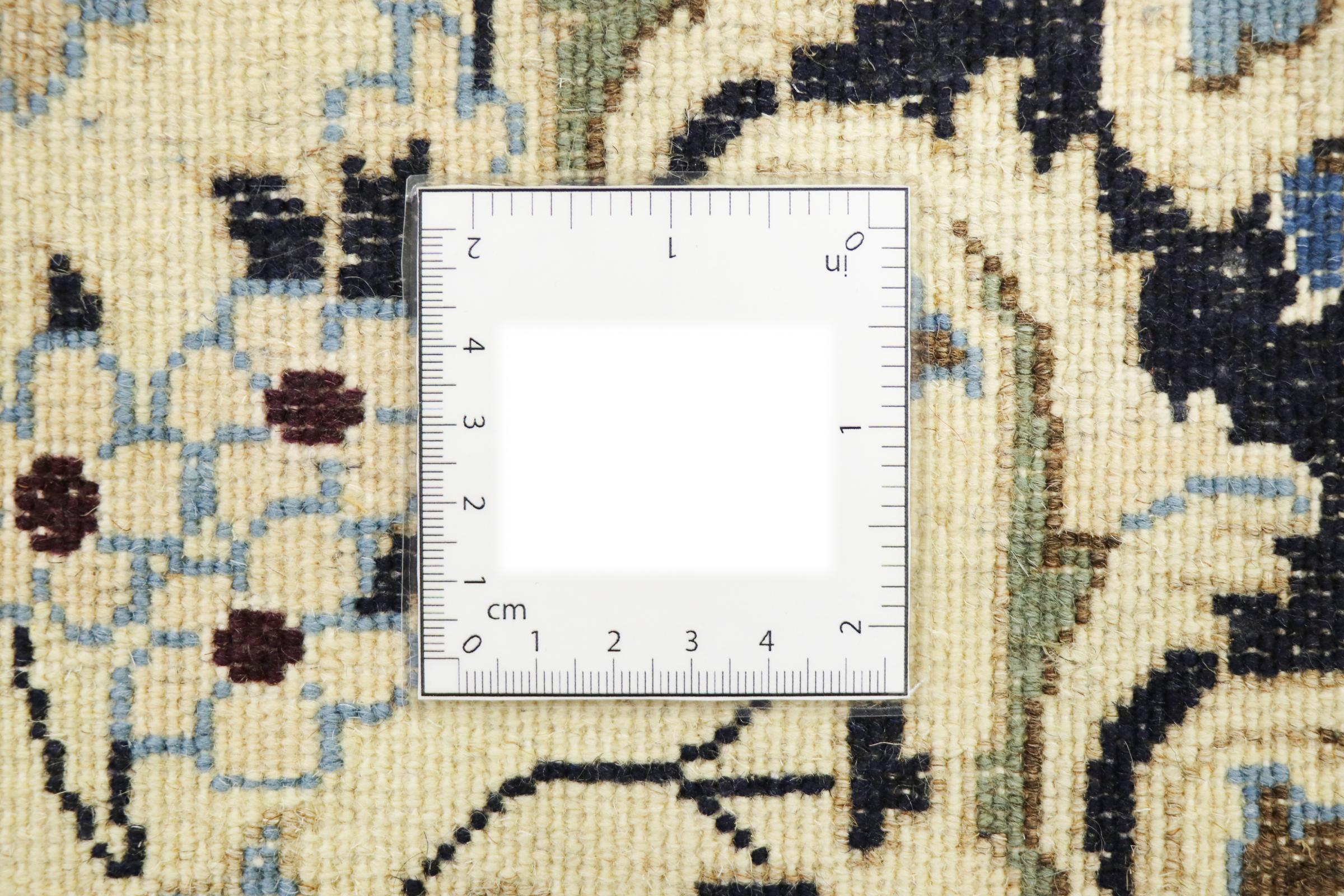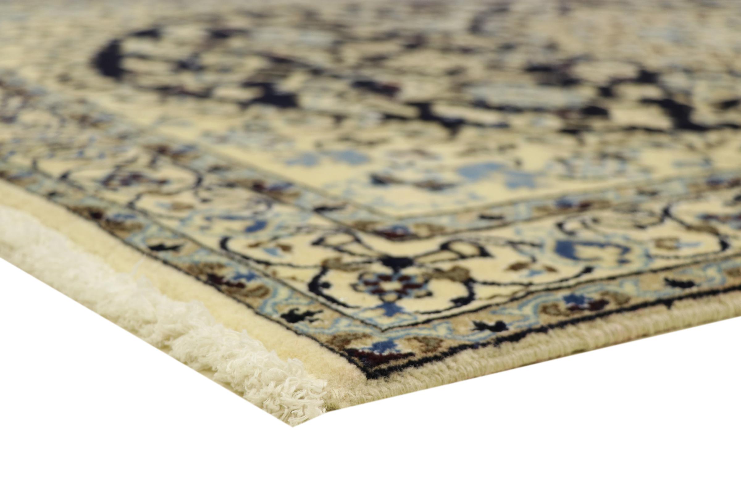 Esta alfombra Nain está clasificada como 12La. Tiene un aspecto elegante y refinado con su colorido típico de Naín. Esta alfombra persa fue anudada a mano en la ciudad de Naín, situada en el extremo occidental del desierto de Dasht-e-Kavir, con lana de alta calidad y seda natural. Con un tamaño de 12La, no está tan finamente detallada con ornamentos como una Nain 9La o 6La.