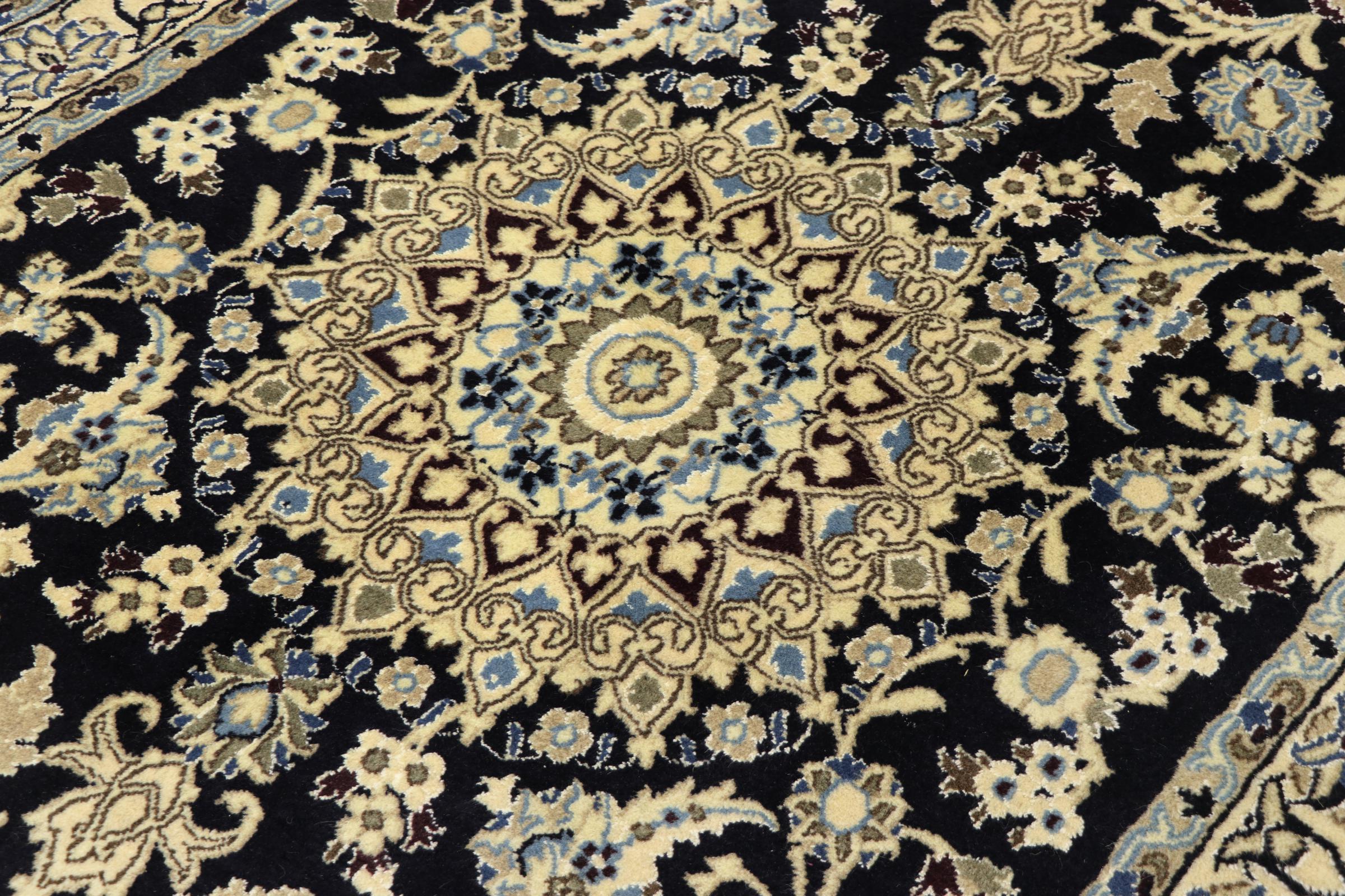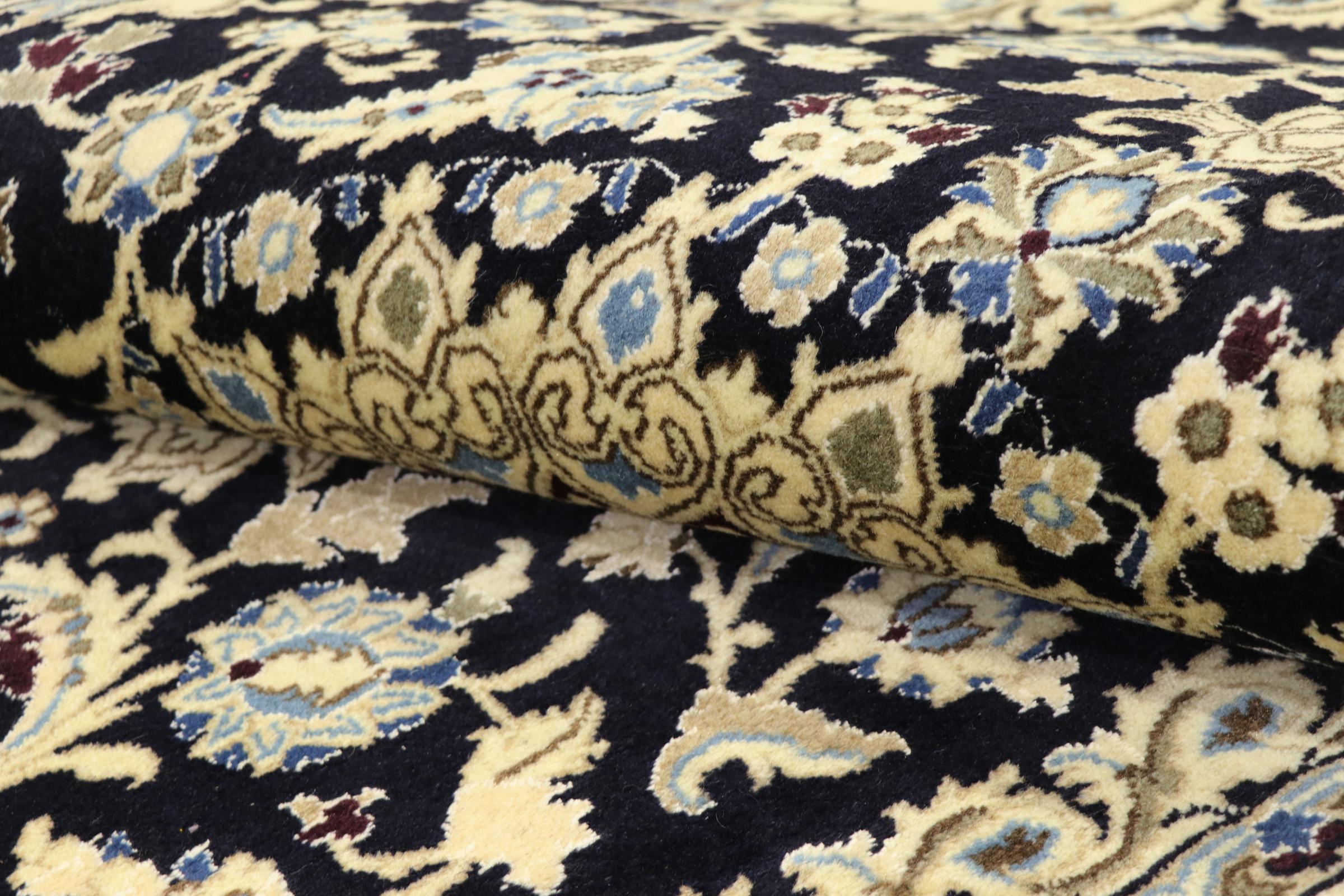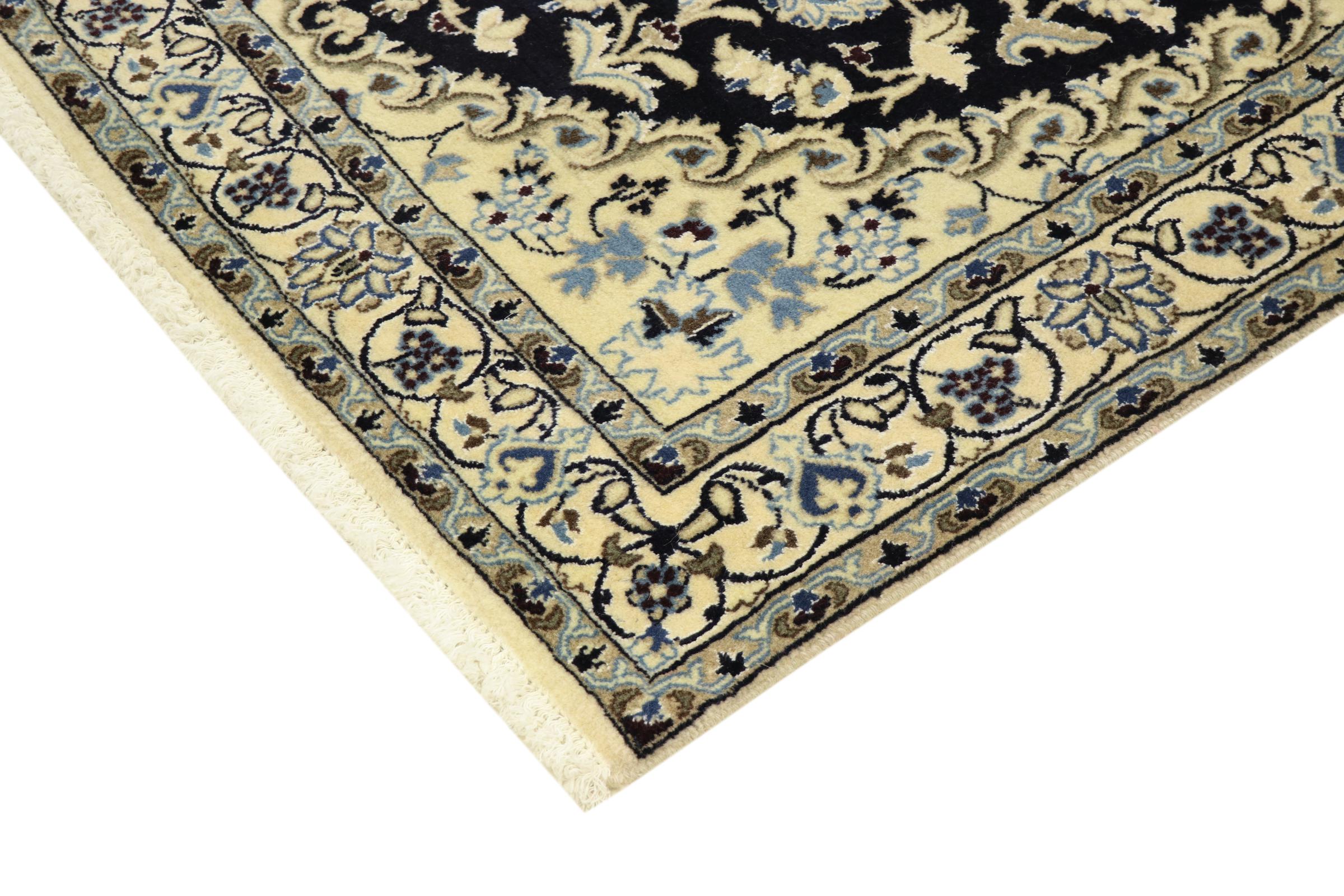 Esta alfombra Nain está clasificada como 12La. Tiene un aspecto elegante y refinado con su colorido típico de Naín. Esta alfombra persa fue anudada a mano en la ciudad de Naín, situada en el extremo occidental del desierto de Dasht-e-Kavir, con lana de alta calidad y seda natural. Con un tamaño de 12La, no está tan finamente detallada con ornamentos como una Nain 9La o 6La.