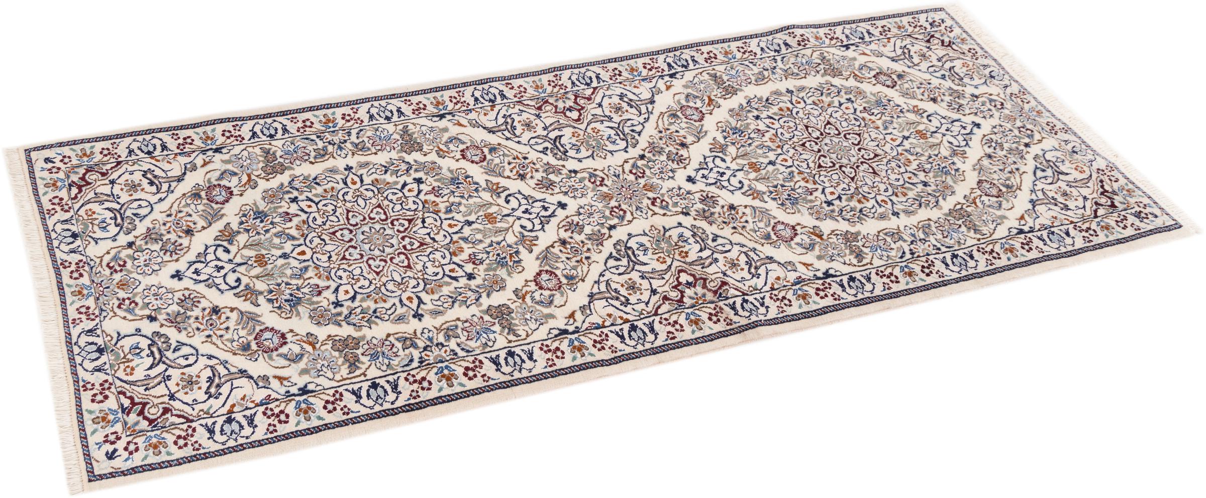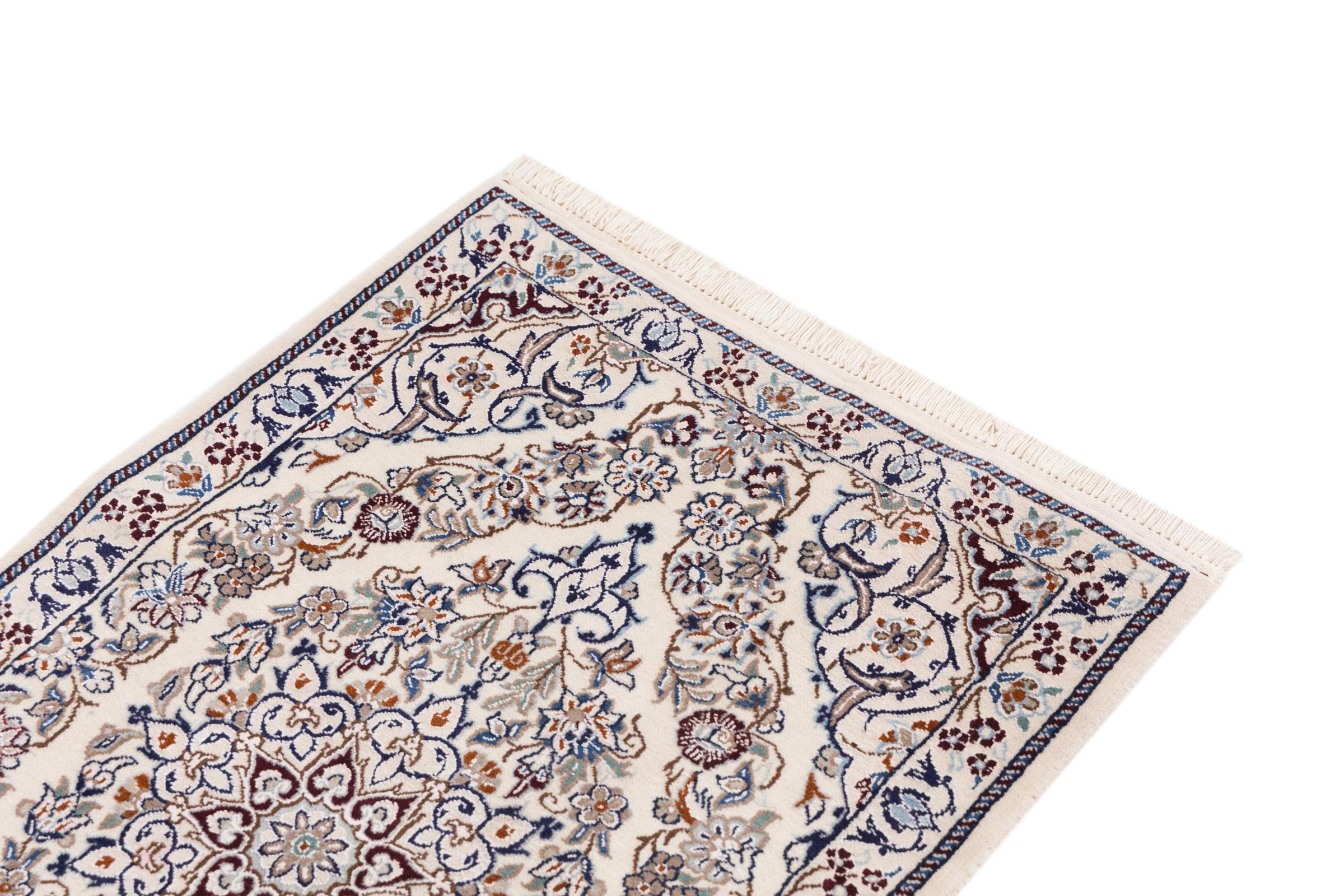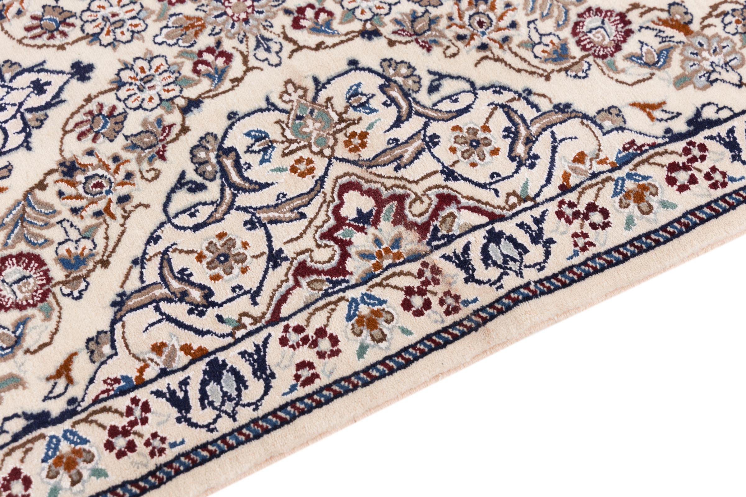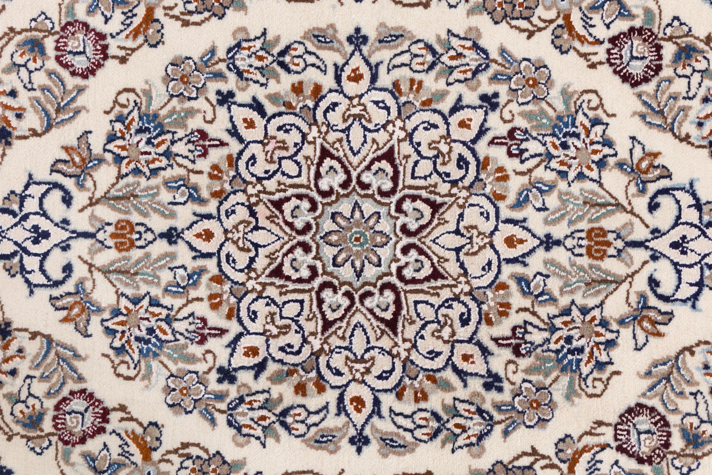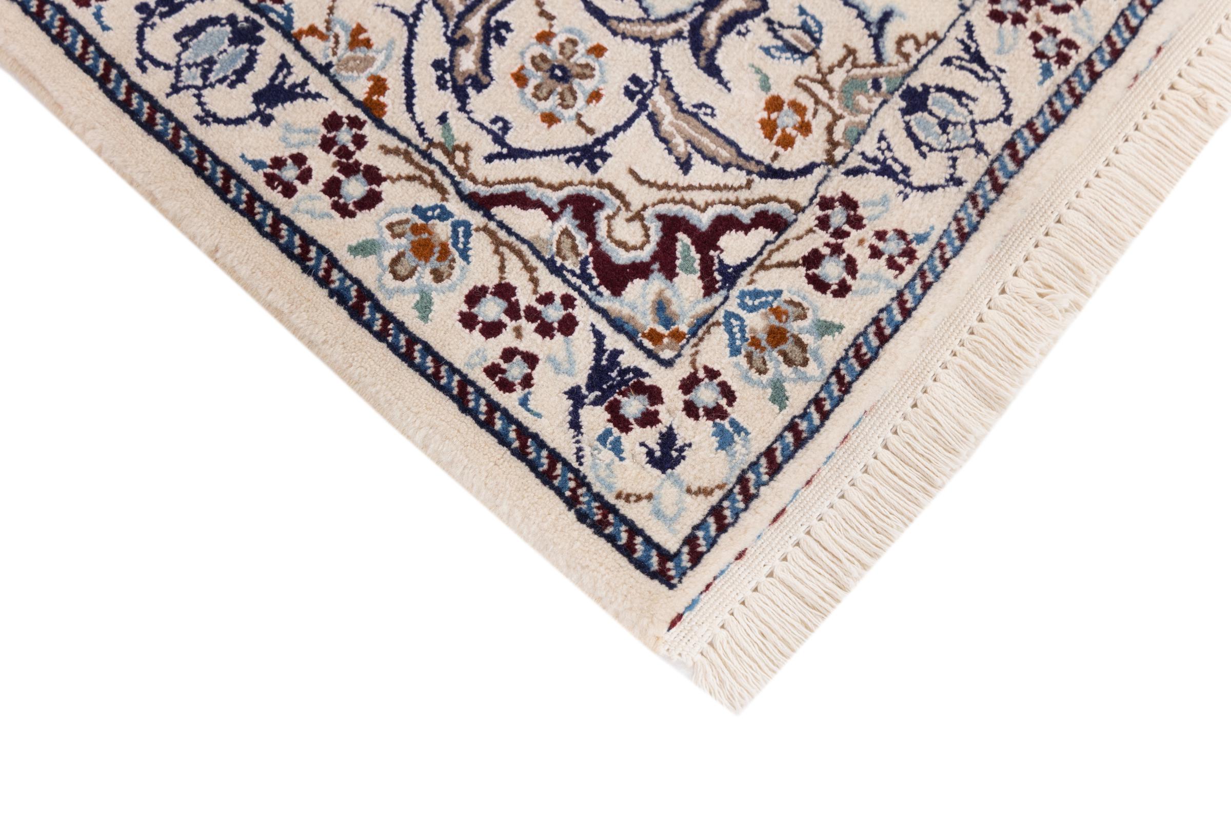 Esta alfombra Nain aporta una combinación perfecta de calidad, tradición y un diseño inconfundible. Fue elaborada en la ciudad de Nain, con lana de corcho de alta calidad y anudada a mano con seda natural. A los amantes de las valiosas alfombras iraníes les encantará esta alfombra persa. Con las alfombras Nain de la clasificación 6La y 4La no existe lugar para errores.