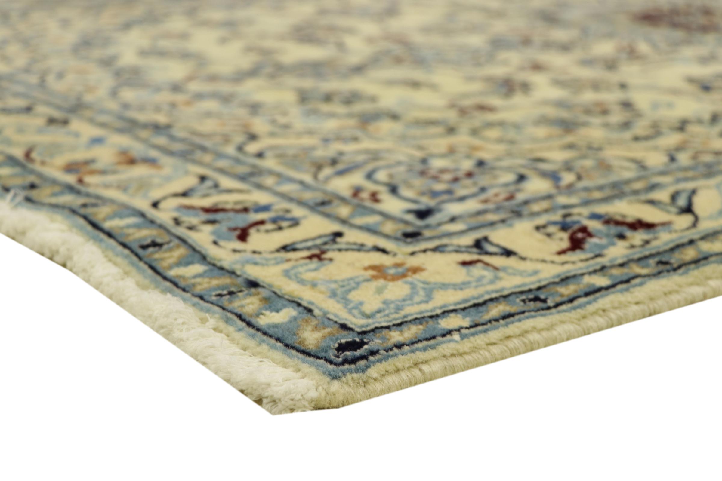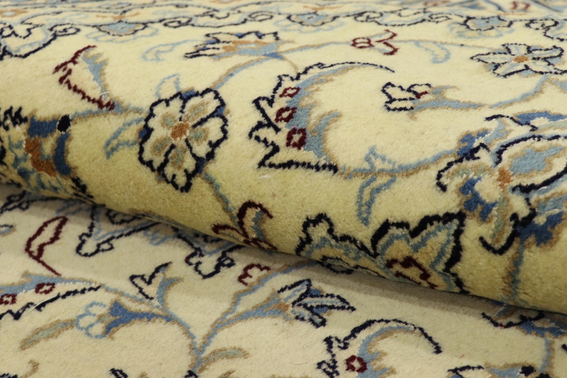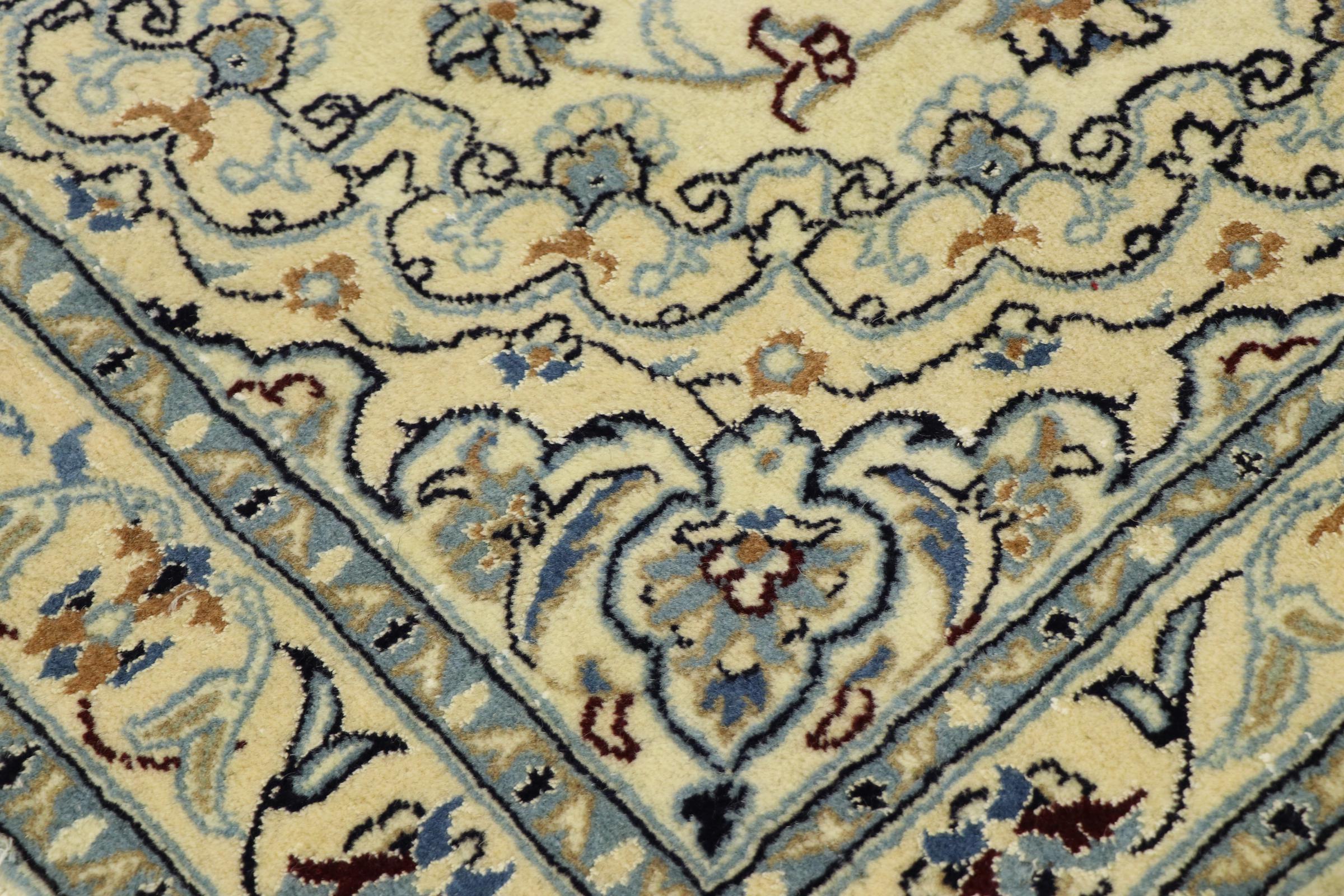 Esta alfombra Nain está clasificada como 12La. Tiene un aspecto elegante y refinado con su colorido típico de Naín. Esta alfombra persa fue anudada a mano en la ciudad de Naín, situada en el extremo occidental del desierto de Dasht-e-Kavir, con lana de alta calidad y seda natural. Con un tamaño de 12La, no está tan finamente detallada con ornamentos como una Nain 9La o 6La.