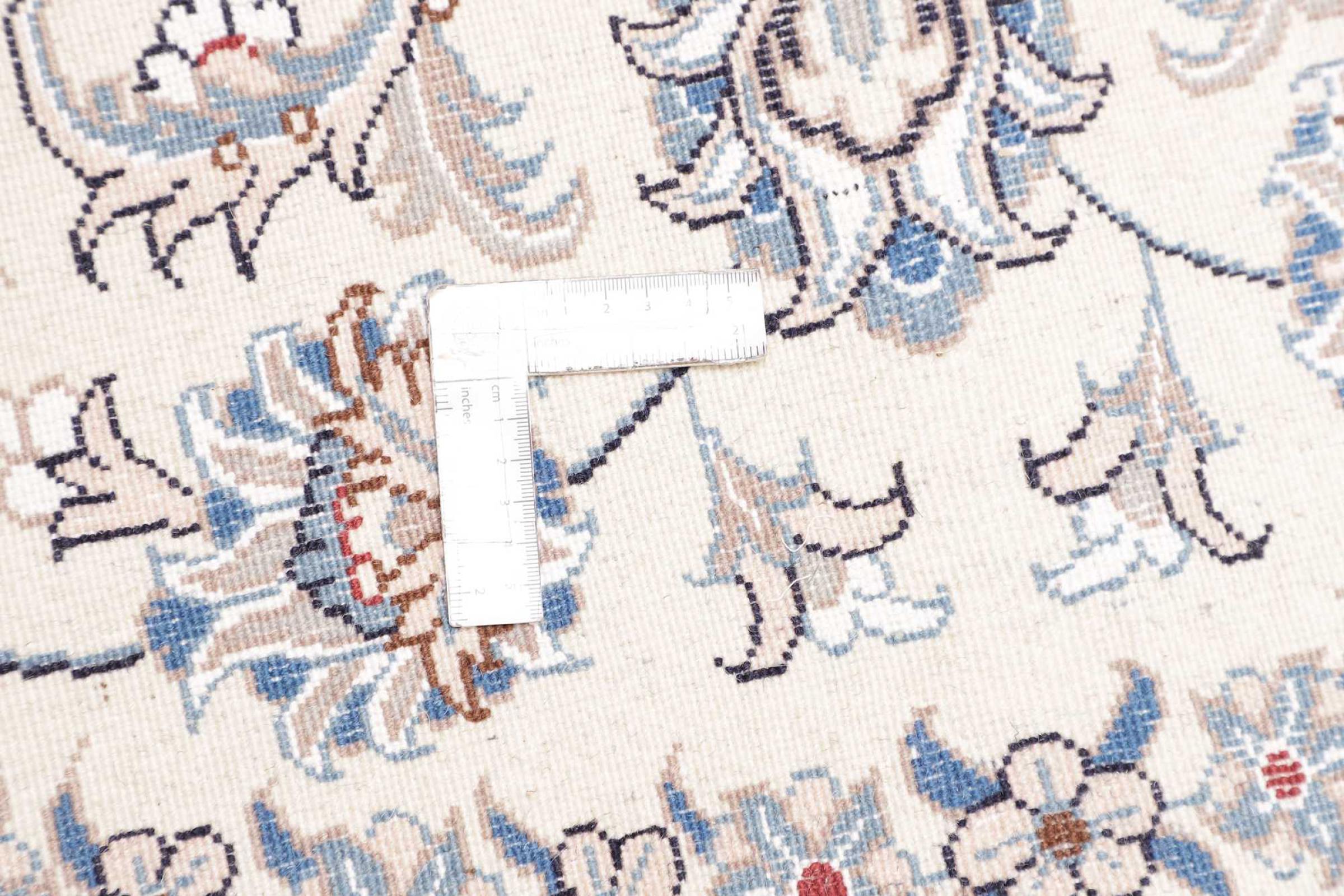 Esta alfombra Nain está clasificada como 12La. Tiene un aspecto elegante y refinado con su colorido típico de Naín. Esta alfombra persa fue anudada a mano en la ciudad de Naín, situada en el extremo occidental del desierto de Dasht-e-Kavir, con lana de alta calidad y seda natural. Con un tamaño de 12La, no está tan finamente detallada con ornamentos como una Nain 9La o 6La.