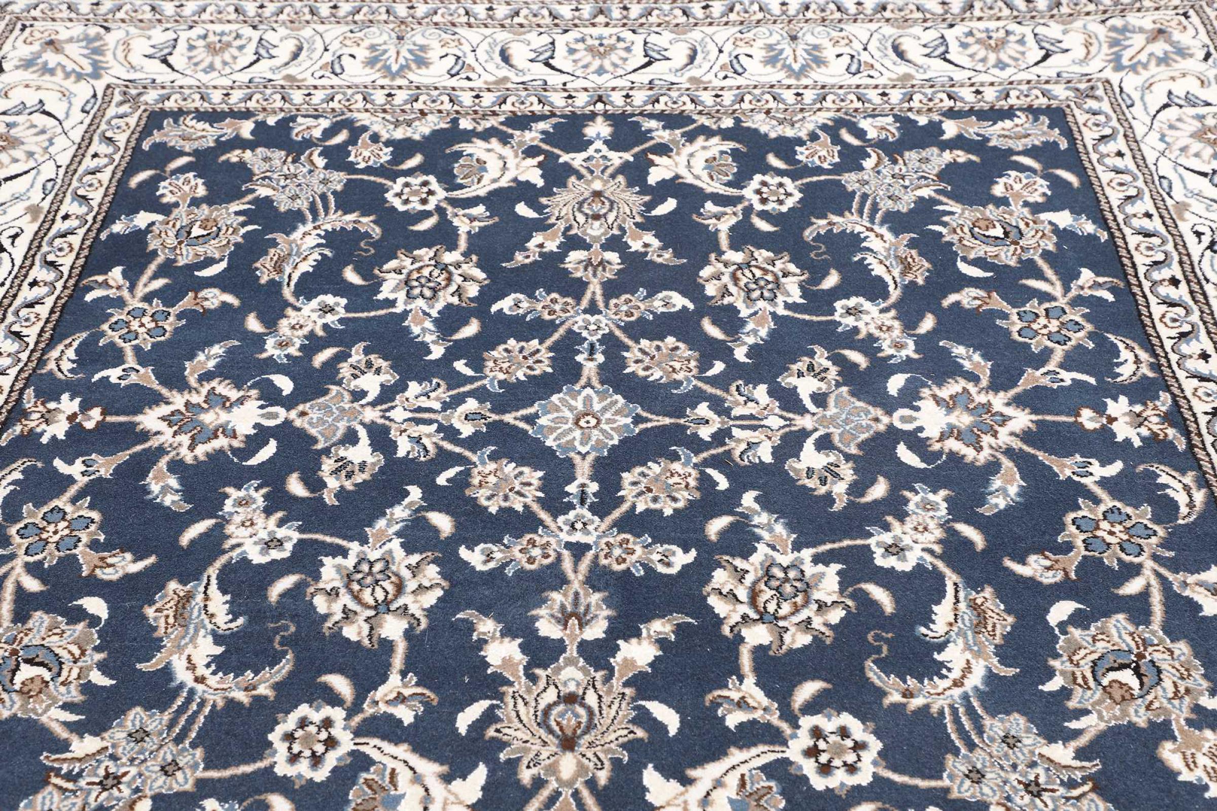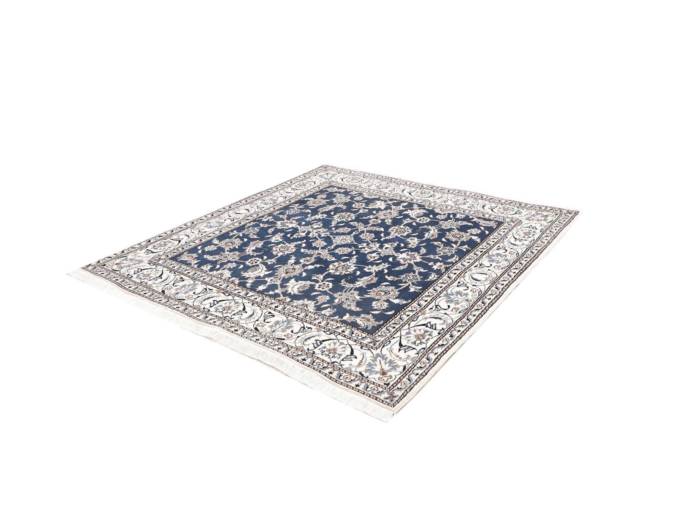 Esta alfombra Nain está clasificada como 12La. Tiene un aspecto elegante y refinado con su colorido típico de Naín. Esta alfombra persa fue anudada a mano en la ciudad de Naín, situada en el extremo occidental del desierto de Dasht-e-Kavir, con lana de alta calidad y seda natural. Con un tamaño de 12La, no está tan finamente detallada con ornamentos como una Nain 9La o 6La.