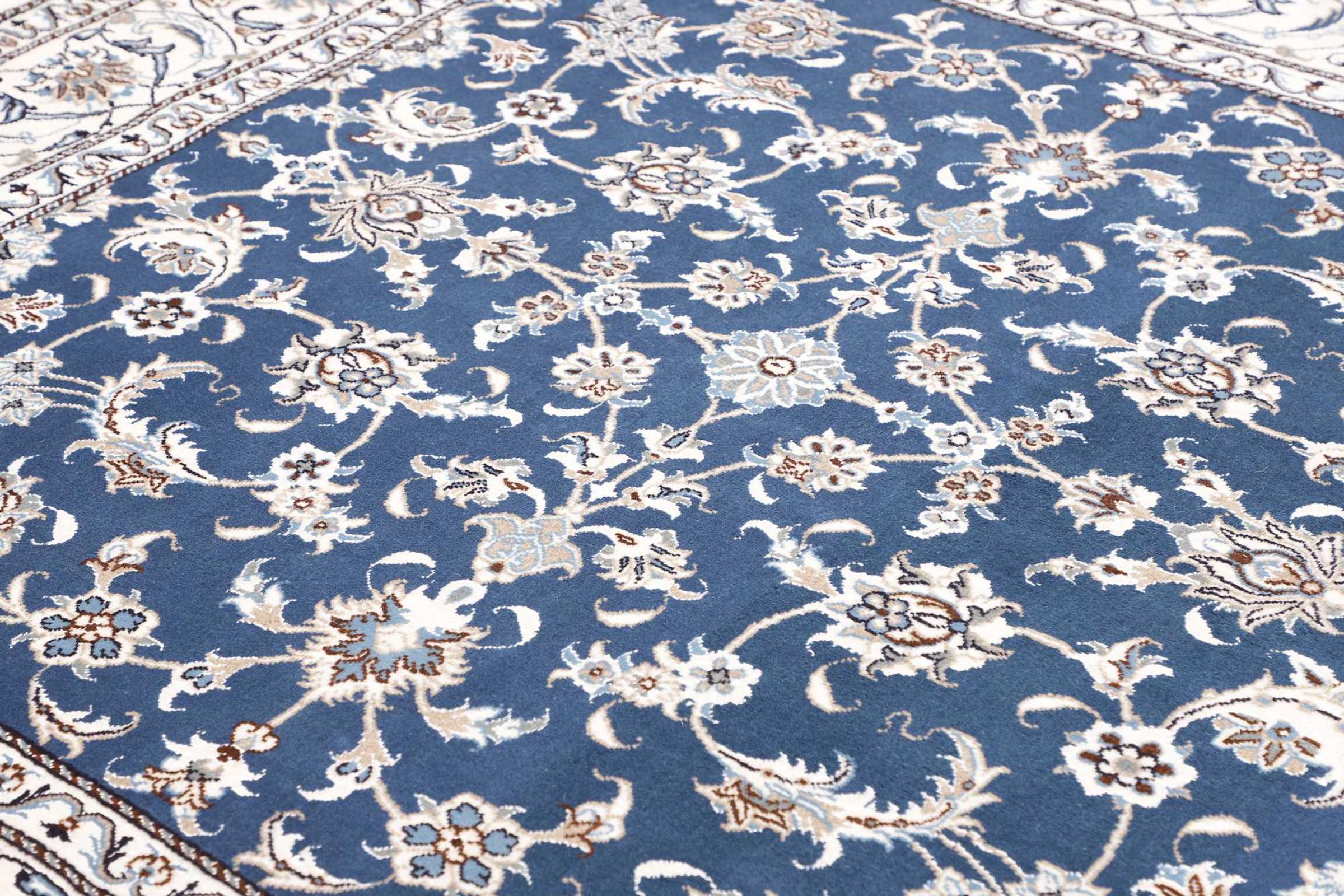 Esta alfombra Nain está clasificada como 12La. Tiene un aspecto elegante y refinado con su colorido típico de Naín. Esta alfombra persa fue anudada a mano en la ciudad de Naín, situada en el extremo occidental del desierto de Dasht-e-Kavir, con lana de alta calidad y seda natural. Con un tamaño de 12La, no está tan finamente detallada con ornamentos como una Nain 9La o 6La.