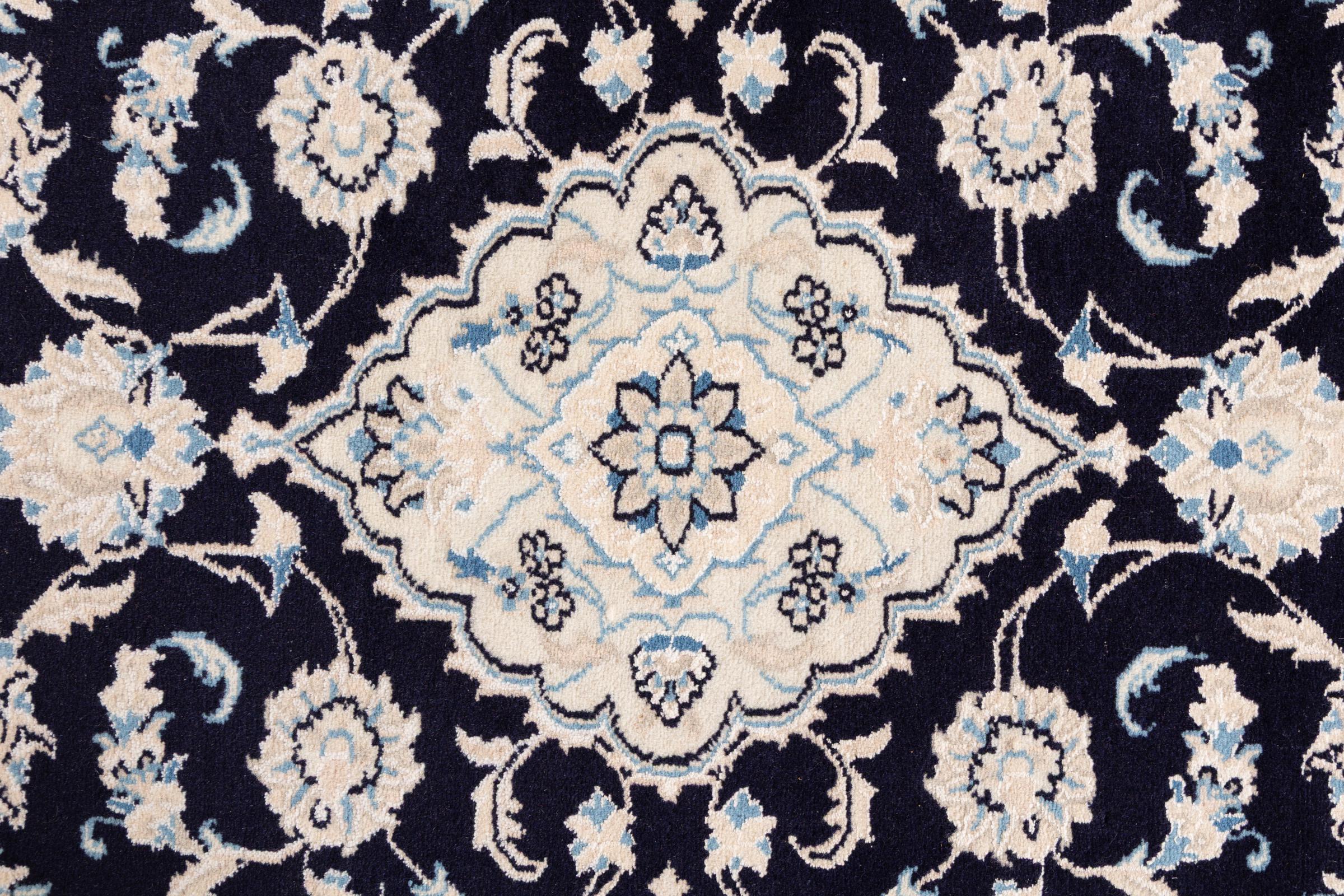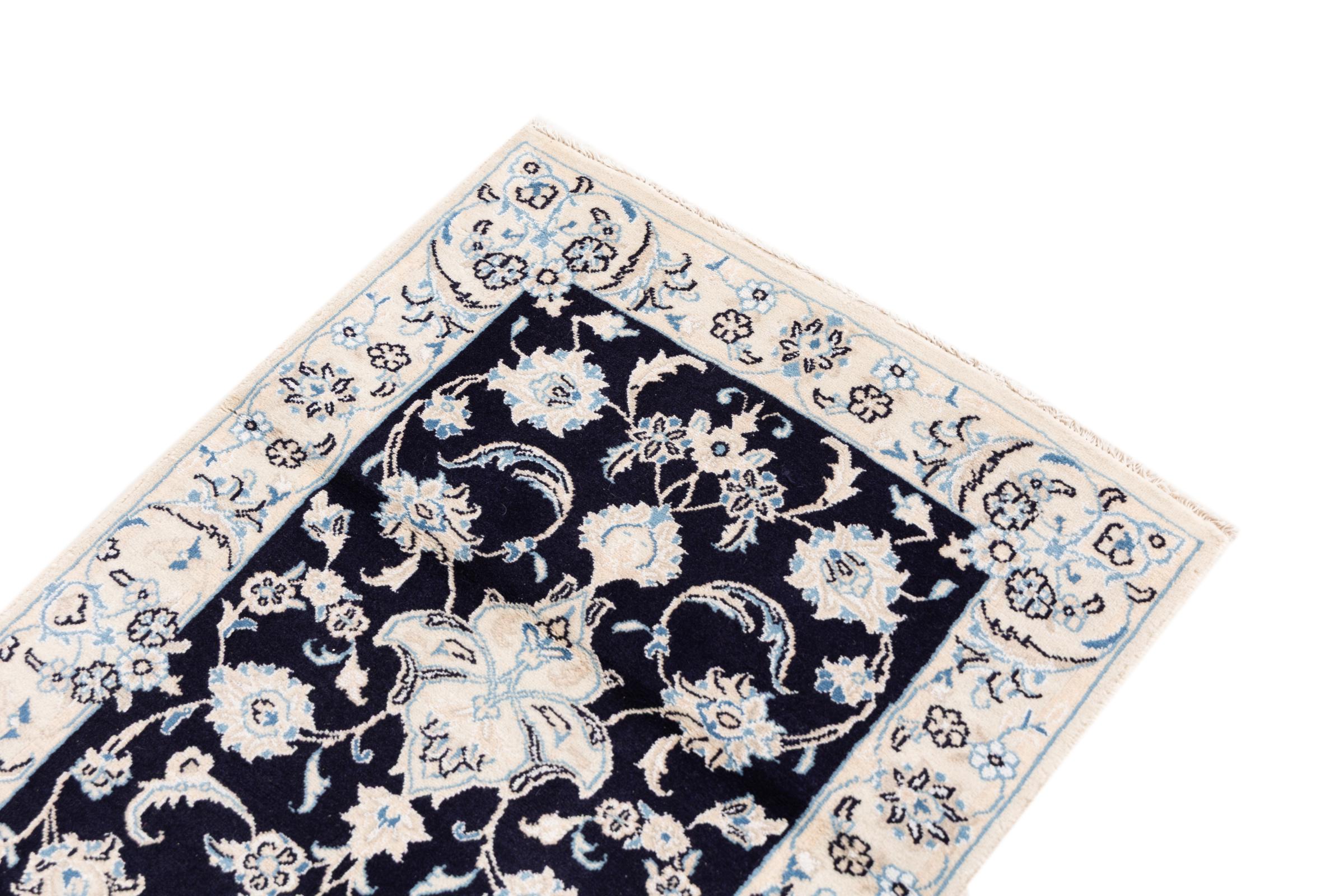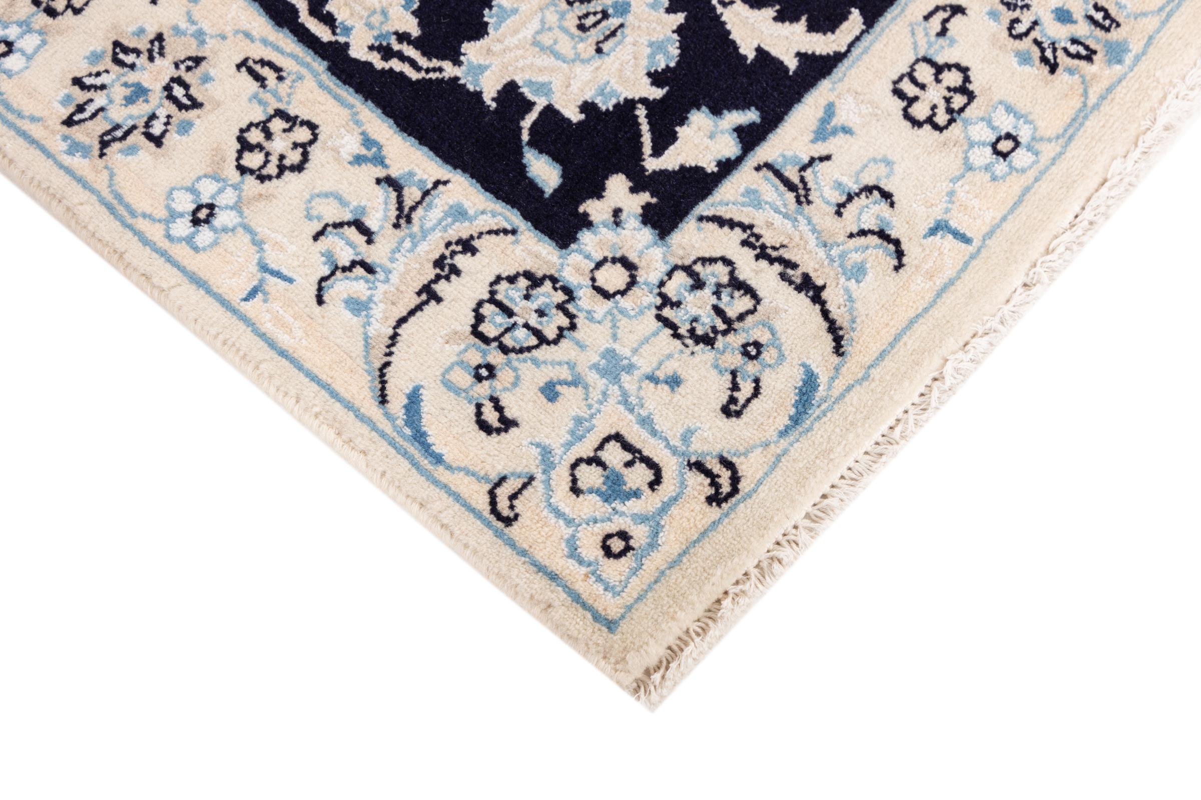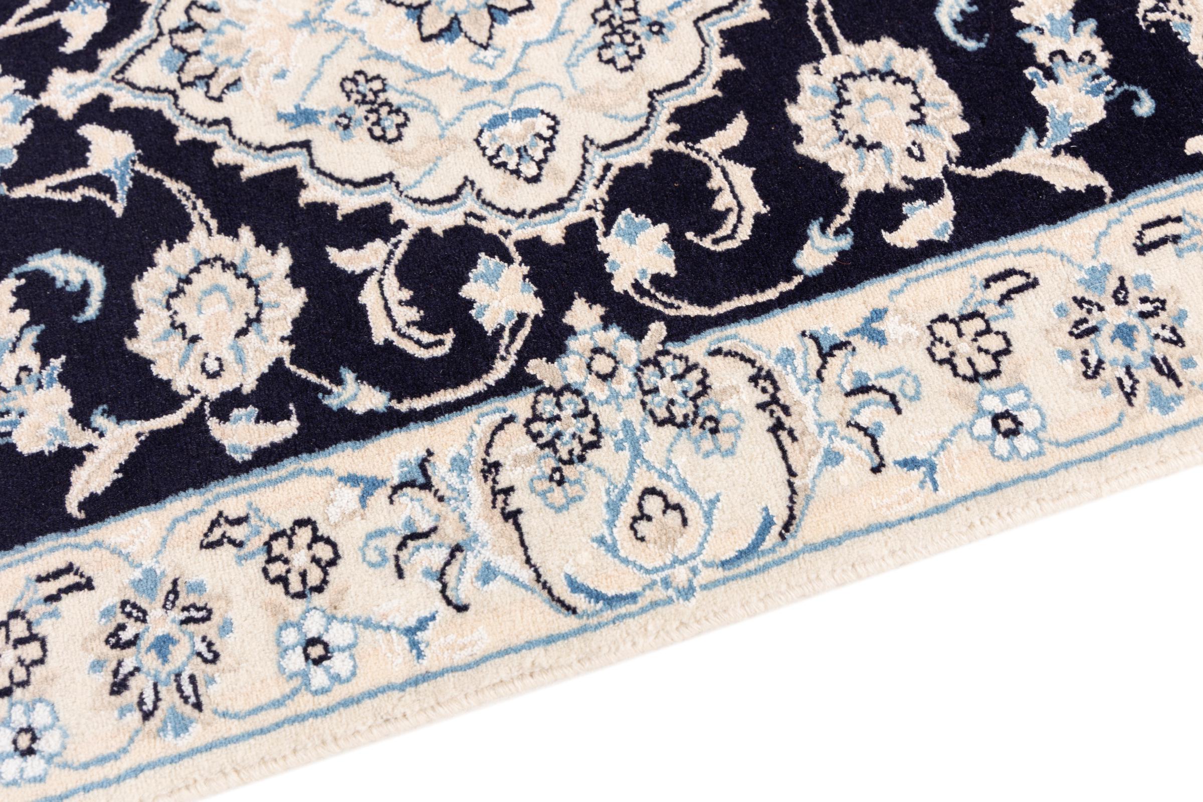 Esta alfombra Nain está clasificada como 9La. Su excelente calidad y su bello diseño oriental con motivos curvilíneos harán las delicias de cualquier comprador. Esta alfombra persa fue anudada a mano en la ciudad de Nain, situada en el extremo occidental del desierto de Dasht-e-Kavir, con lana de alta calidad y seda natural. Las alfombras Nain 9La son claramente más finas que las 12La y ya muestran bellos detalles.