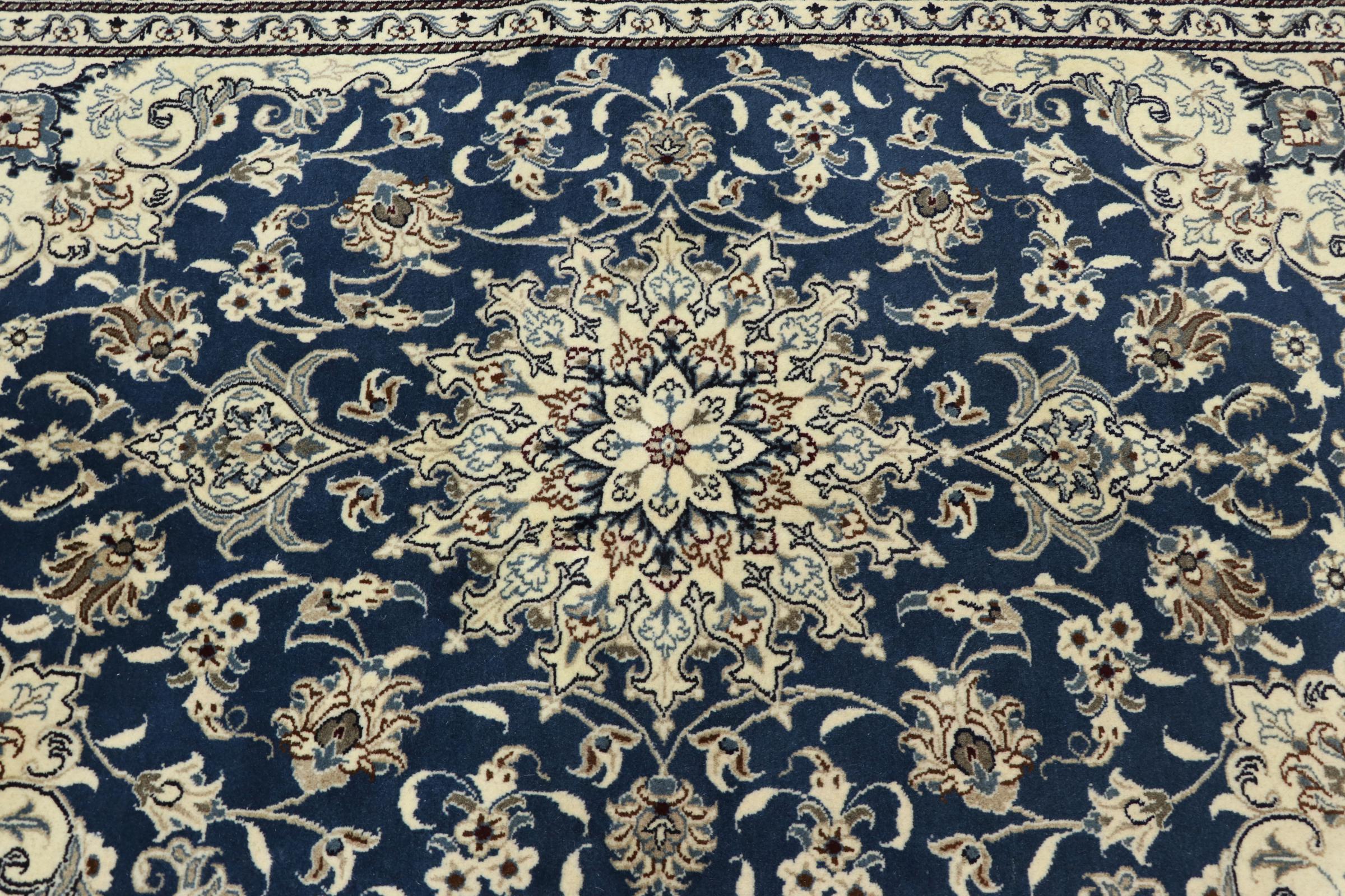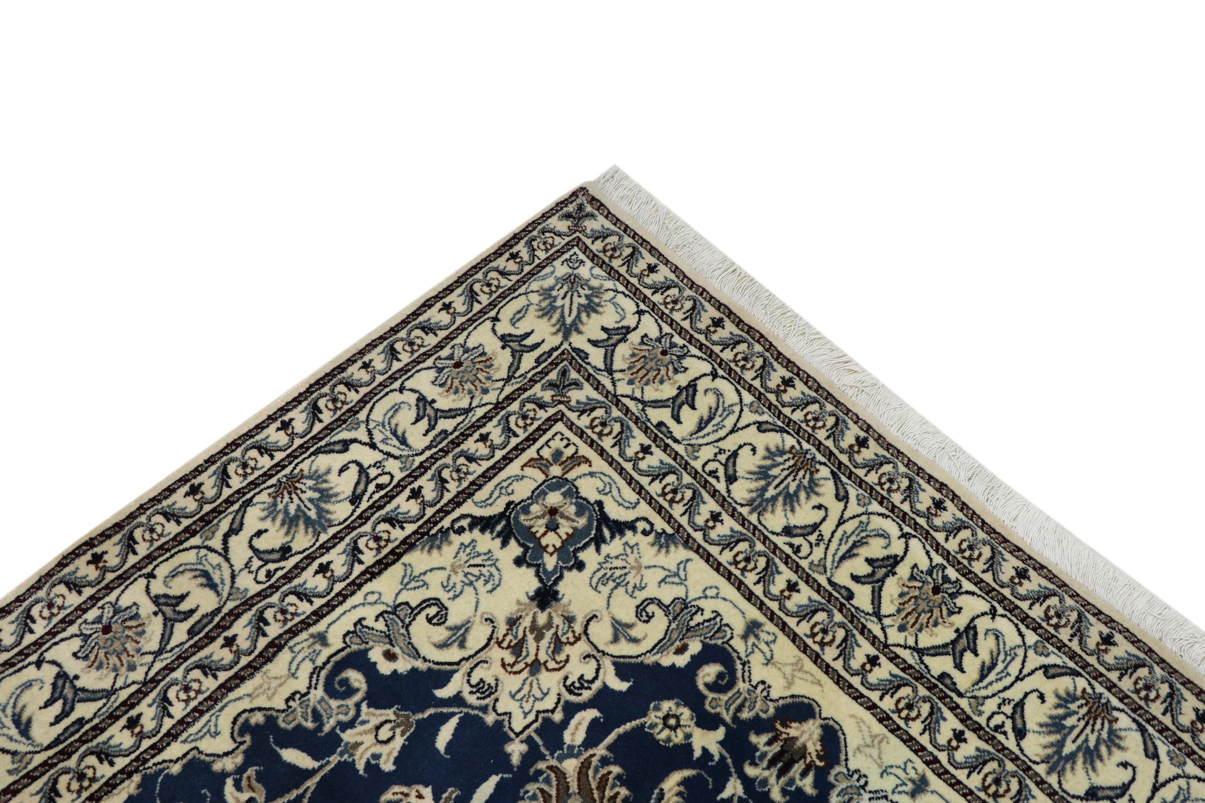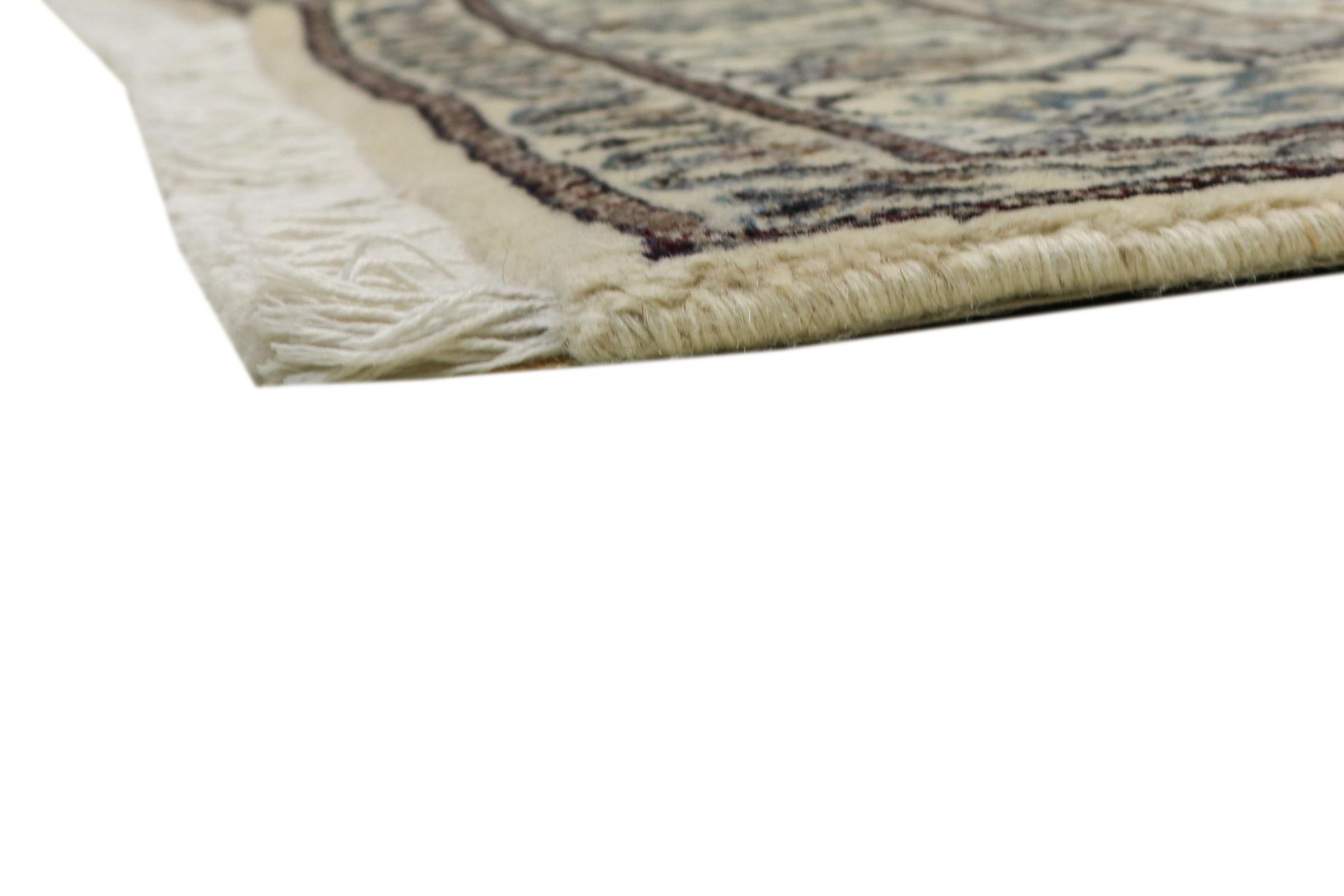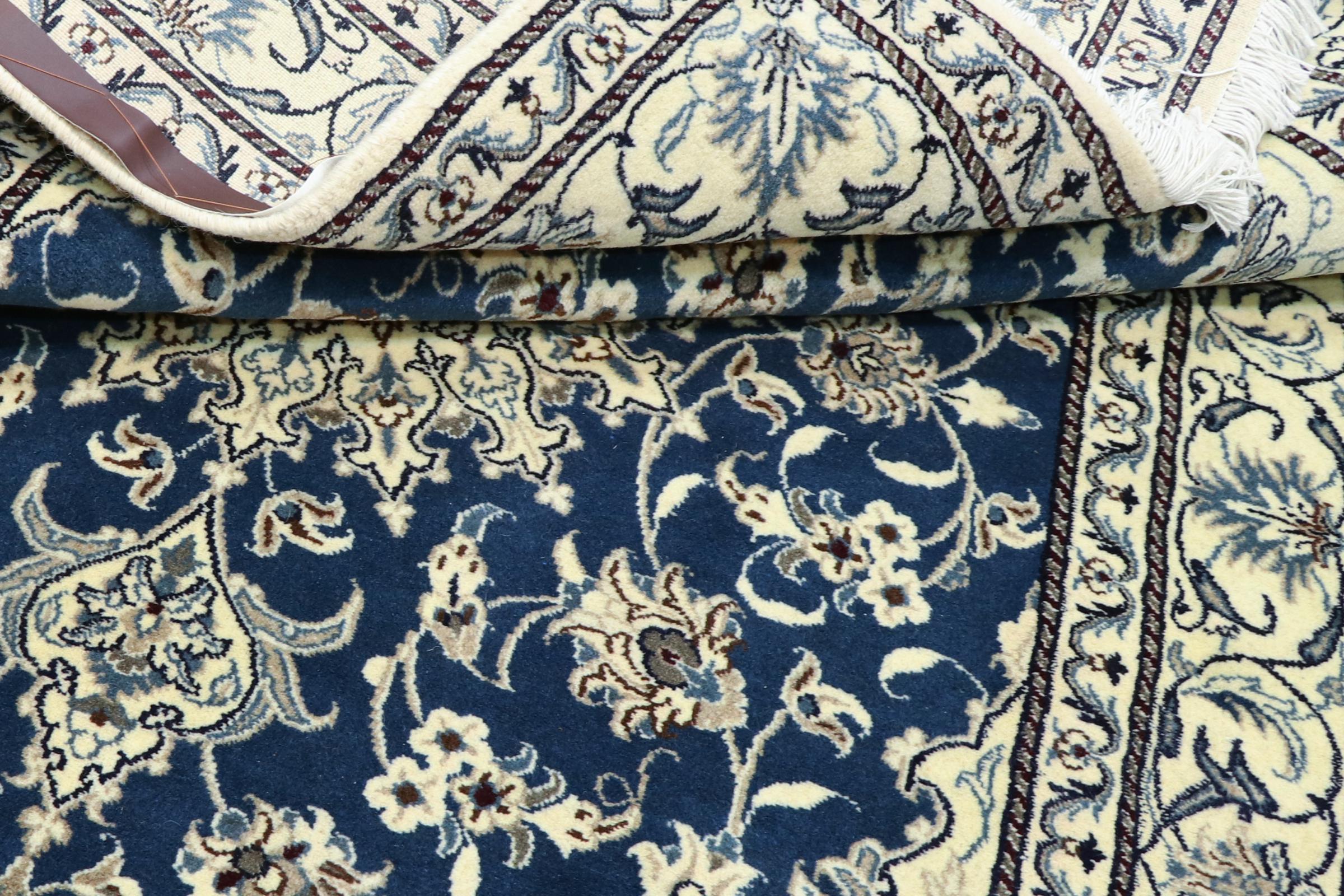 Esta alfombra Nain está clasificada como 12La. Tiene un aspecto elegante y refinado con su colorido típico de Naín. Esta alfombra persa fue anudada a mano en la ciudad de Naín, situada en el extremo occidental del desierto de Dasht-e-Kavir, con lana de alta calidad y seda natural. Con un tamaño de 12La, no está tan finamente detallada con ornamentos como una Nain 9La o 6La.