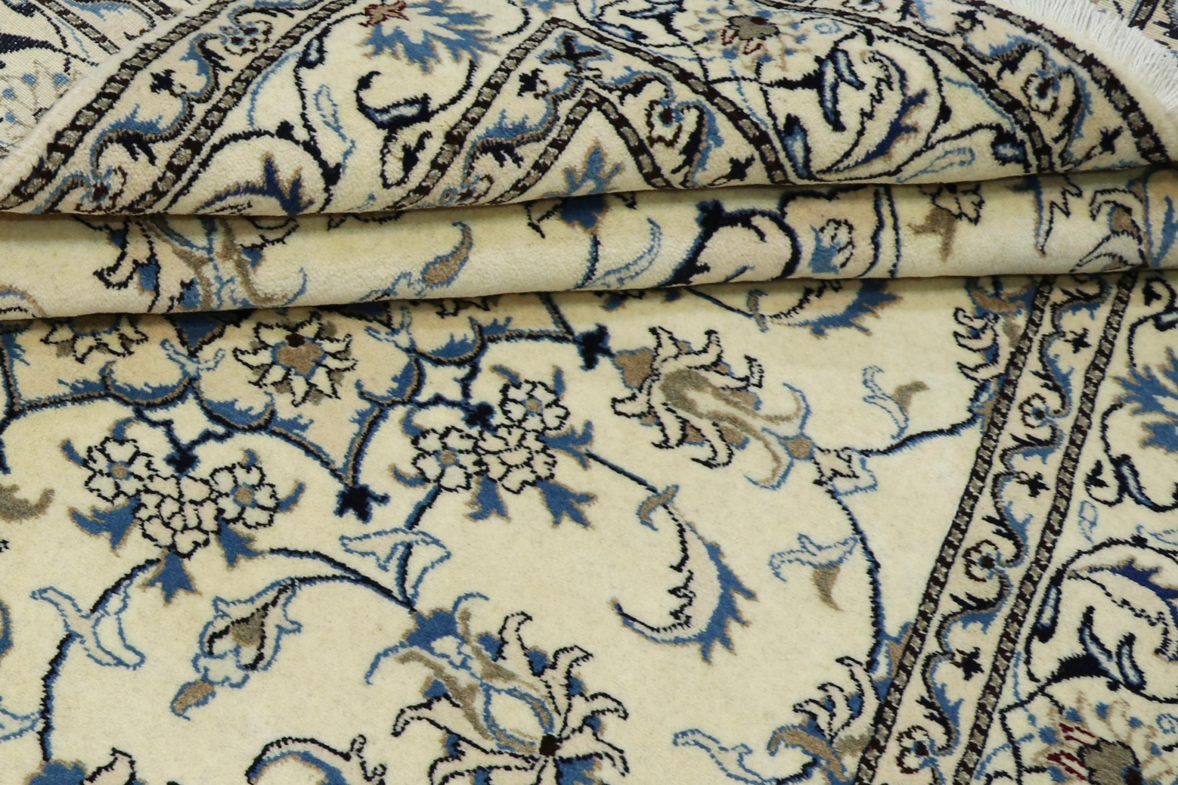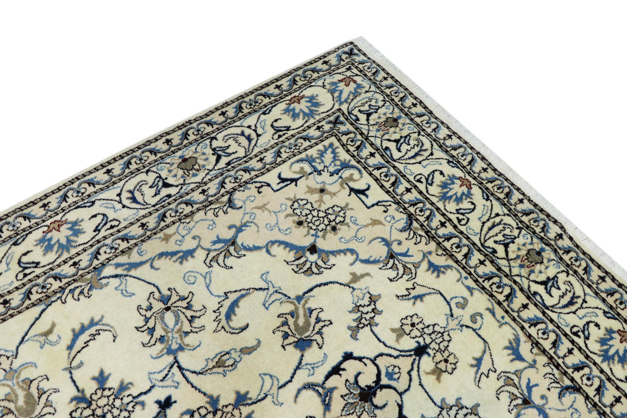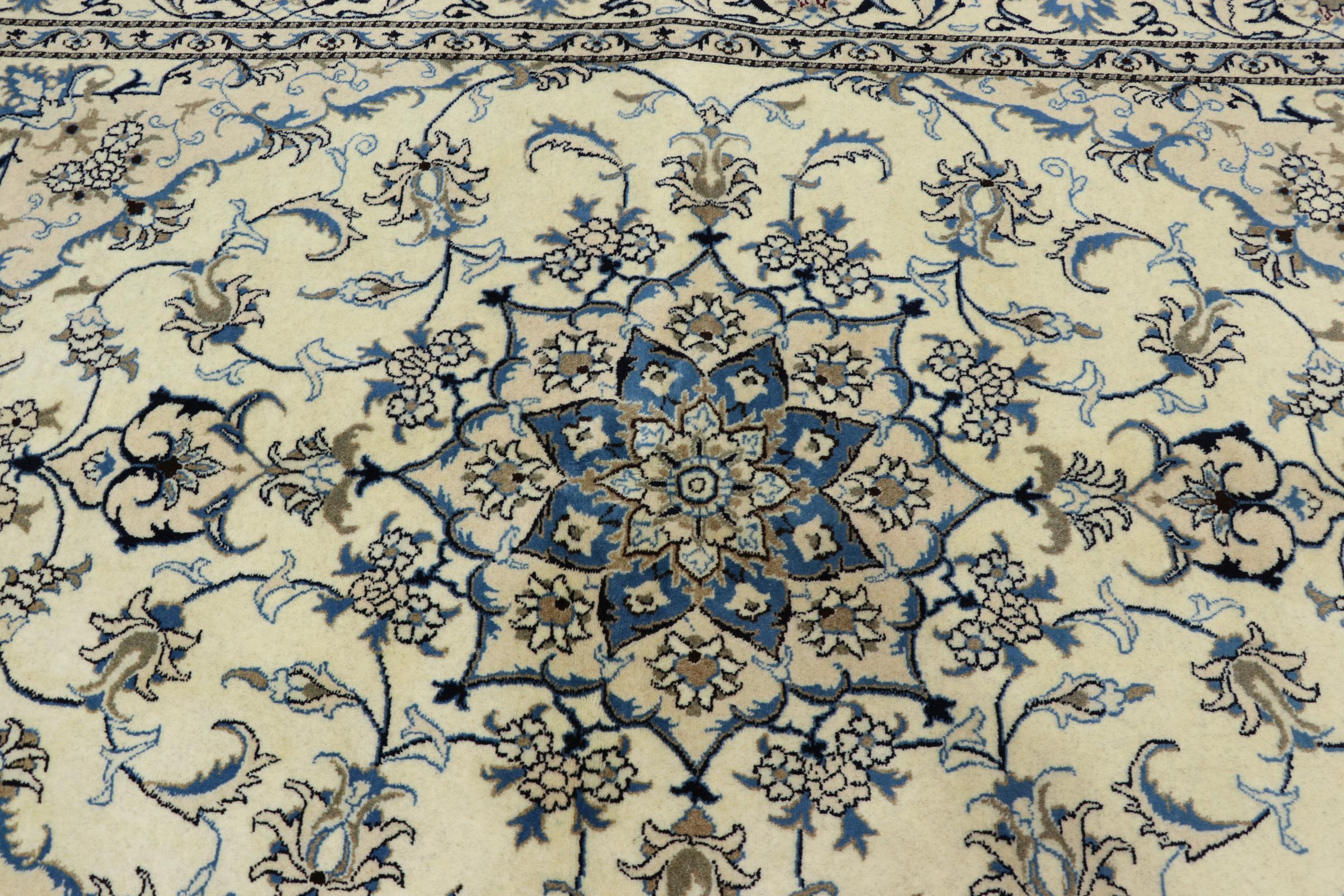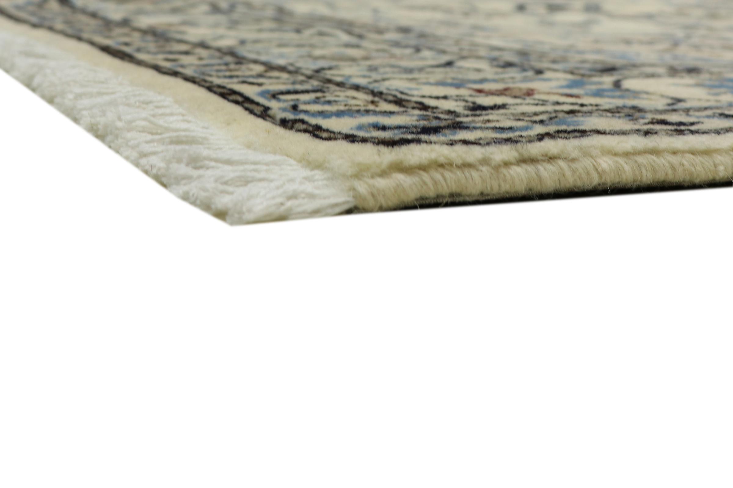 Esta alfombra Nain está clasificada como 12La. Tiene un aspecto elegante y refinado con su colorido típico de Naín. Esta alfombra persa fue anudada a mano en la ciudad de Naín, situada en el extremo occidental del desierto de Dasht-e-Kavir, con lana de alta calidad y seda natural. Con un tamaño de 12La, no está tan finamente detallada con ornamentos como una Nain 9La o 6La.