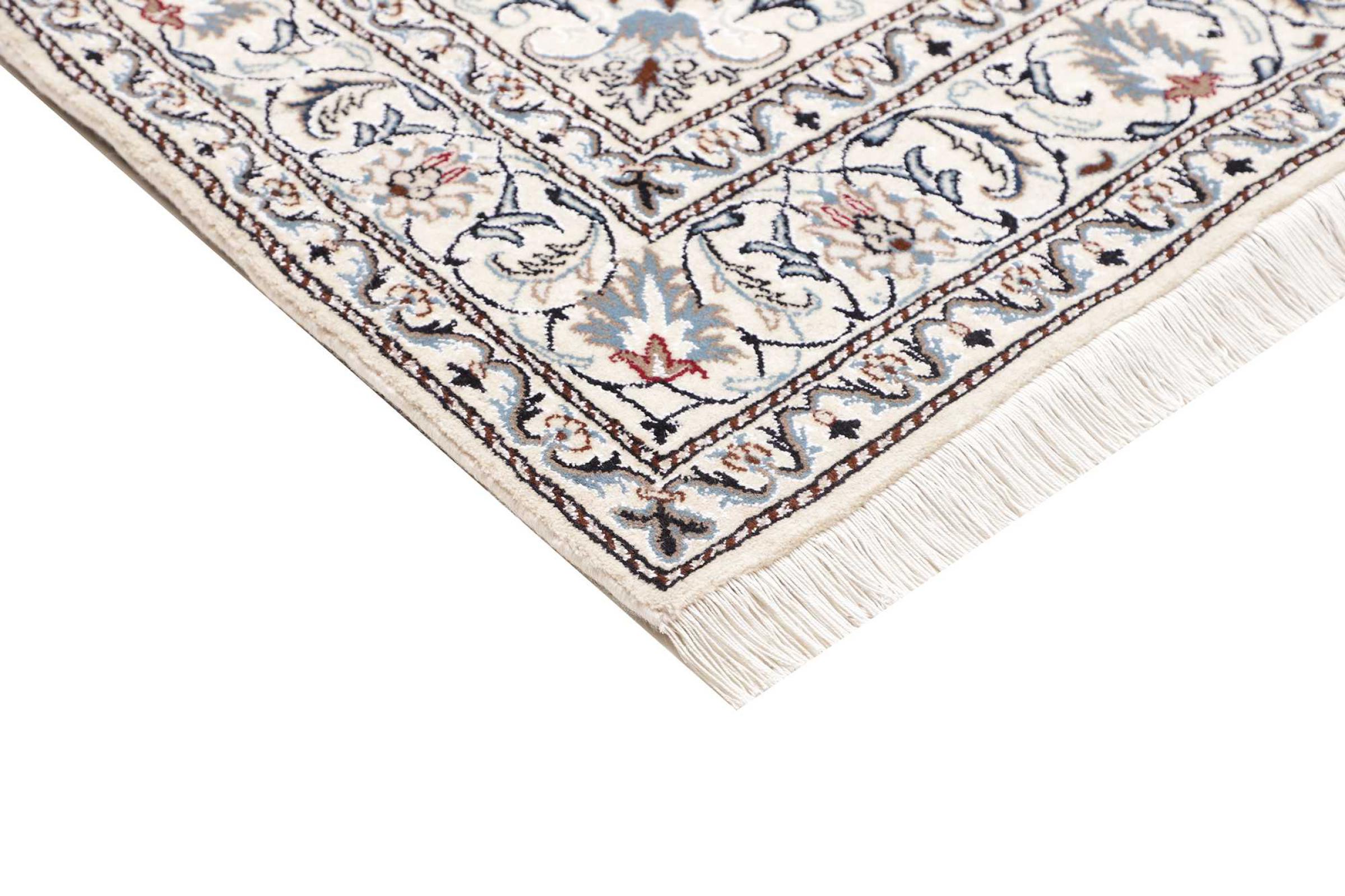 Esta alfombra Nain está clasificada como 12La. Tiene un aspecto elegante y refinado con su colorido típico de Naín. Esta alfombra persa fue anudada a mano en la ciudad de Naín, situada en el extremo occidental del desierto de Dasht-e-Kavir, con lana de alta calidad y seda natural. Con un tamaño de 12La, no está tan finamente detallada con ornamentos como una Nain 9La o 6La.