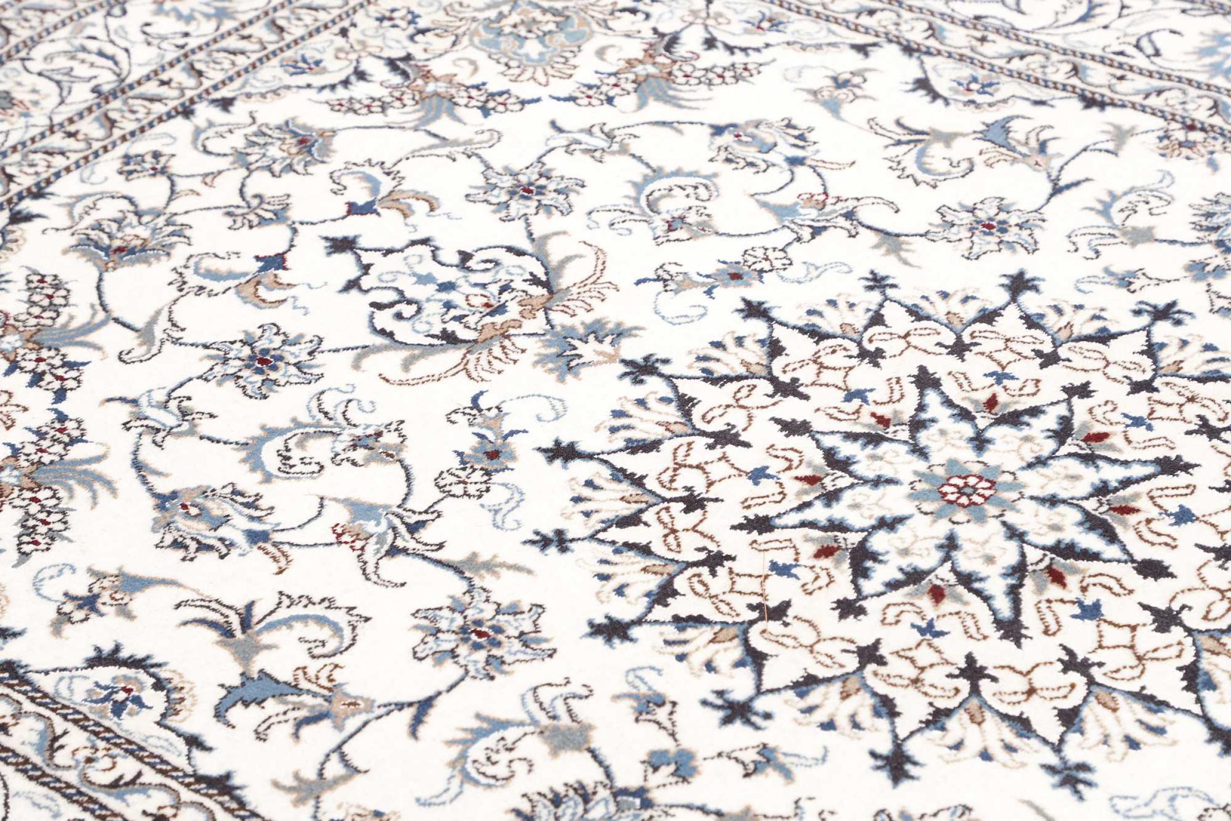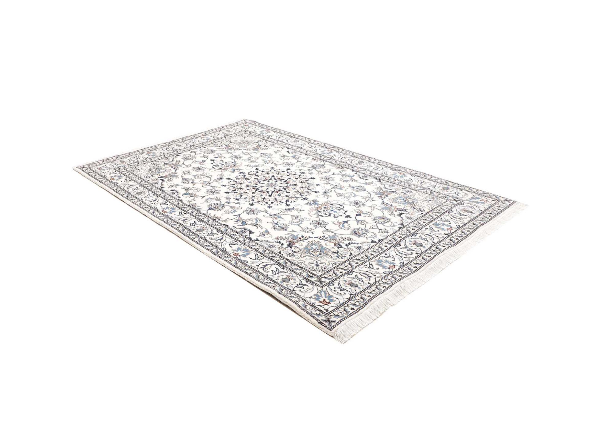 Esta alfombra Nain está clasificada como 12La. Tiene un aspecto elegante y refinado con su colorido típico de Naín. Esta alfombra persa fue anudada a mano en la ciudad de Naín, situada en el extremo occidental del desierto de Dasht-e-Kavir, con lana de alta calidad y seda natural. Con un tamaño de 12La, no está tan finamente detallada con ornamentos como una Nain 9La o 6La.