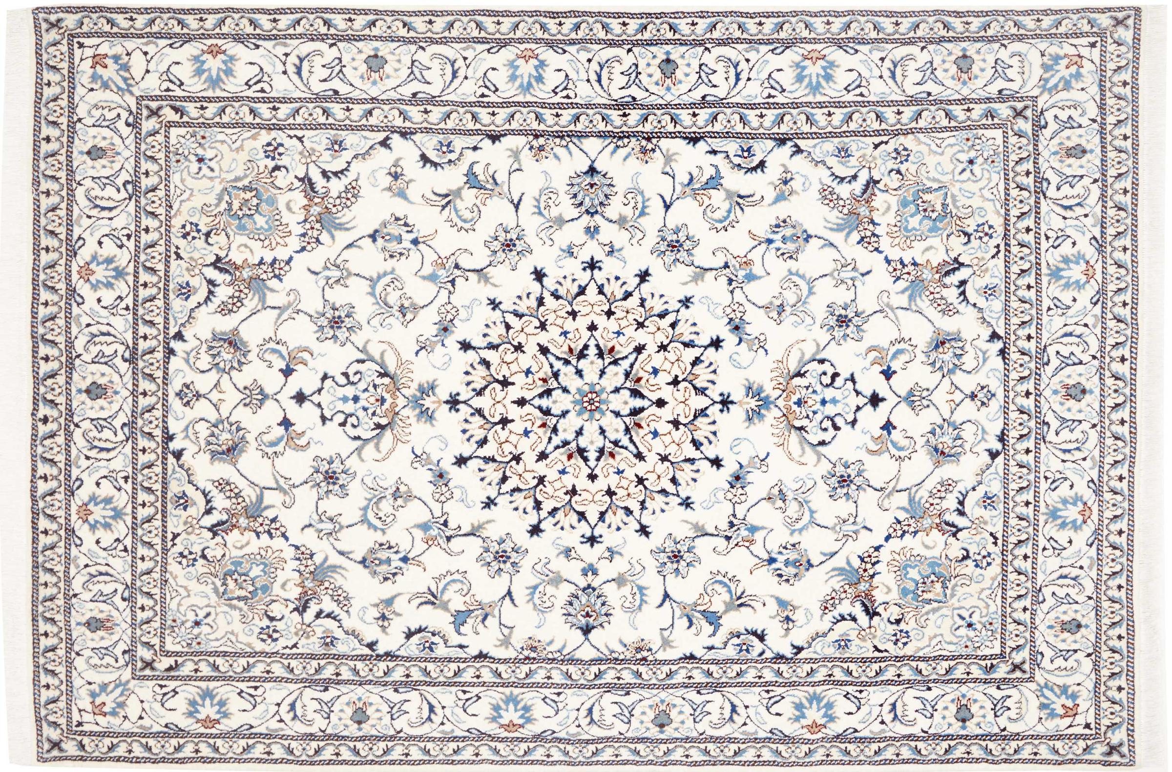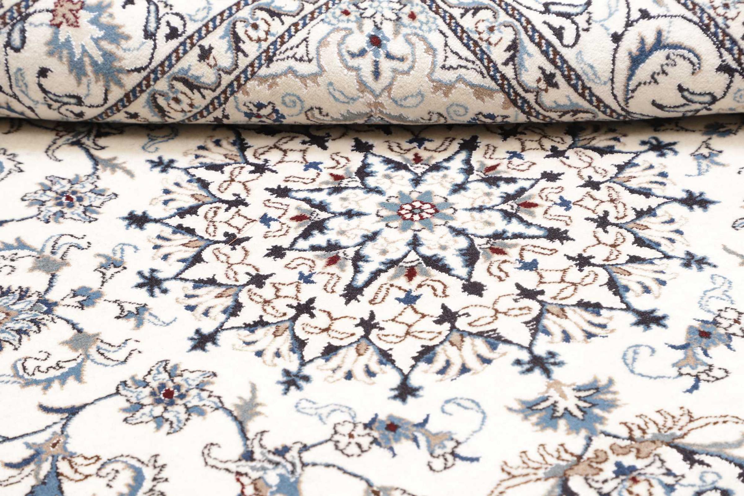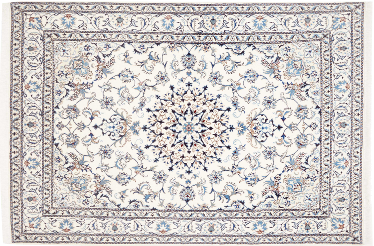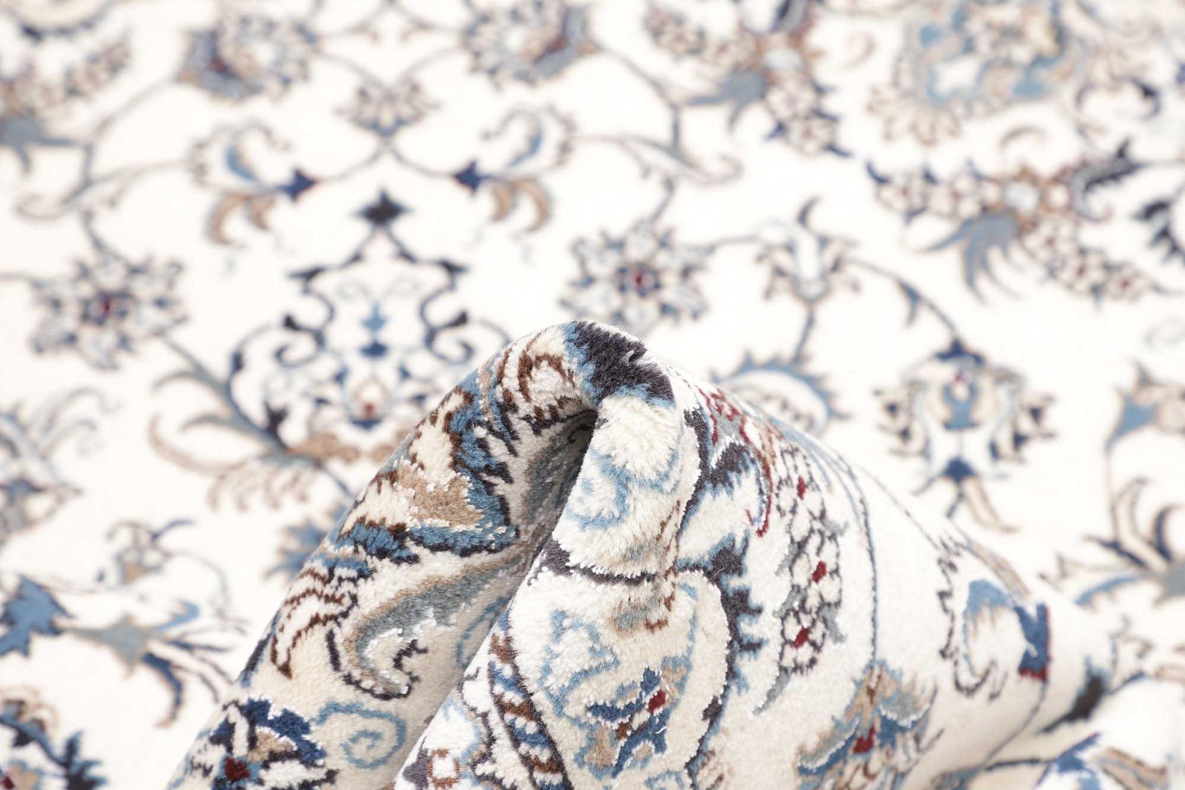 Las alfombras de la ciudad de Nain, en la frontera de uno de los mayores desiertos de Irán, están entre las alfombras persas más famosas del mundo. Su diseño típico es inconfundible con adornos florales, un medallón central y tonos beige y rojo o azul. Gracias a sus designaciones 4La, 6La, 9La y 12La, las sutilezas de una alfombra de Nain se pueden ver a simple vista. Cuanto más bajo sea el número "La", más alta es la densidad del nudo y por lo tanto más fina es la alfombra.