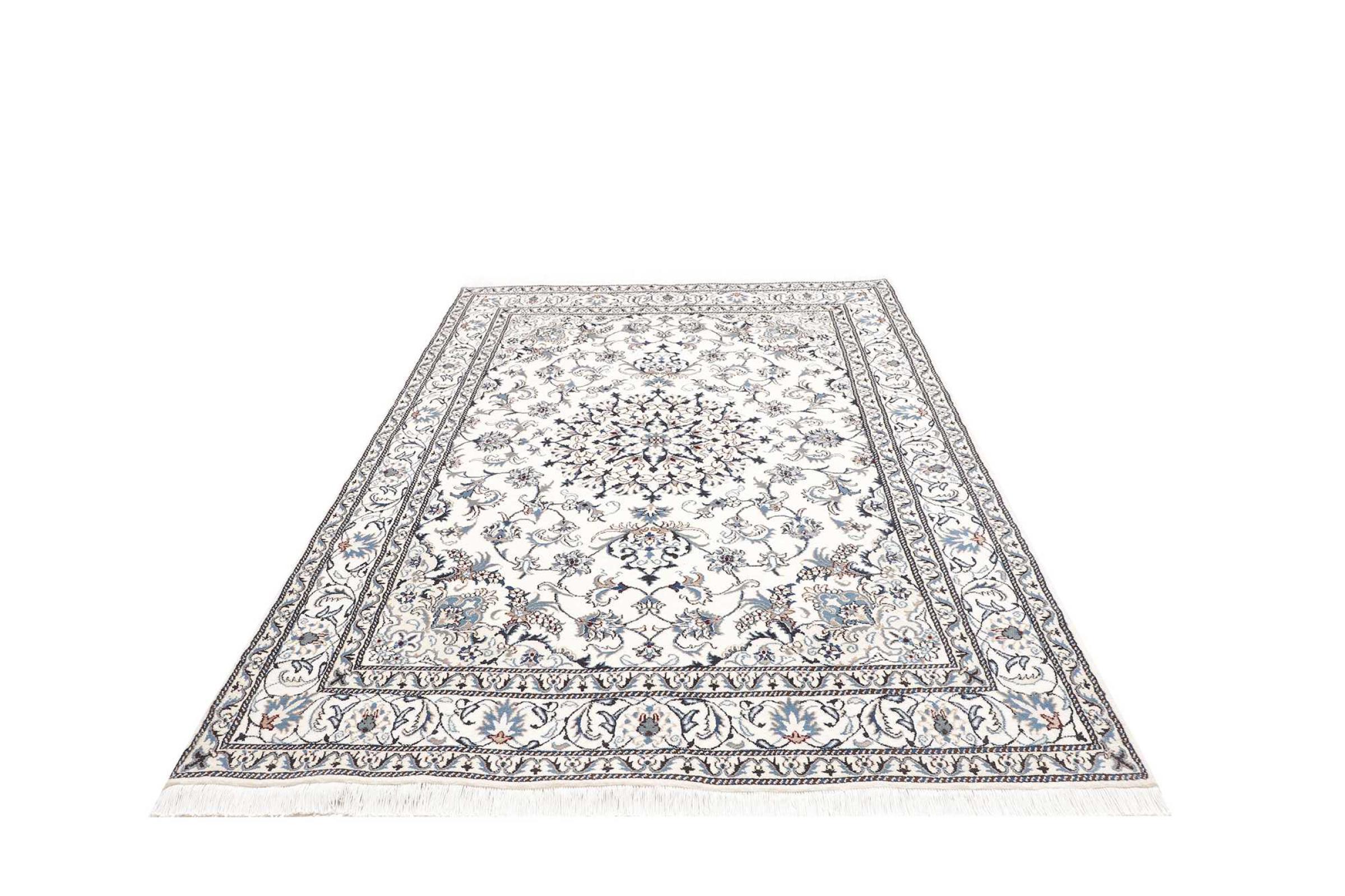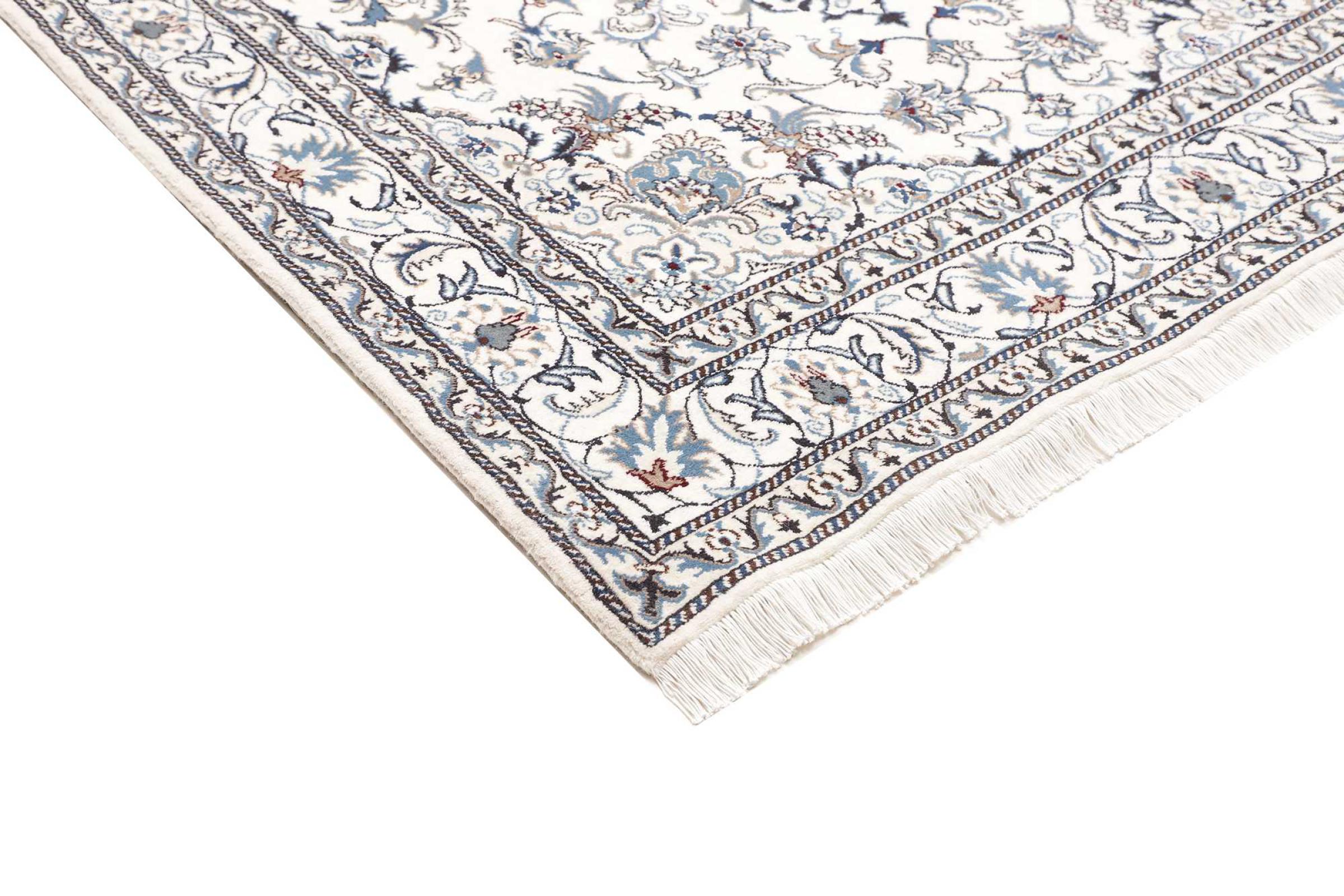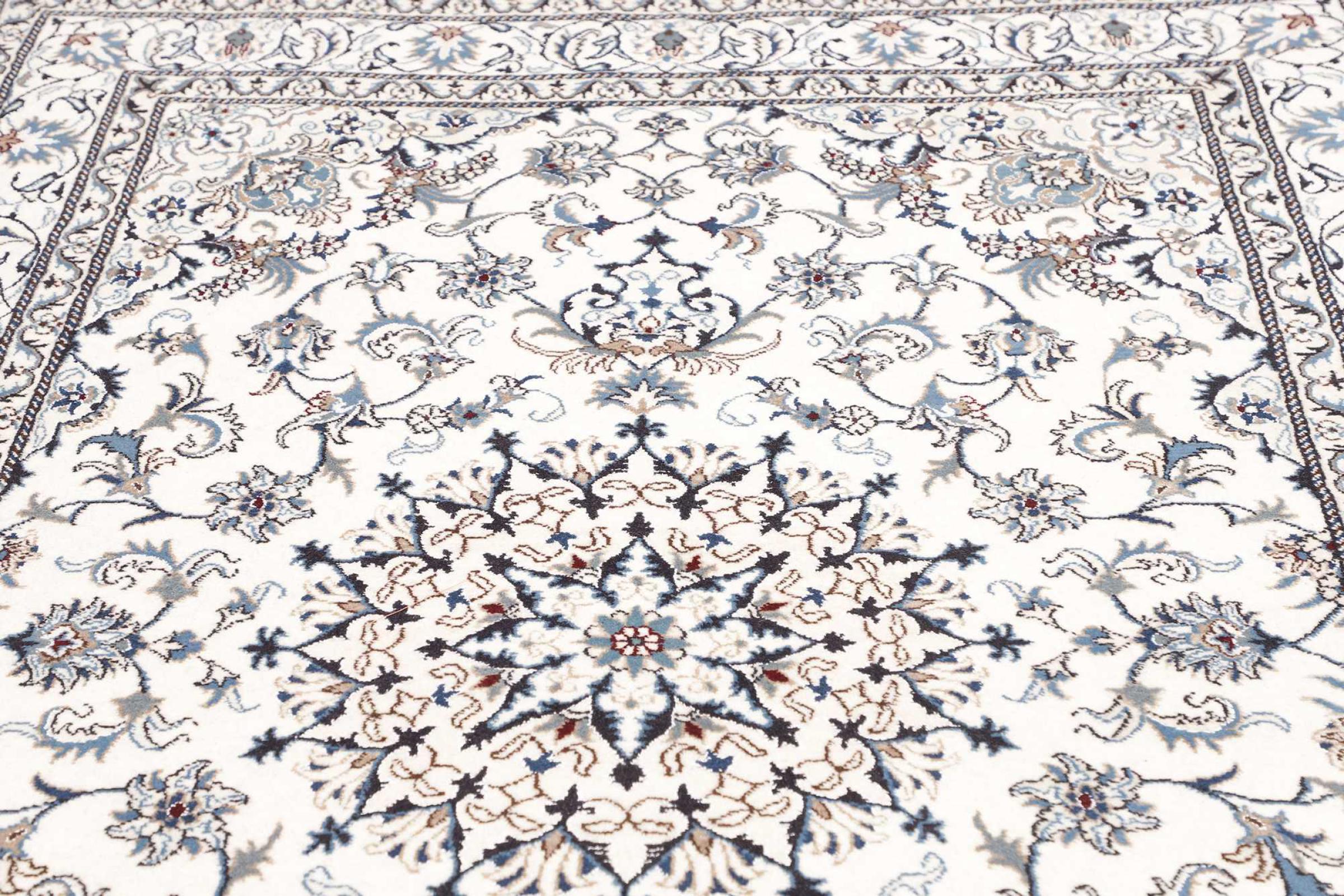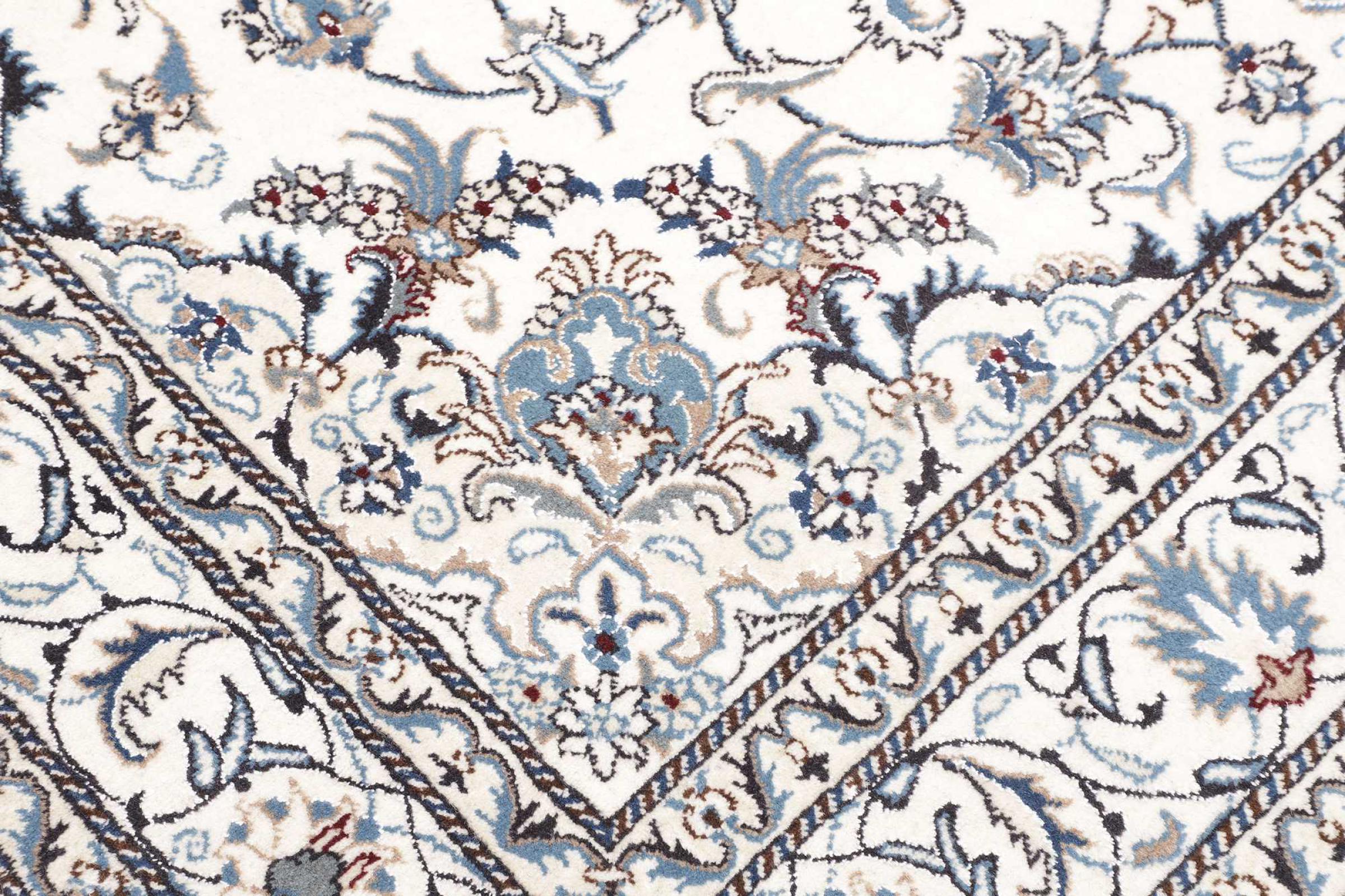 Las alfombras de la ciudad de Nain, en la frontera de uno de los mayores desiertos de Irán, están entre las alfombras persas más famosas del mundo. Su diseño típico es inconfundible con adornos florales, un medallón central y tonos beige y rojo o azul. Gracias a sus designaciones 4La, 6La, 9La y 12La, las sutilezas de una alfombra de Nain se pueden ver a simple vista. Cuanto más bajo sea el número "La", más alta es la densidad del nudo y por lo tanto más fina es la alfombra.