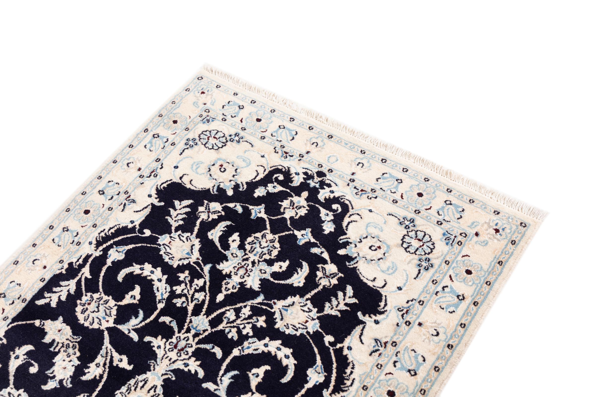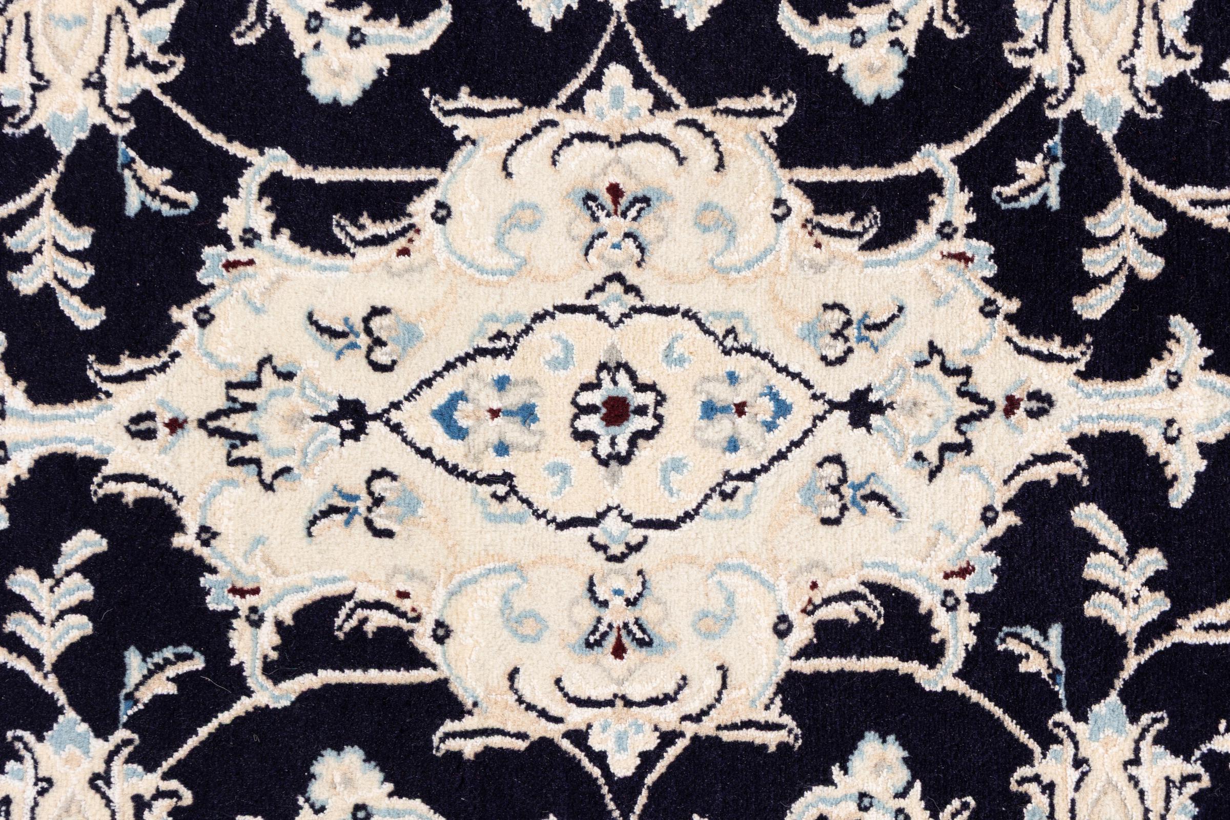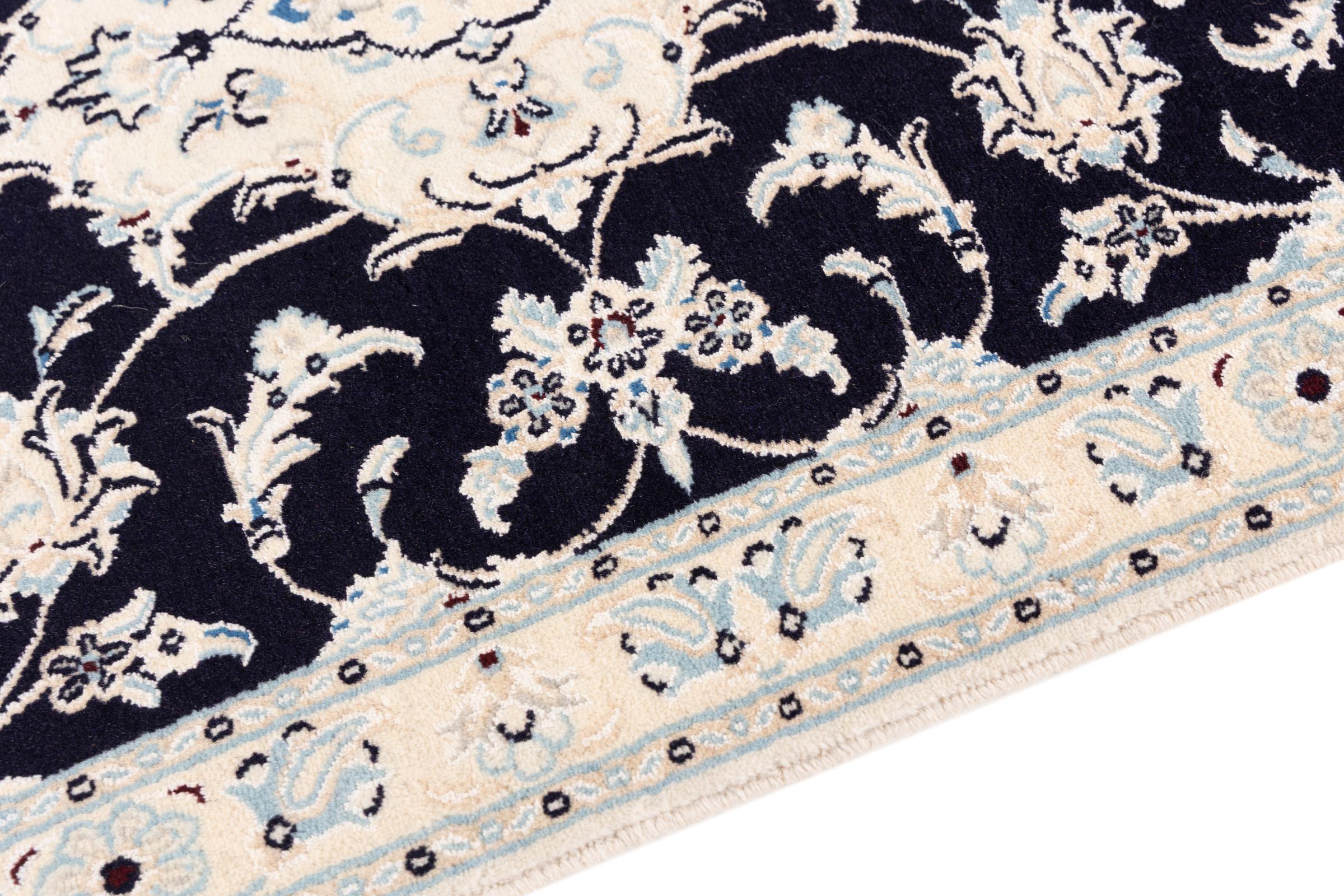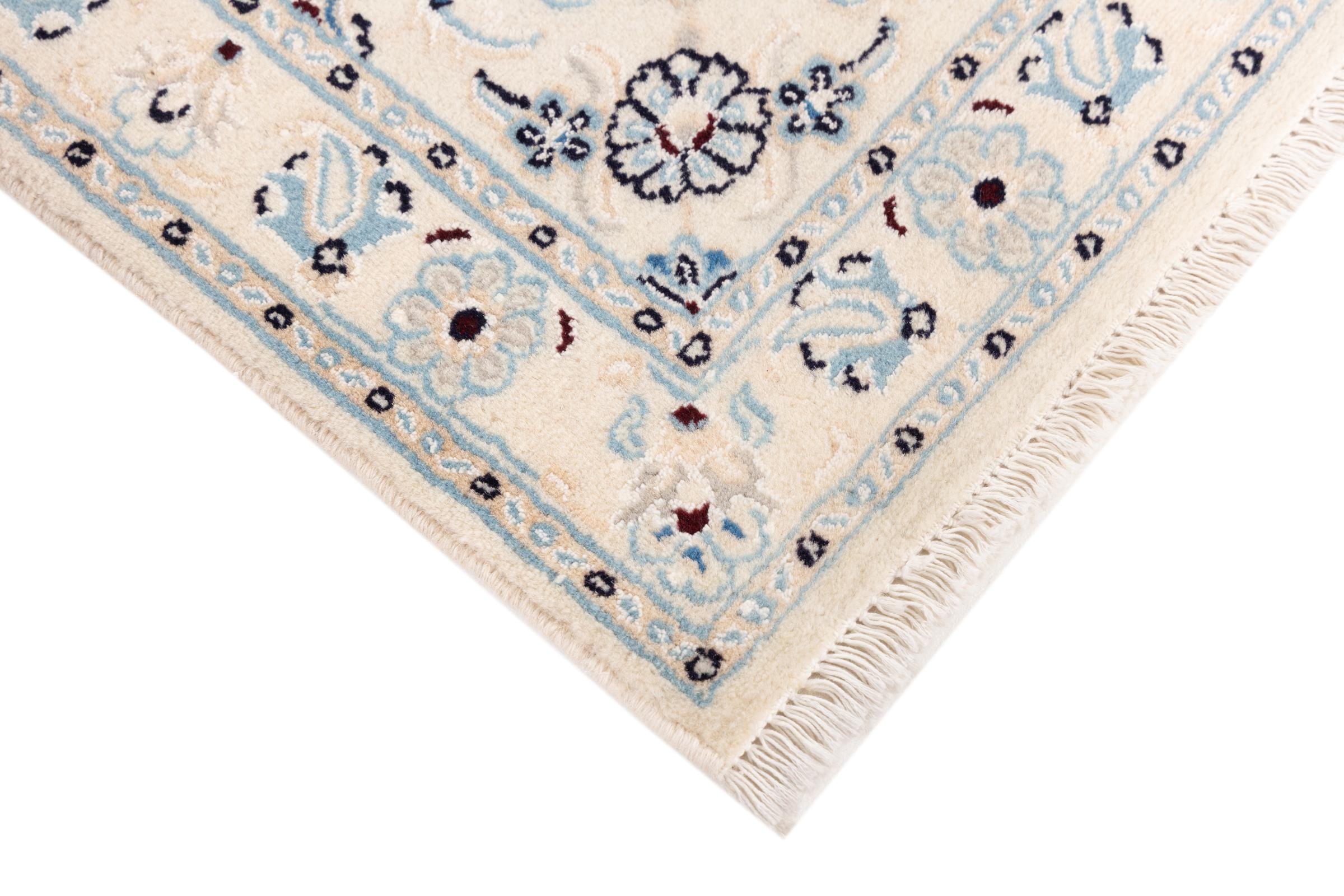 Esta alfombra Nain está clasificada como 9La. Su excelente calidad y su bello diseño oriental con motivos curvilíneos harán las delicias de cualquier comprador. Esta alfombra persa fue anudada a mano en la ciudad de Nain, situada en el extremo occidental del desierto de Dasht-e-Kavir, con lana de alta calidad y seda natural. Las alfombras Nain 9La son claramente más finas que las 12La y ya muestran bellos detalles.