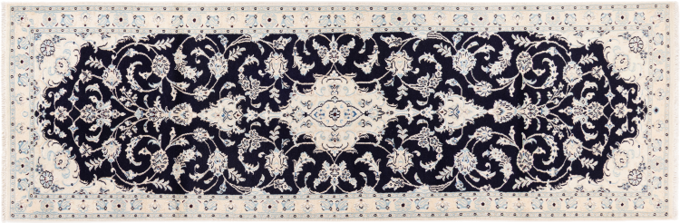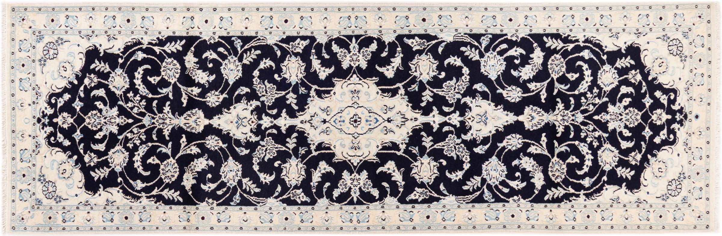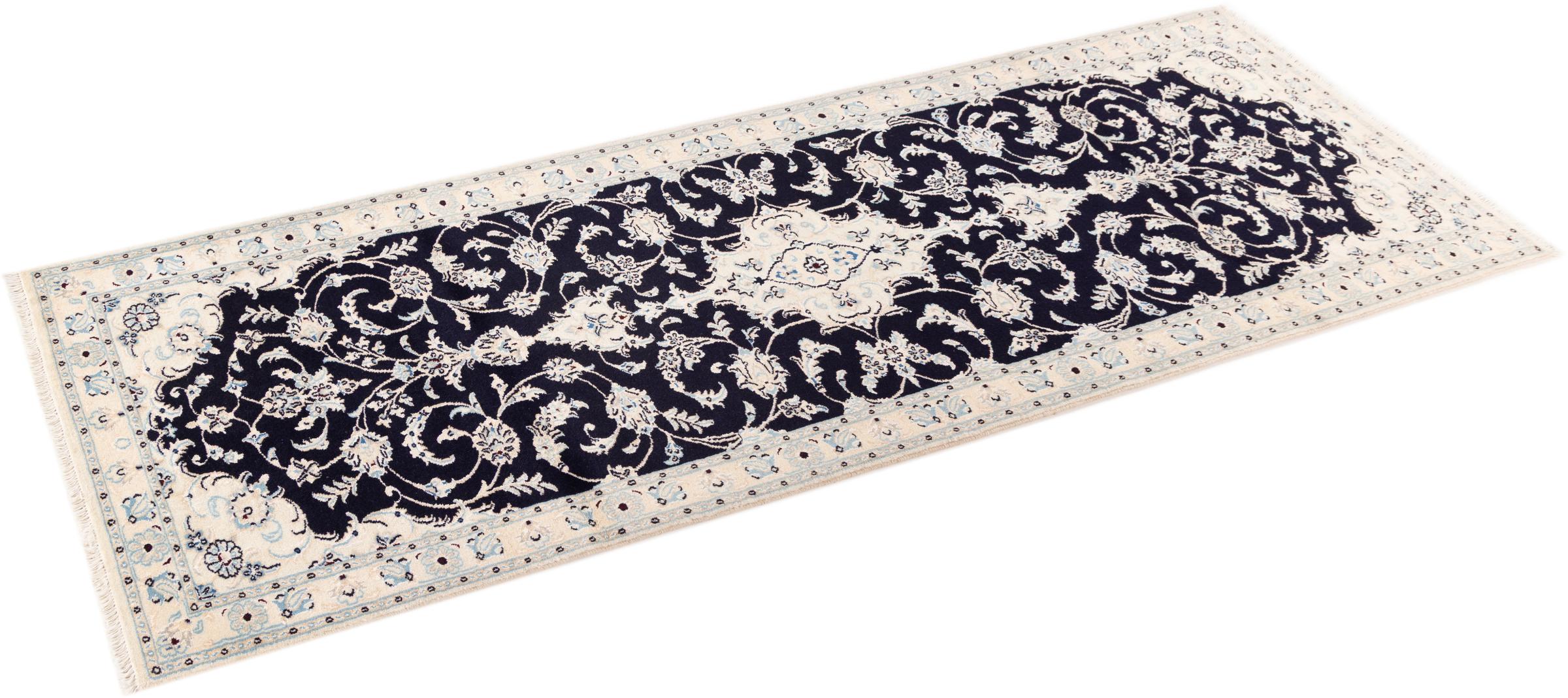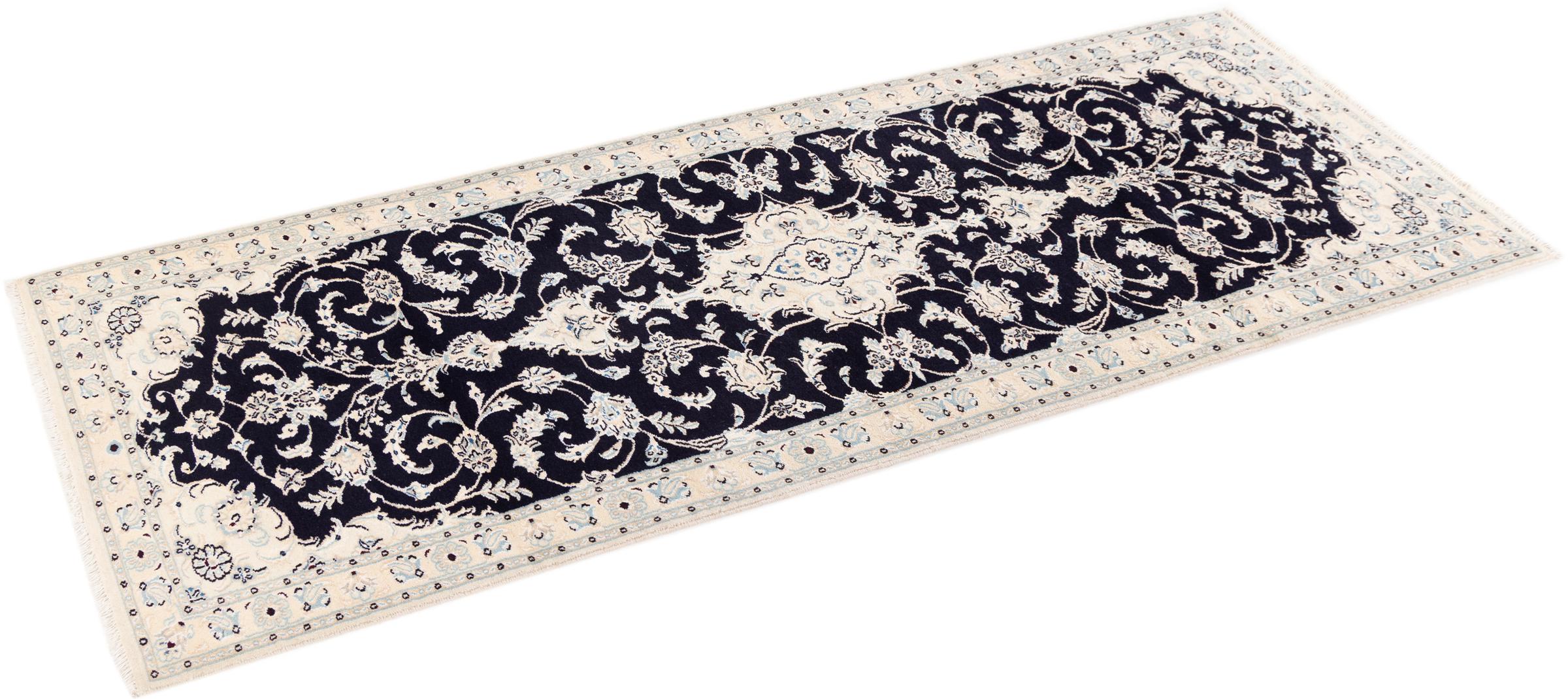 Esta alfombra Nain está clasificada como 9La. Su excelente calidad y su bello diseño oriental con motivos curvilíneos harán las delicias de cualquier comprador. Esta alfombra persa fue anudada a mano en la ciudad de Nain, situada en el extremo occidental del desierto de Dasht-e-Kavir, con lana de alta calidad y seda natural. Las alfombras Nain 9La son claramente más finas que las 12La y ya muestran bellos detalles.