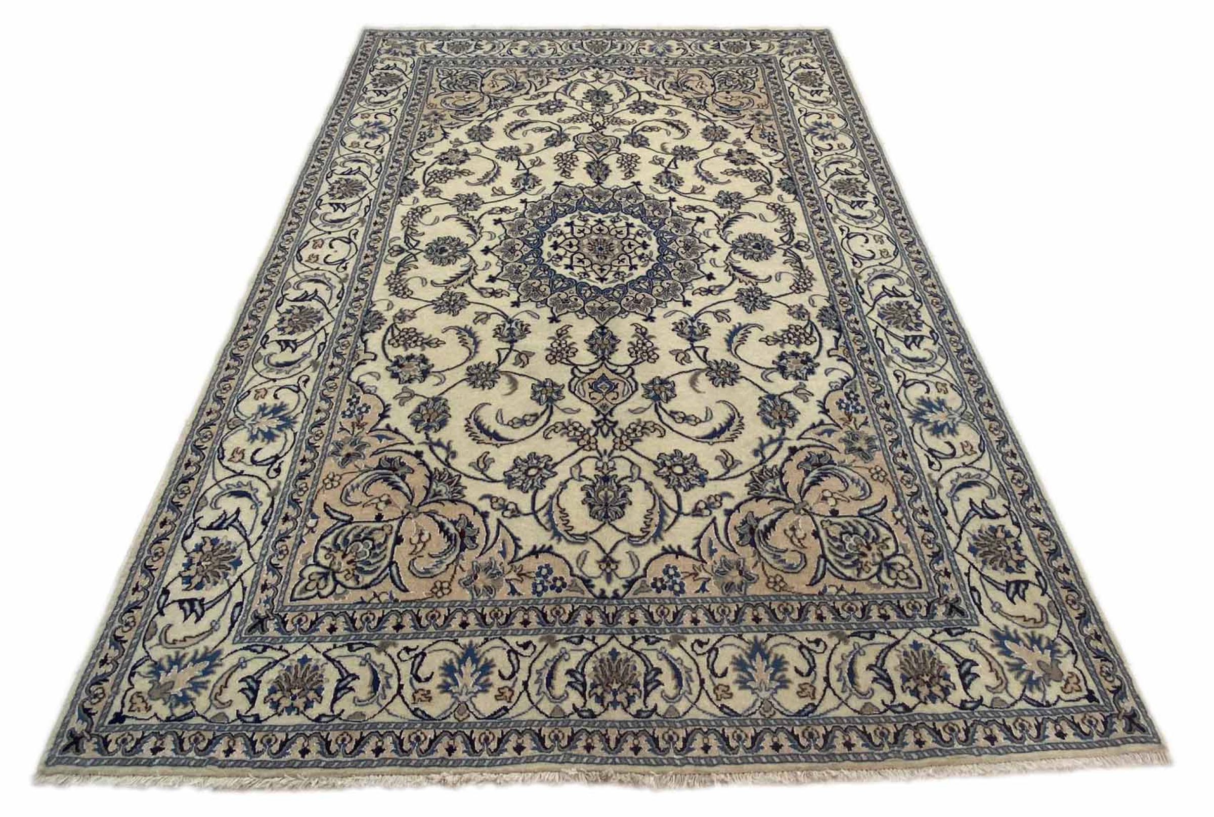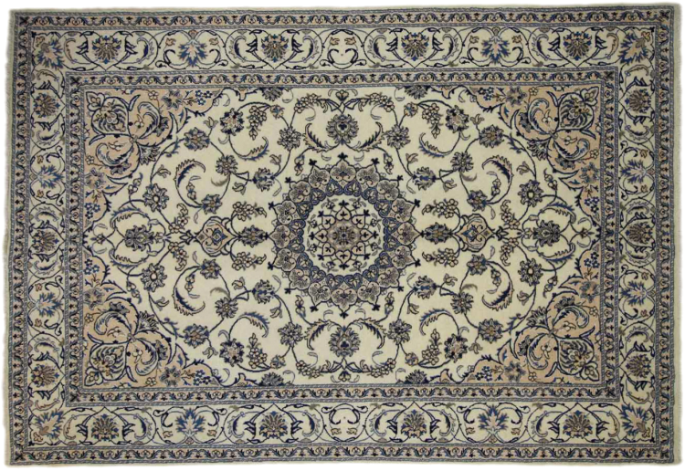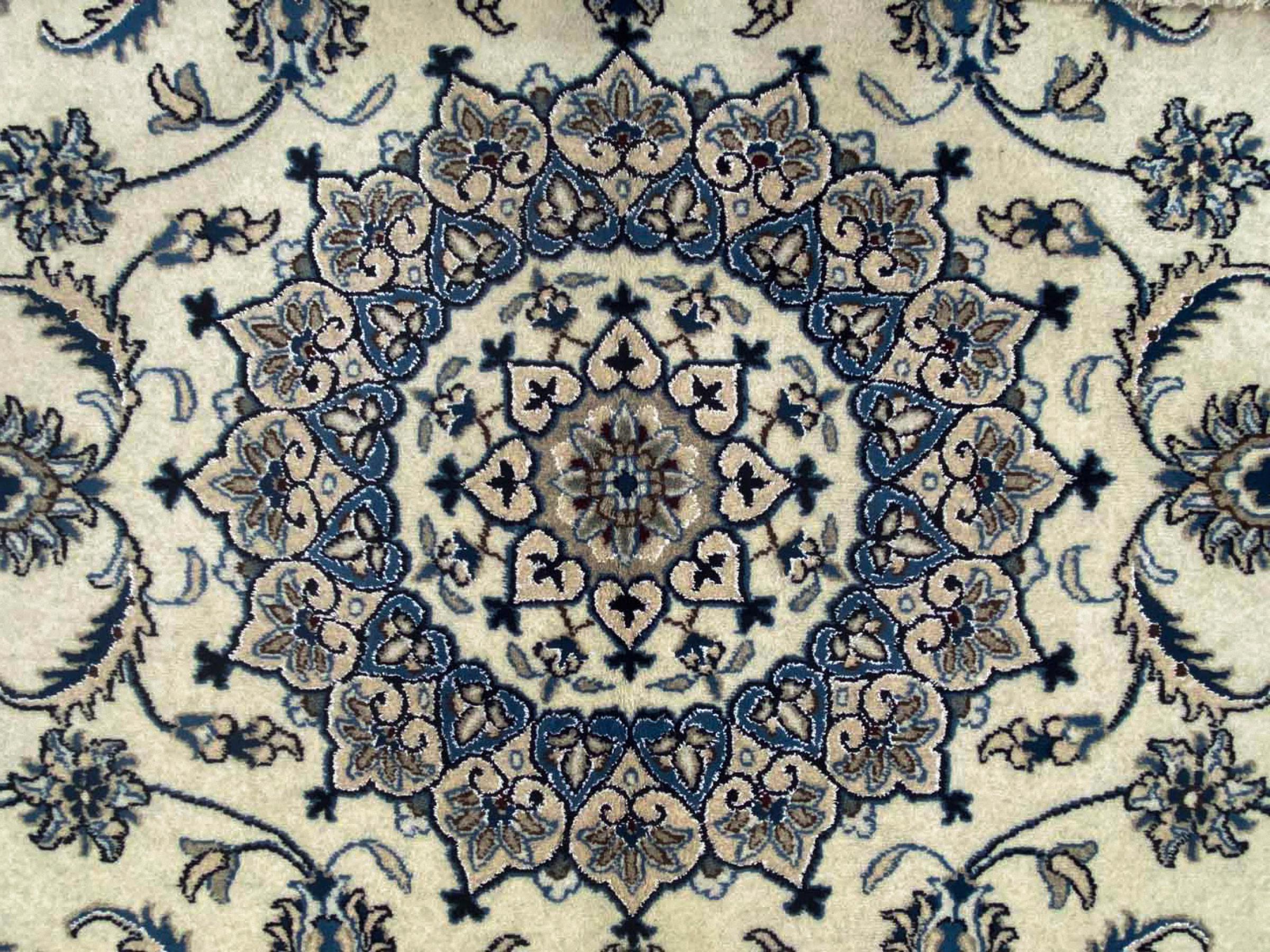 Las alfombras de la ciudad de Nain, en la frontera de uno de los mayores desiertos de Irán, están entre las alfombras persas más famosas del mundo. Su diseño típico es inconfundible con adornos florales, un medallón central y tonos beige y rojo o azul. Gracias a sus designaciones 4La, 6La, 9La y 12La, las sutilezas de una alfombra de Nain se pueden ver a simple vista. Cuanto más bajo sea el número "La", más alta es la densidad del nudo y por lo tanto más fina es la alfombra.