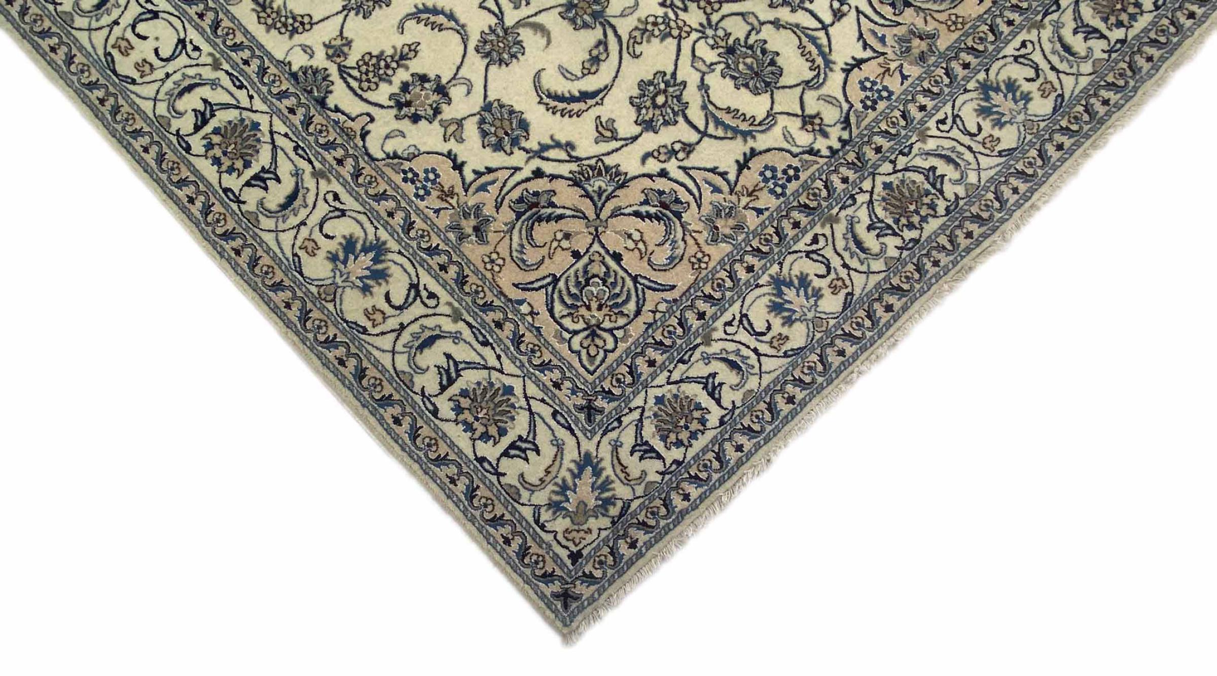 Esta alfombra Nain está clasificada como 12La. Tiene un aspecto elegante y refinado con su colorido típico de Naín. Esta alfombra persa fue anudada a mano en la ciudad de Naín, situada en el extremo occidental del desierto de Dasht-e-Kavir, con lana de alta calidad y seda natural. Con un tamaño de 12La, no está tan finamente detallada con ornamentos como una Nain 9La o 6La.