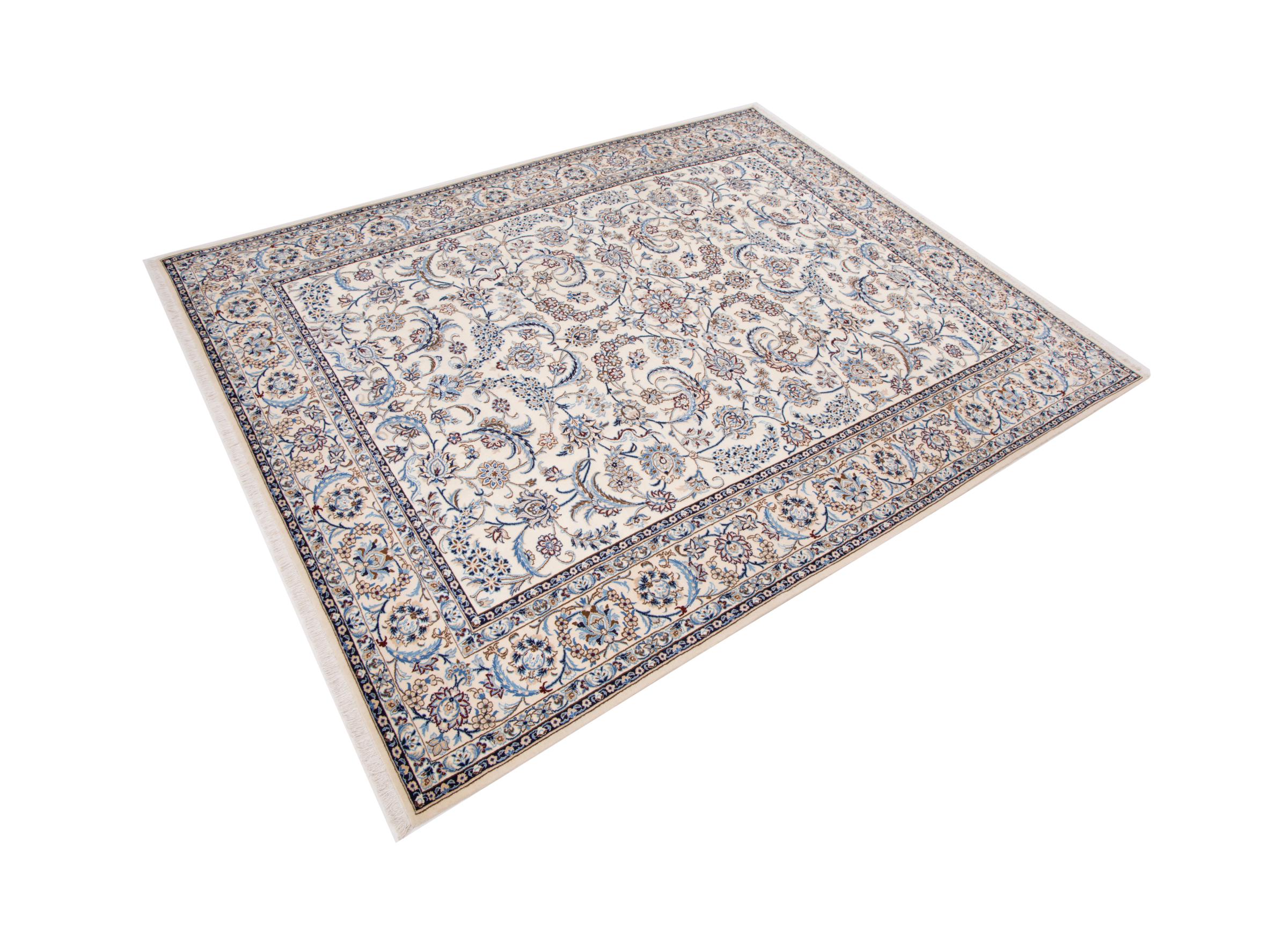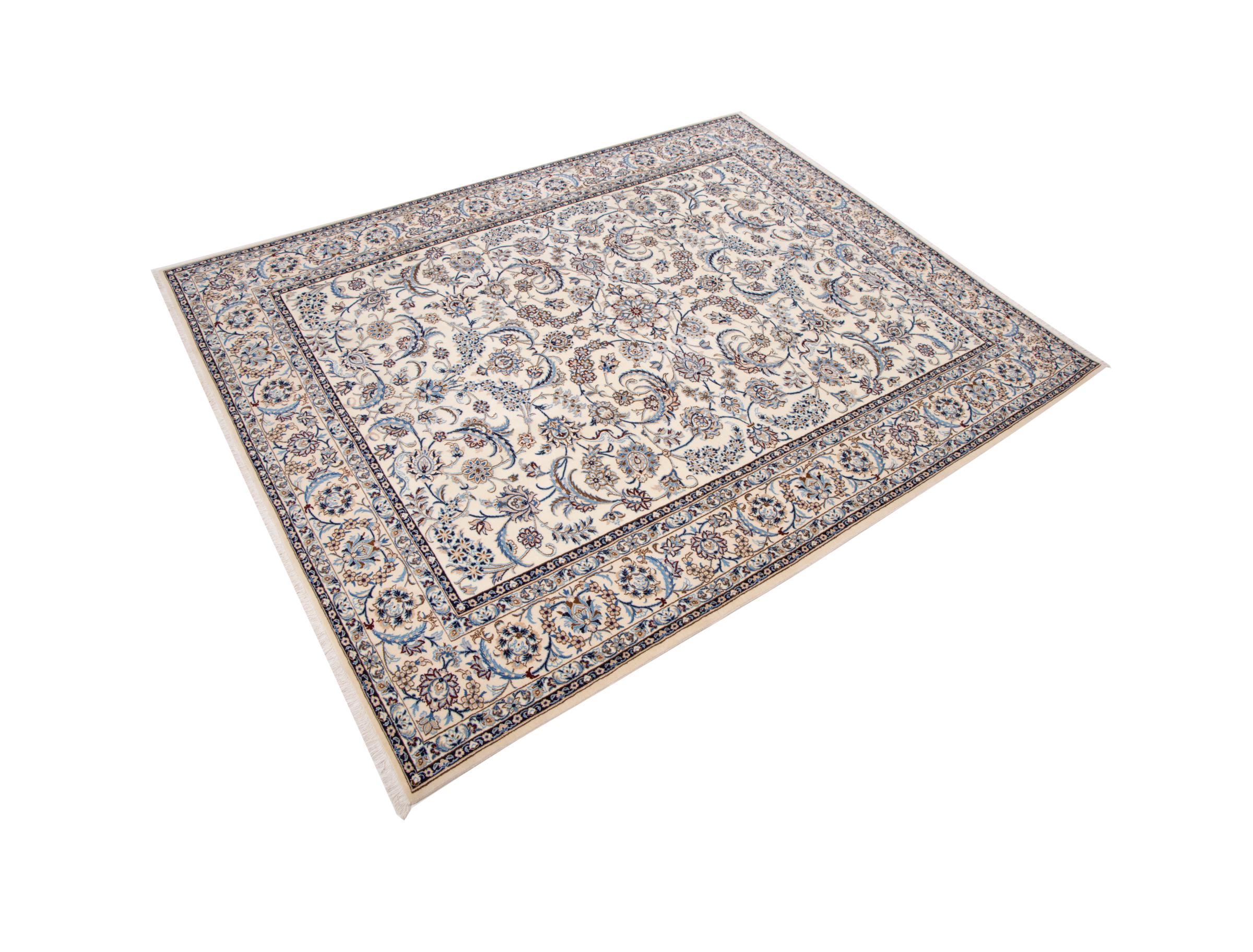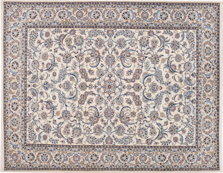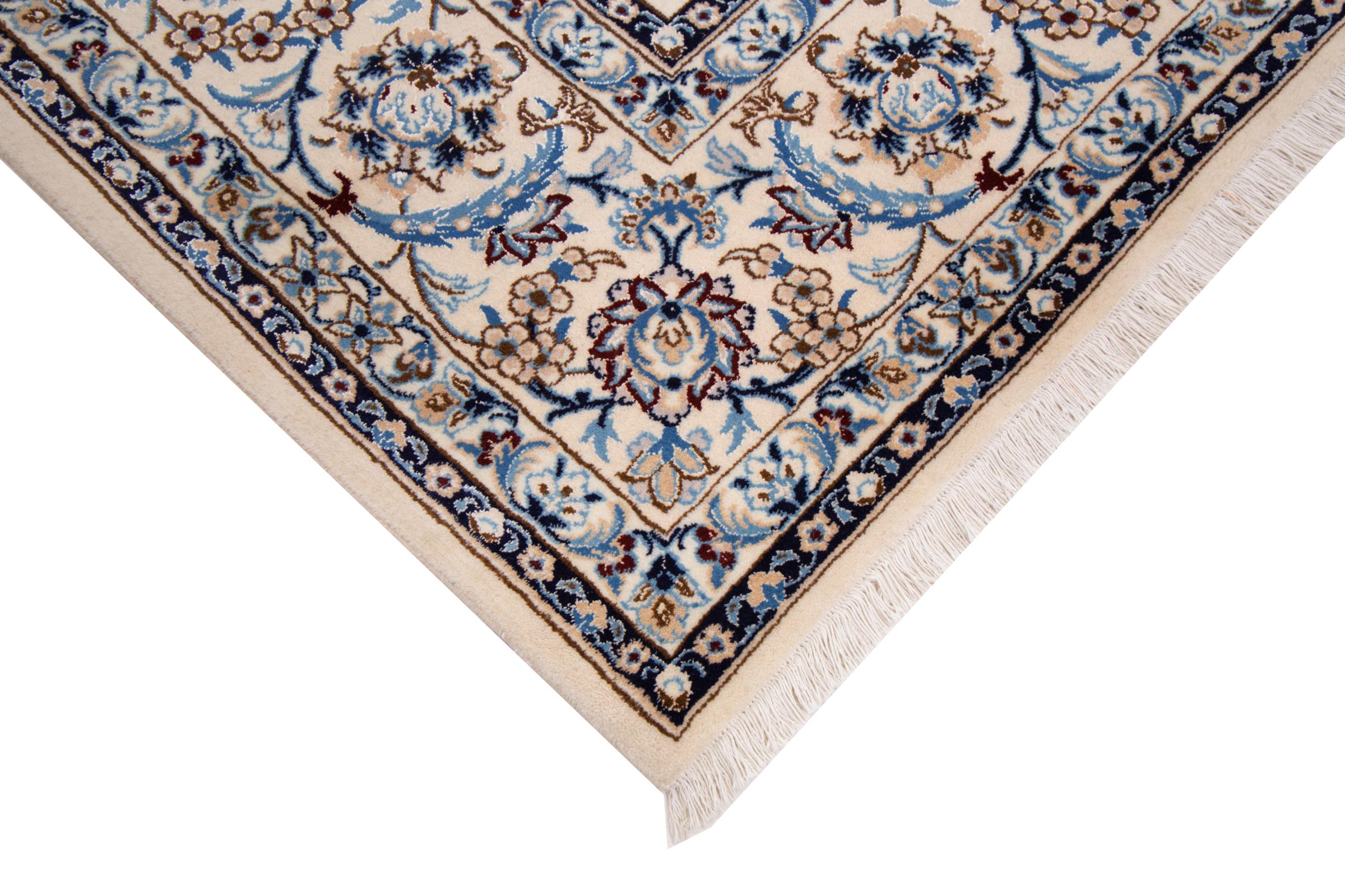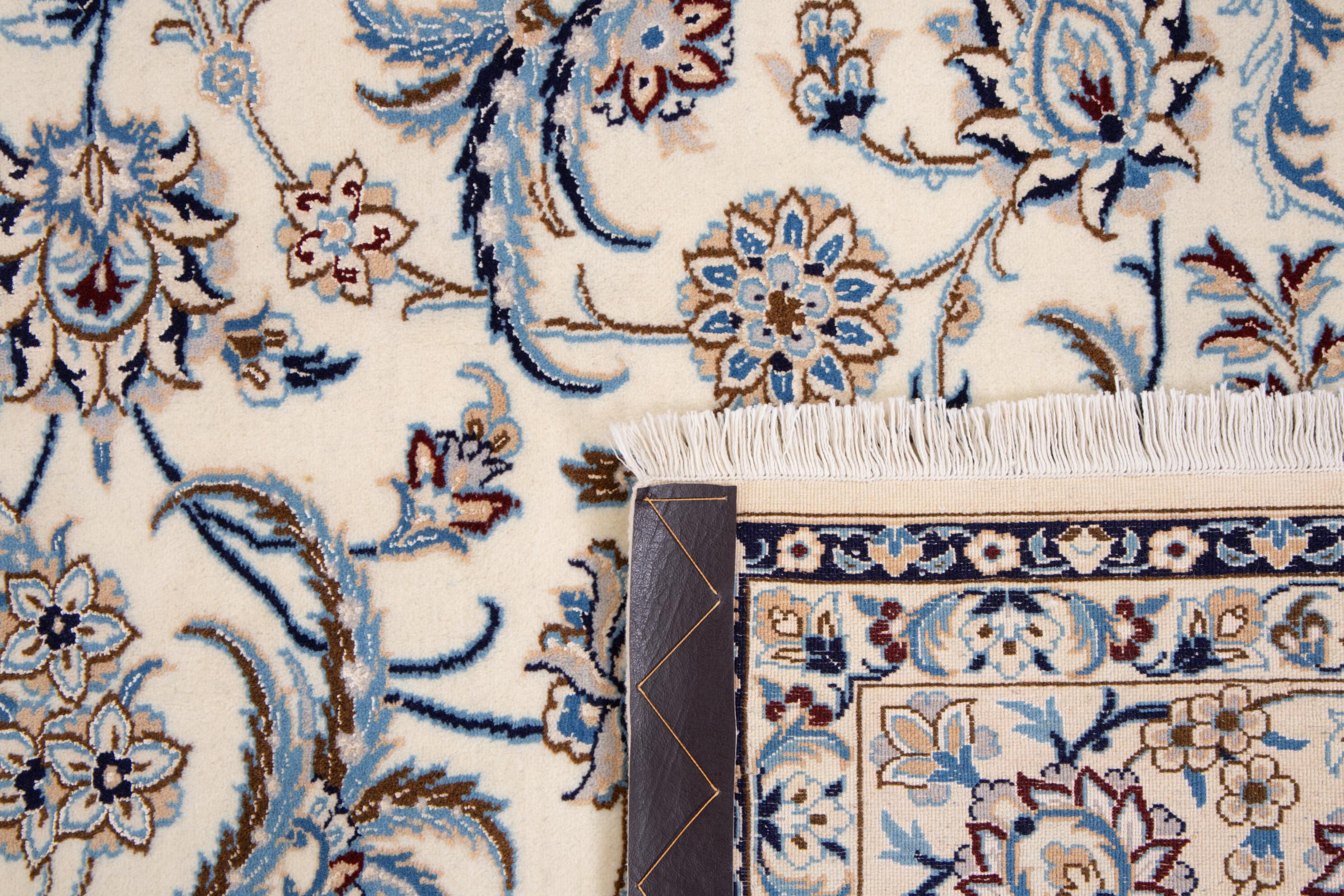 Esta alfombra Nain está clasificada como 9La. Su excelente calidad y su bello diseño oriental con motivos curvilíneos harán las delicias de cualquier comprador. Esta alfombra persa fue anudada a mano en la ciudad de Nain, situada en el extremo occidental del desierto de Dasht-e-Kavir, con lana de alta calidad y seda natural. Las alfombras Nain 9La son claramente más finas que las 12La y ya muestran bellos detalles.