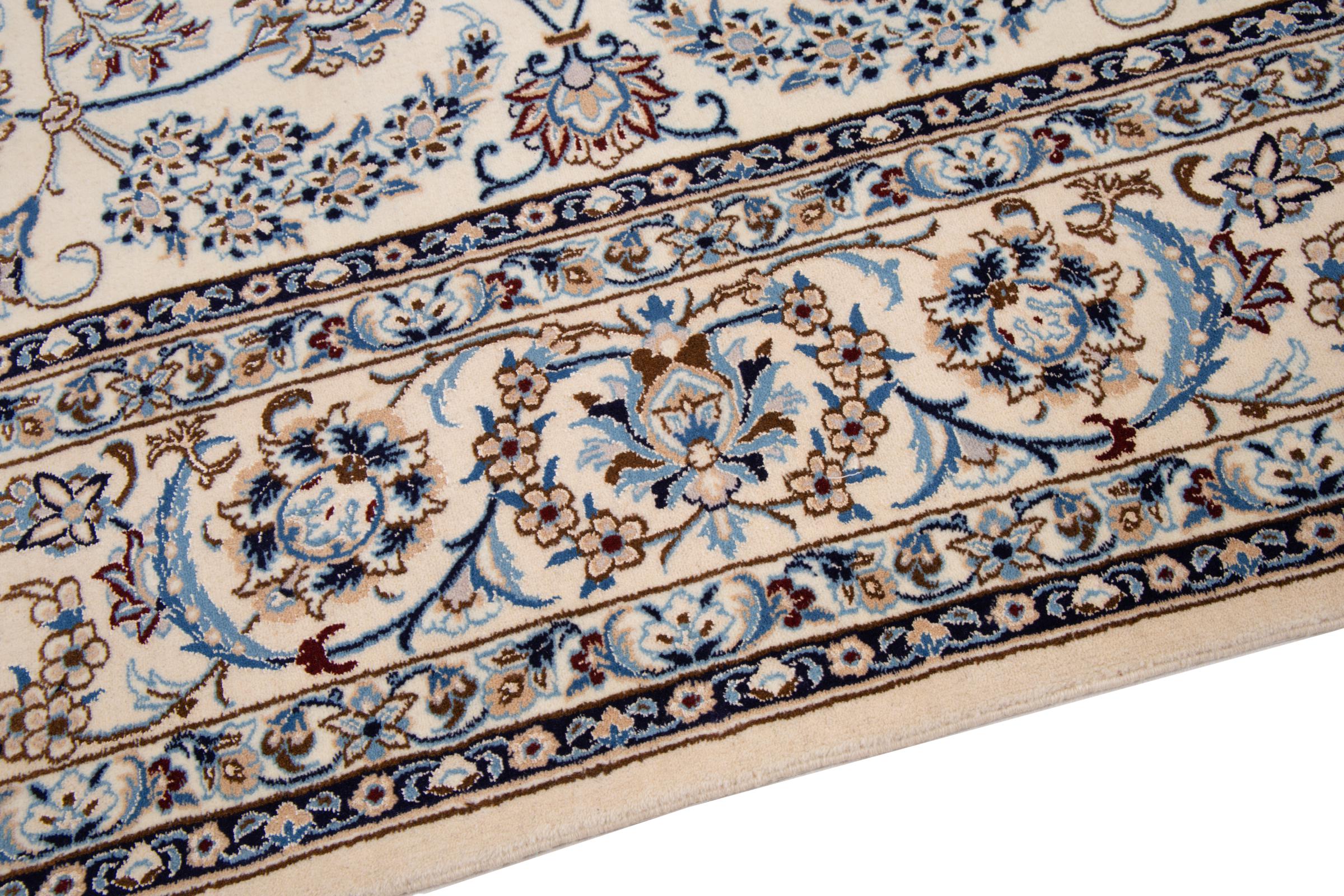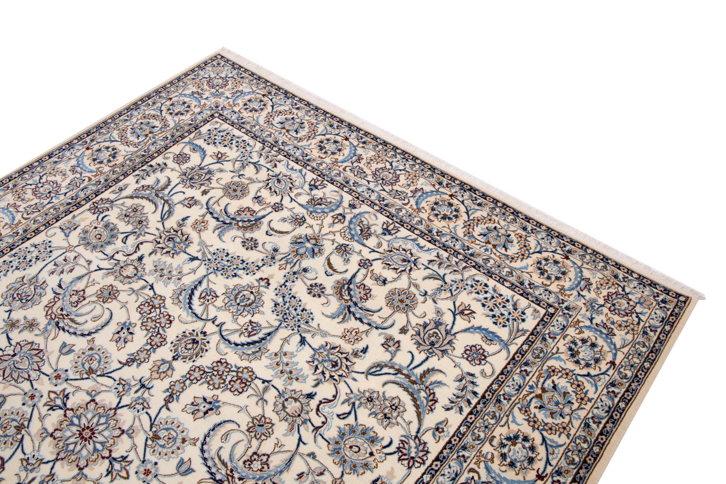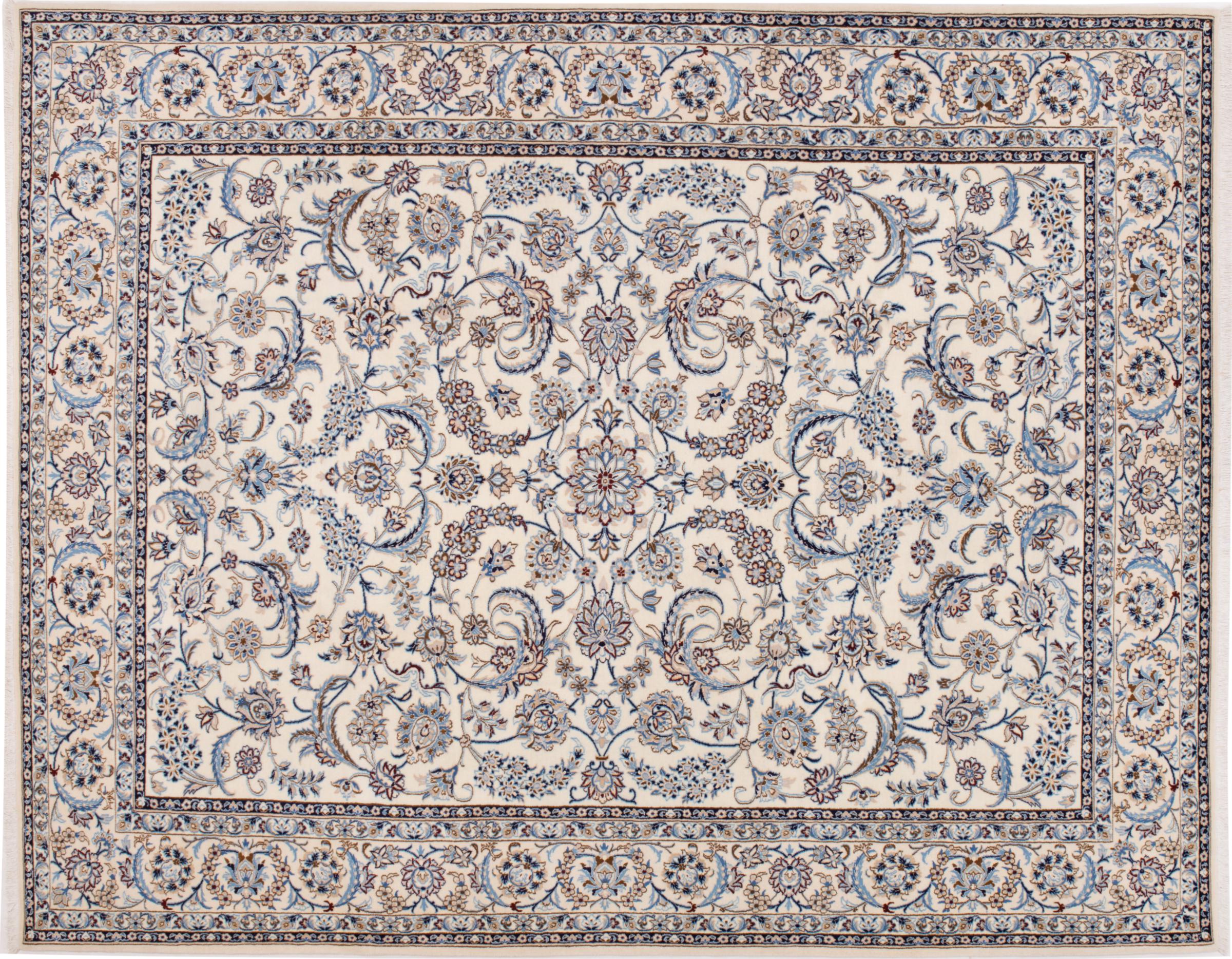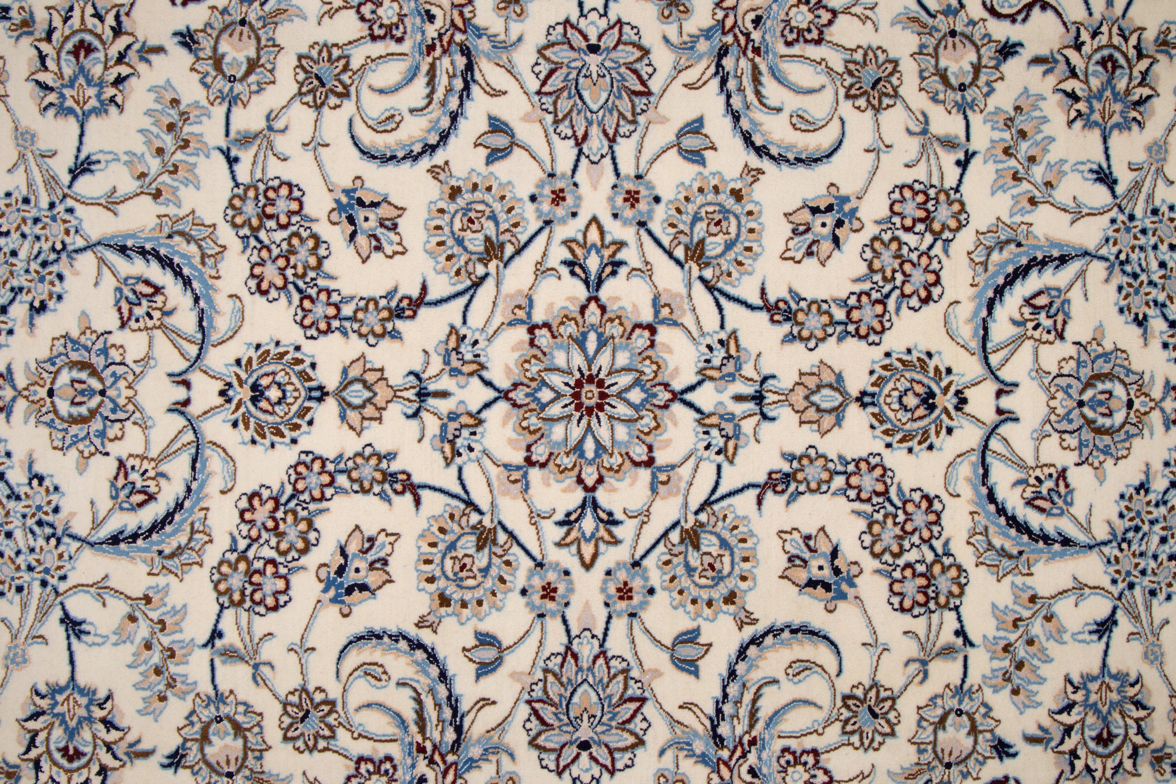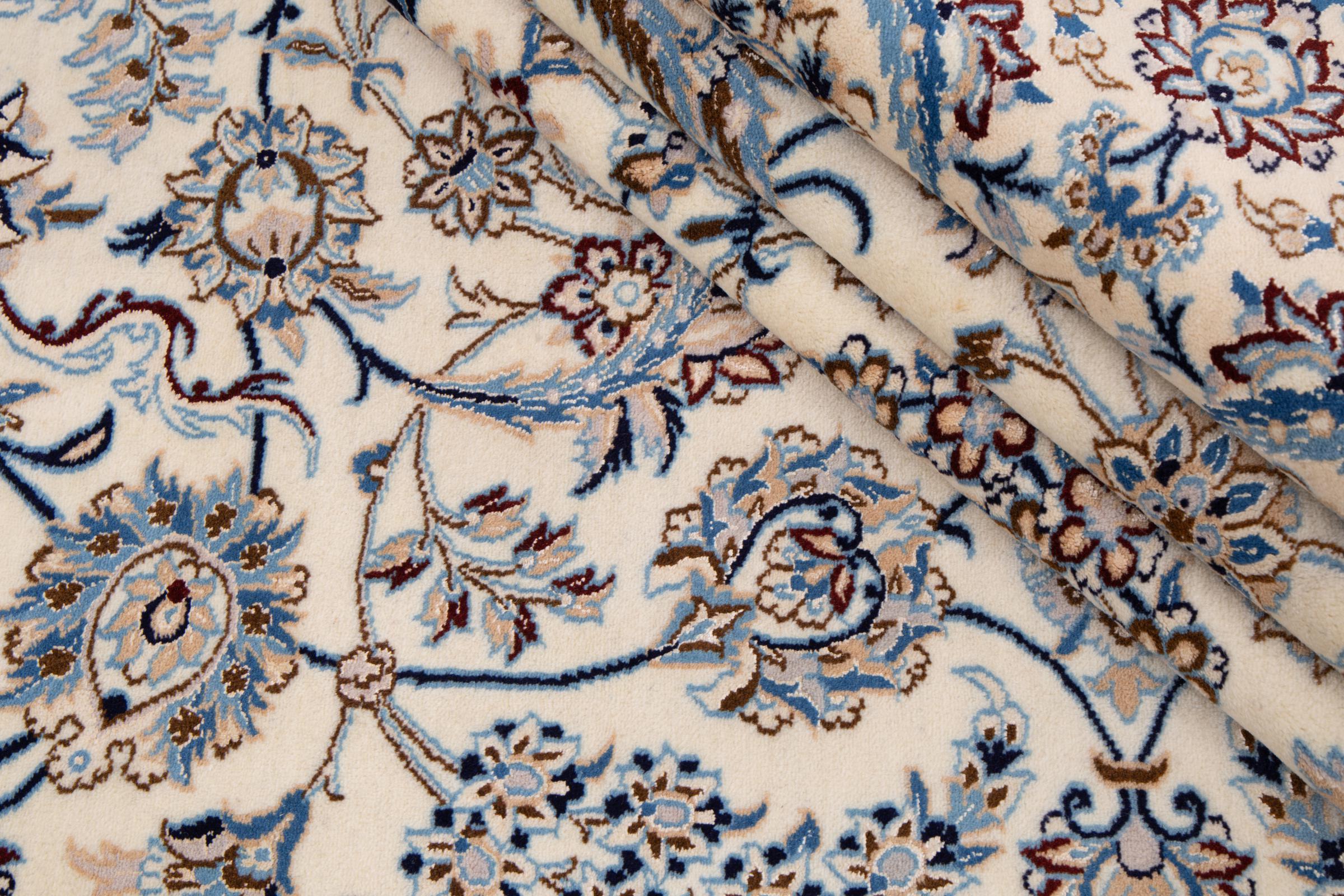 Esta alfombra Nain está clasificada como 9La. Su excelente calidad y su bello diseño oriental con motivos curvilíneos harán las delicias de cualquier comprador. Esta alfombra persa fue anudada a mano en la ciudad de Nain, situada en el extremo occidental del desierto de Dasht-e-Kavir, con lana de alta calidad y seda natural. Las alfombras Nain 9La son claramente más finas que las 12La y ya muestran bellos detalles.