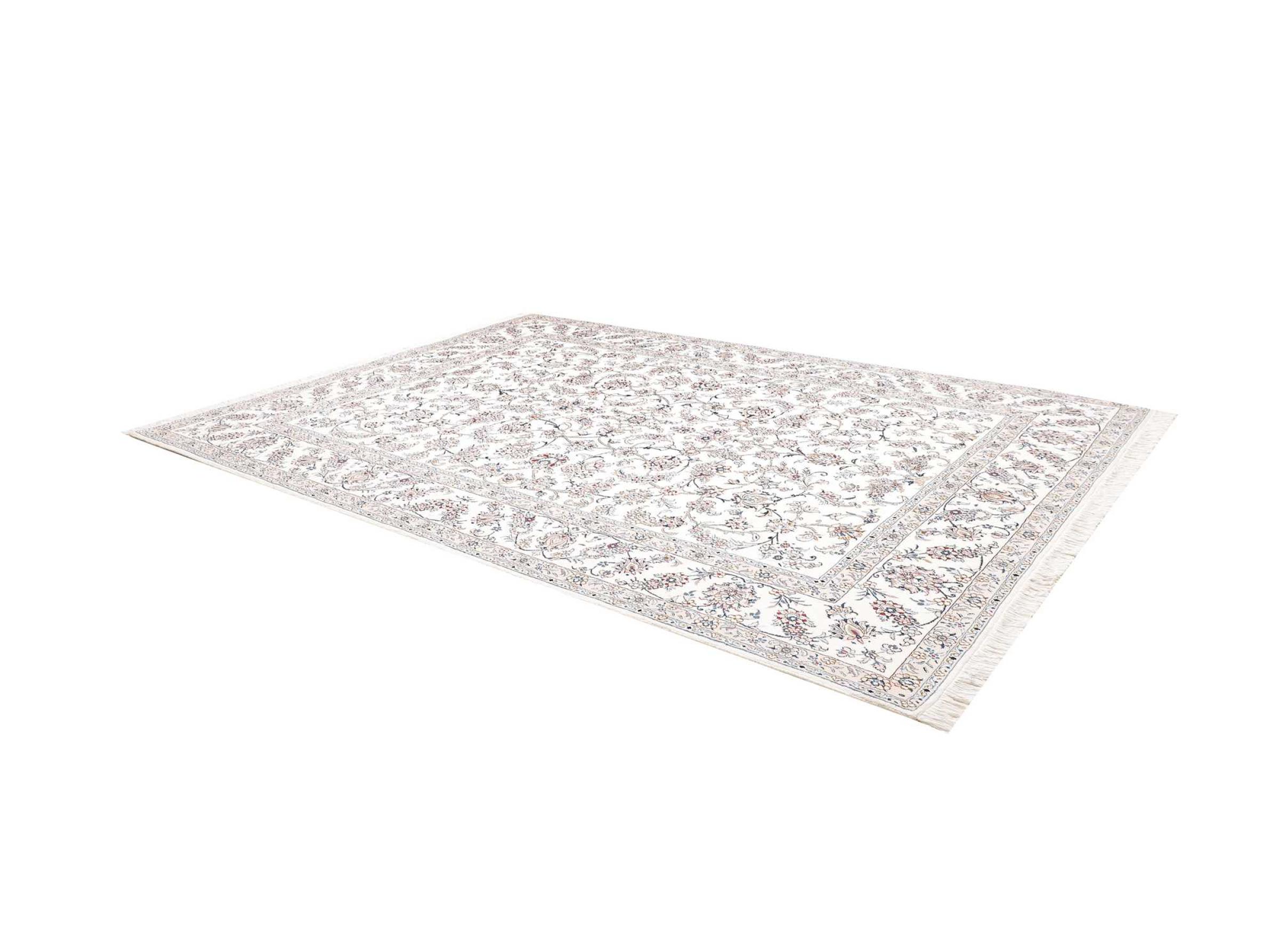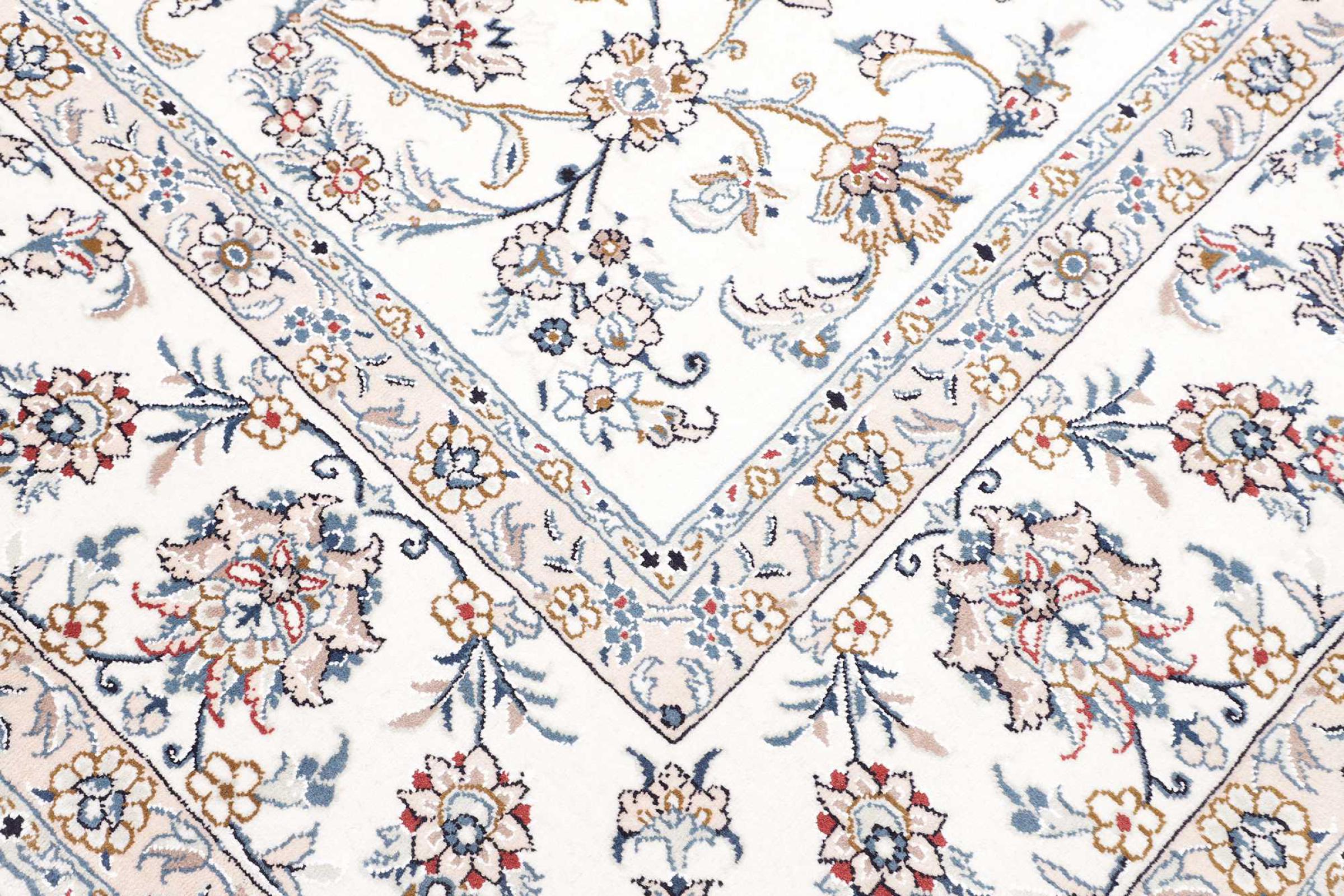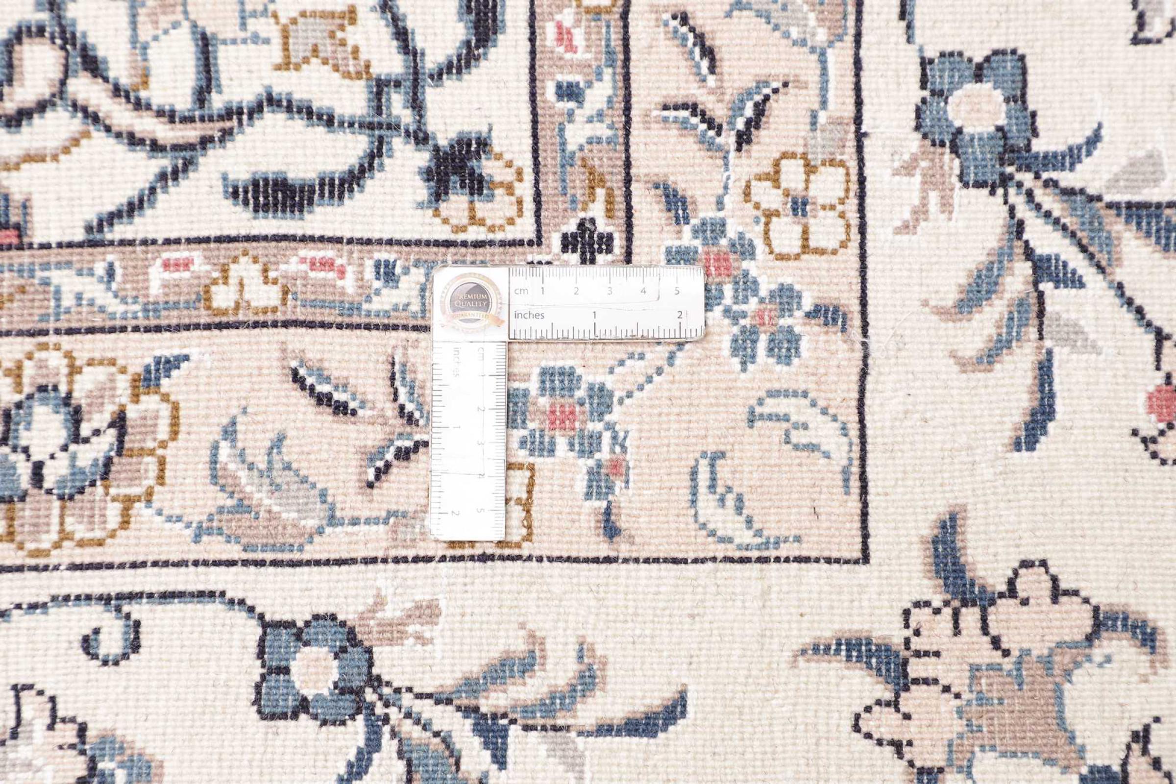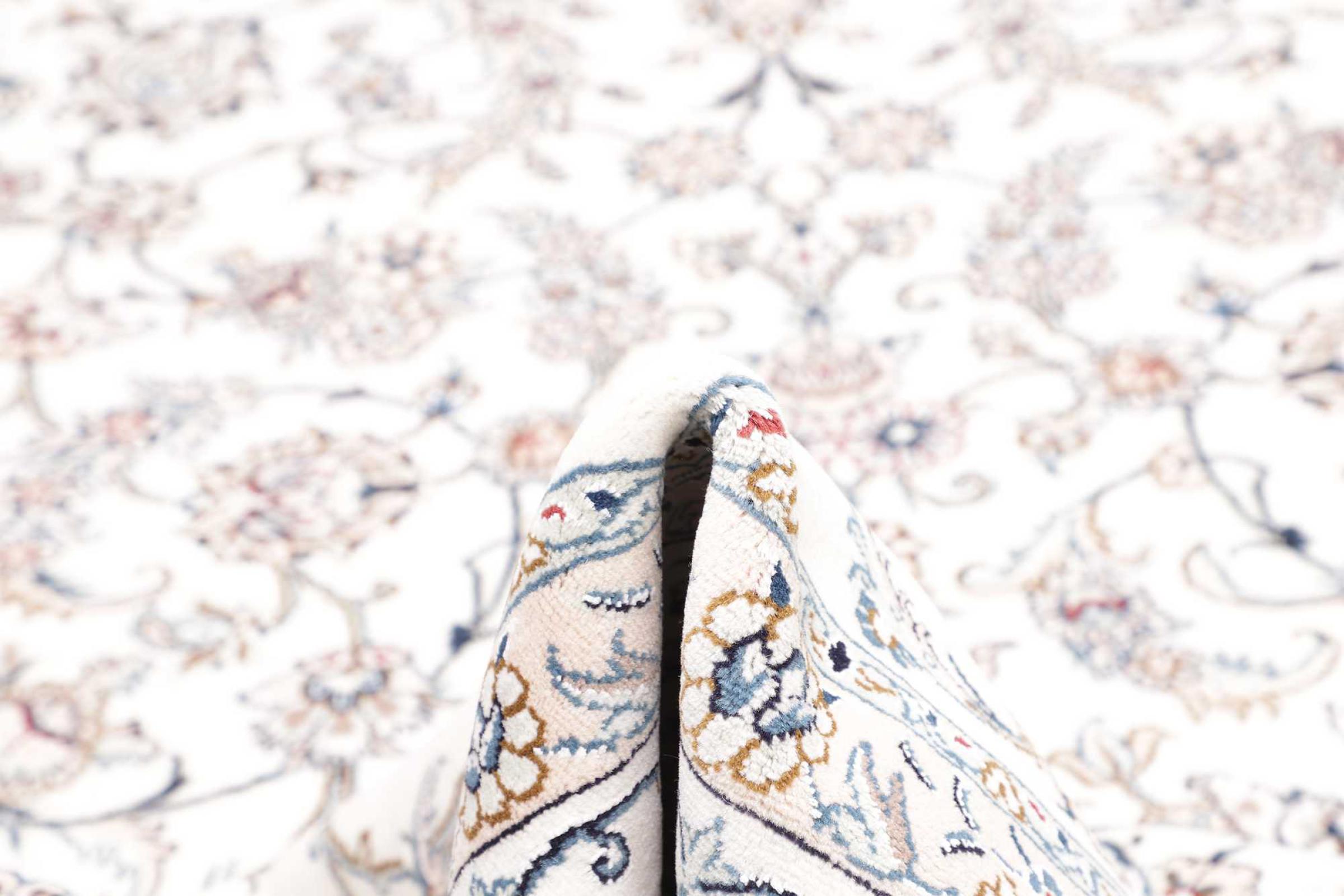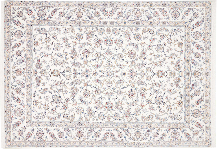 Esta alfombra Nain está clasificada como 12La. Tiene un aspecto elegante y refinado con su colorido típico de Naín. Esta alfombra persa fue anudada a mano en la ciudad de Naín, situada en el extremo occidental del desierto de Dasht-e-Kavir, con lana de alta calidad y seda natural. Con un tamaño de 12La, no está tan finamente detallada con ornamentos como una Nain 9La o 6La.