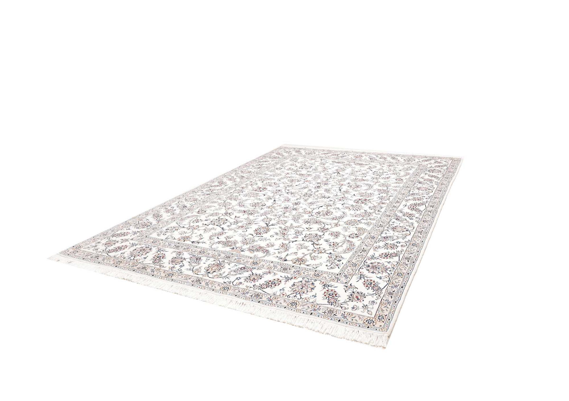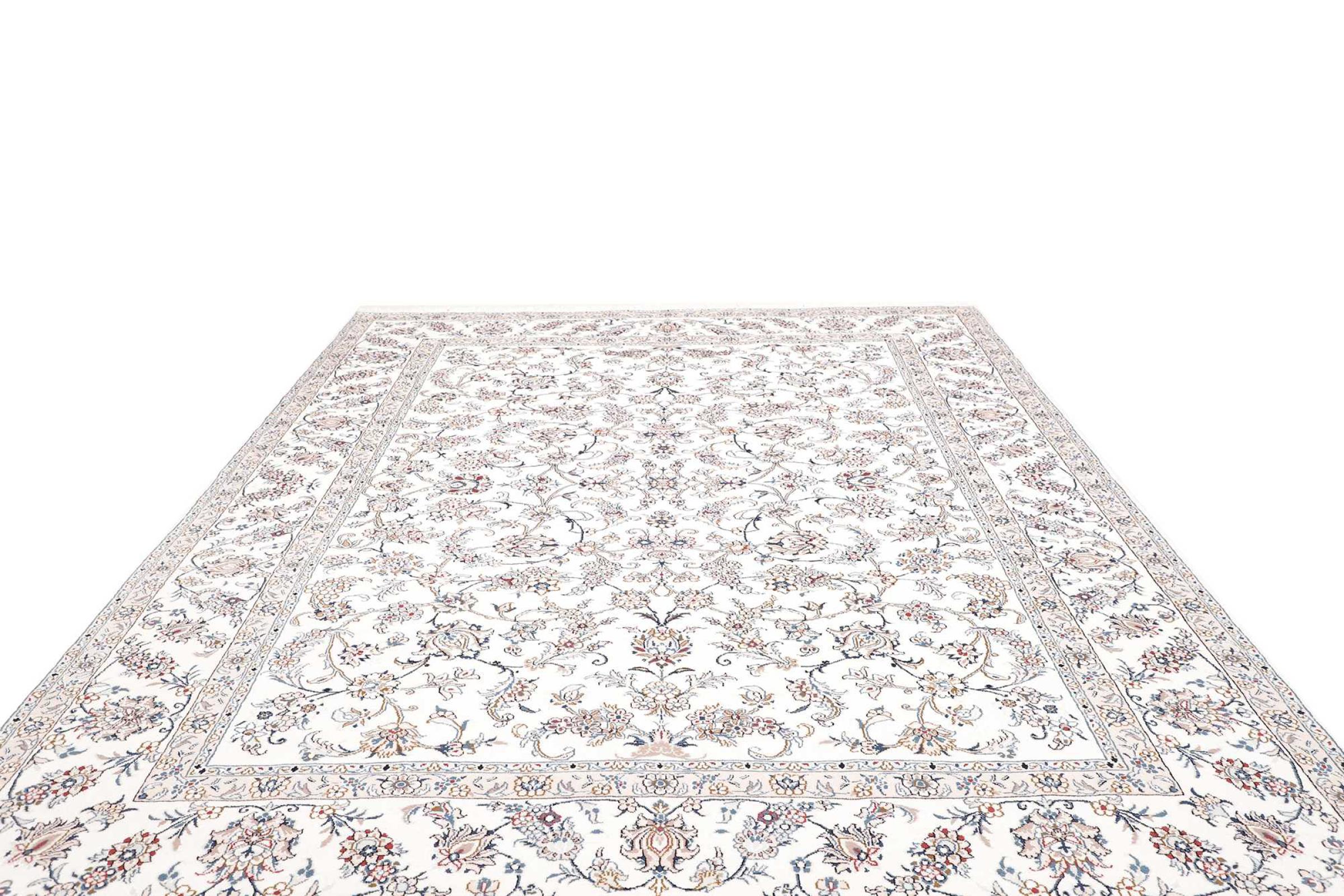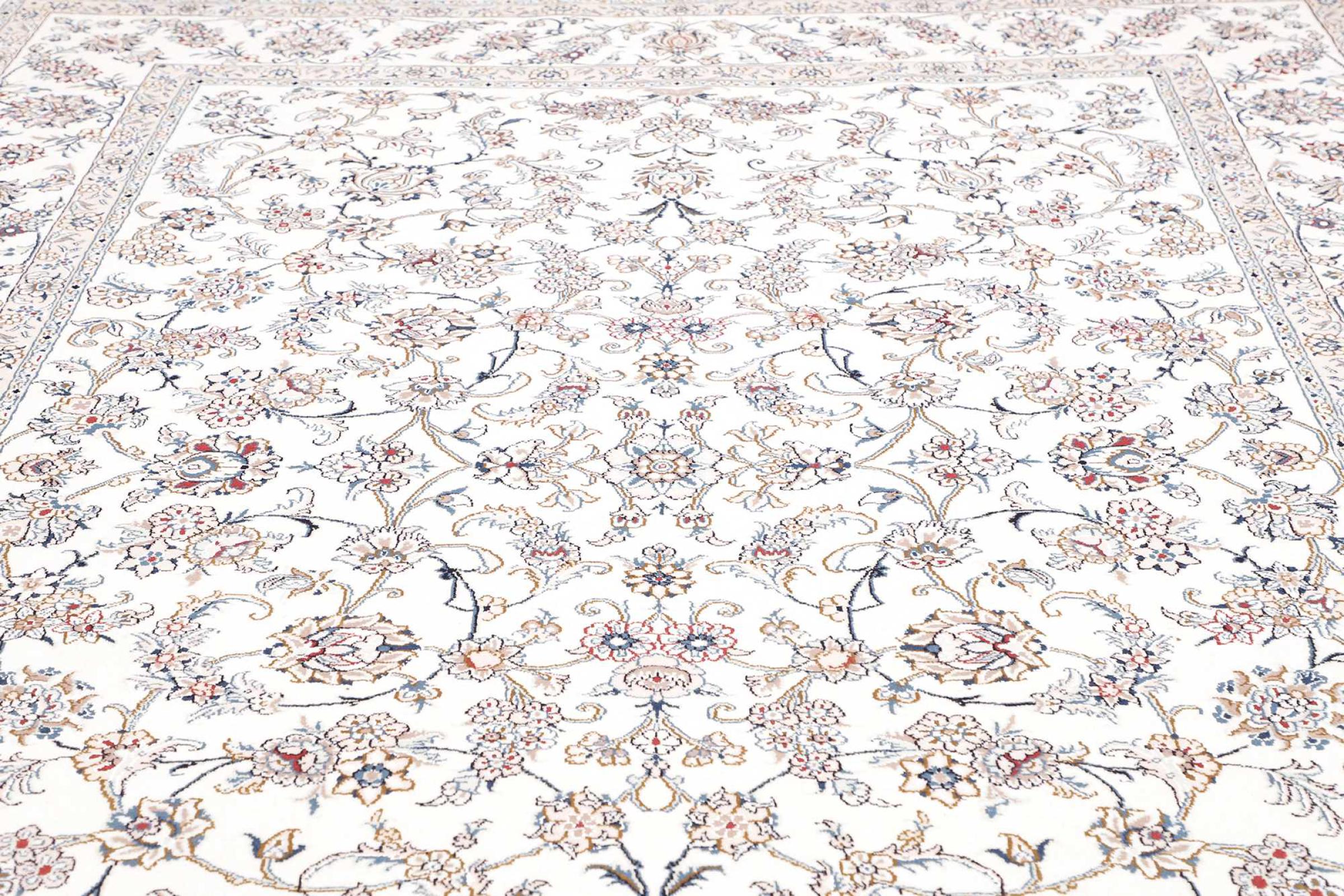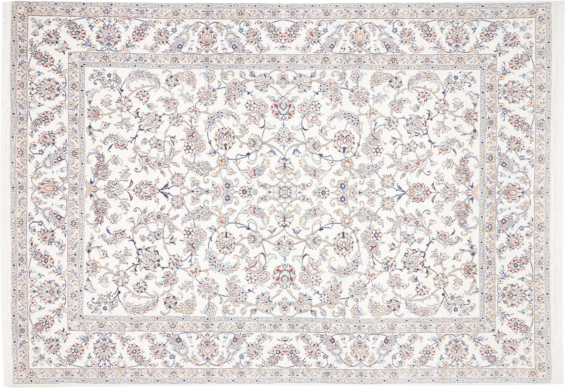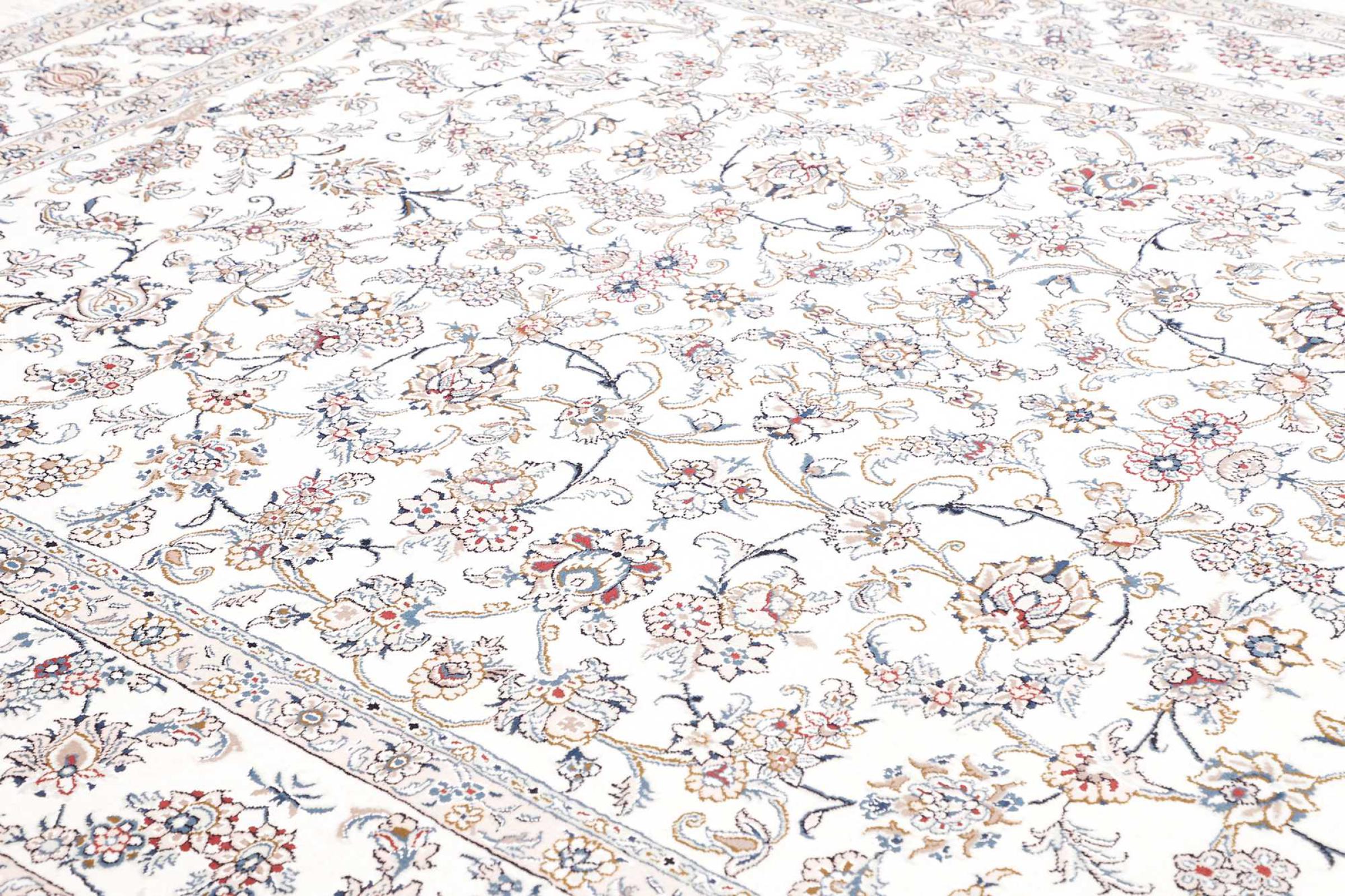 Esta alfombra Nain está clasificada como 12La. Tiene un aspecto elegante y refinado con su colorido típico de Naín. Esta alfombra persa fue anudada a mano en la ciudad de Naín, situada en el extremo occidental del desierto de Dasht-e-Kavir, con lana de alta calidad y seda natural. Con un tamaño de 12La, no está tan finamente detallada con ornamentos como una Nain 9La o 6La.