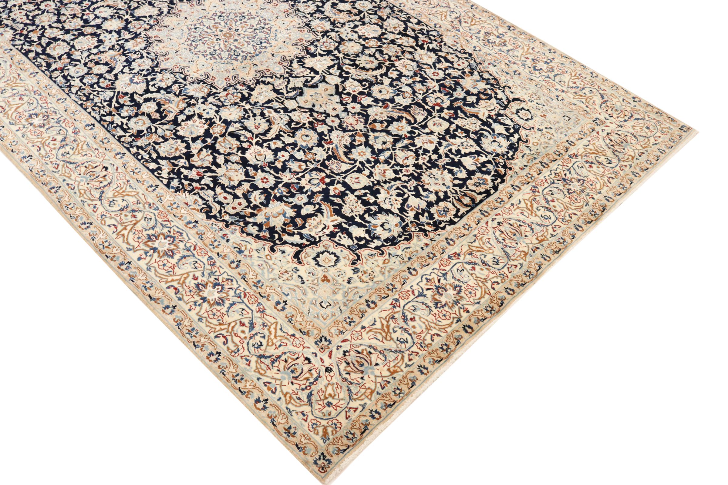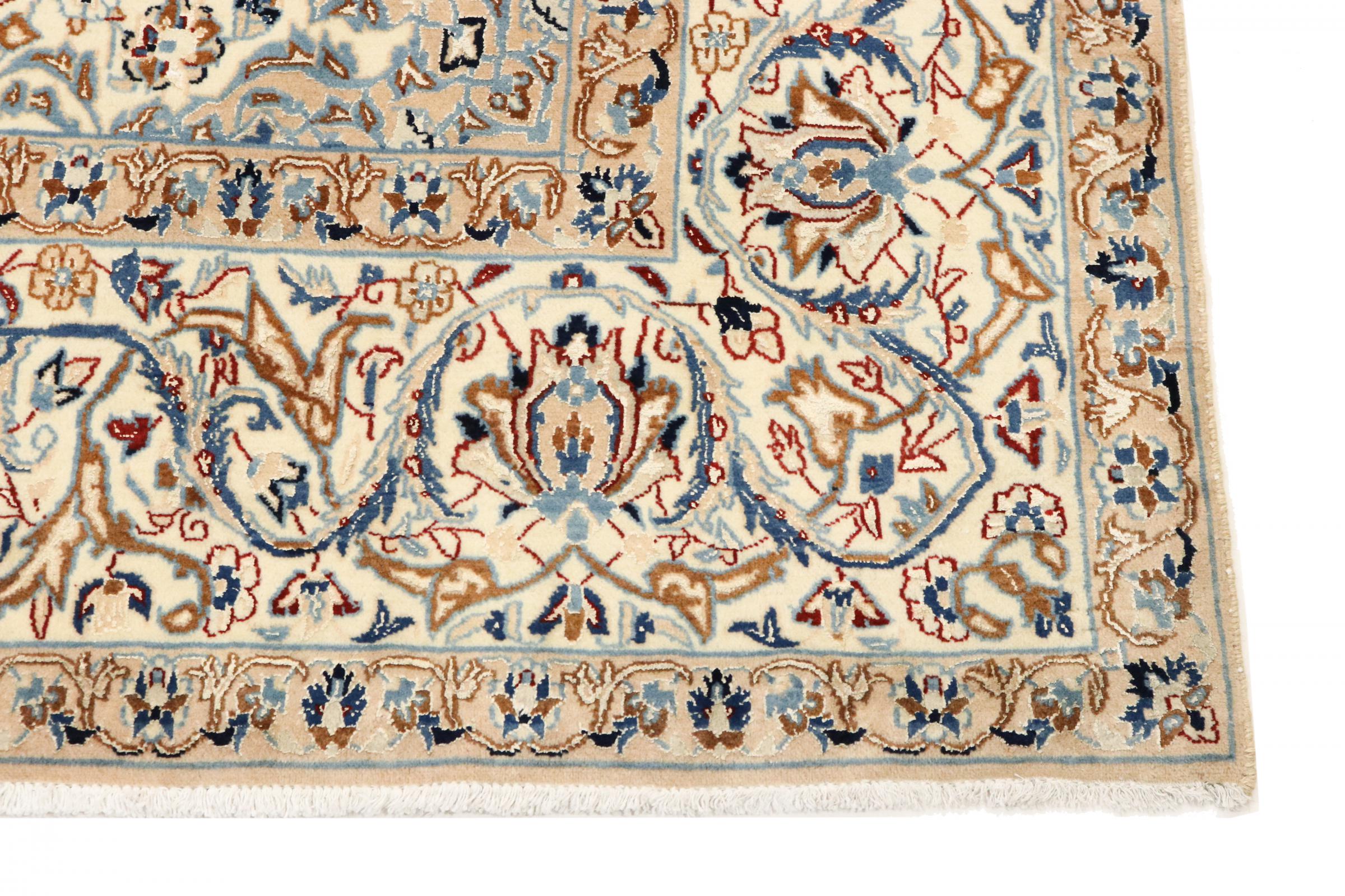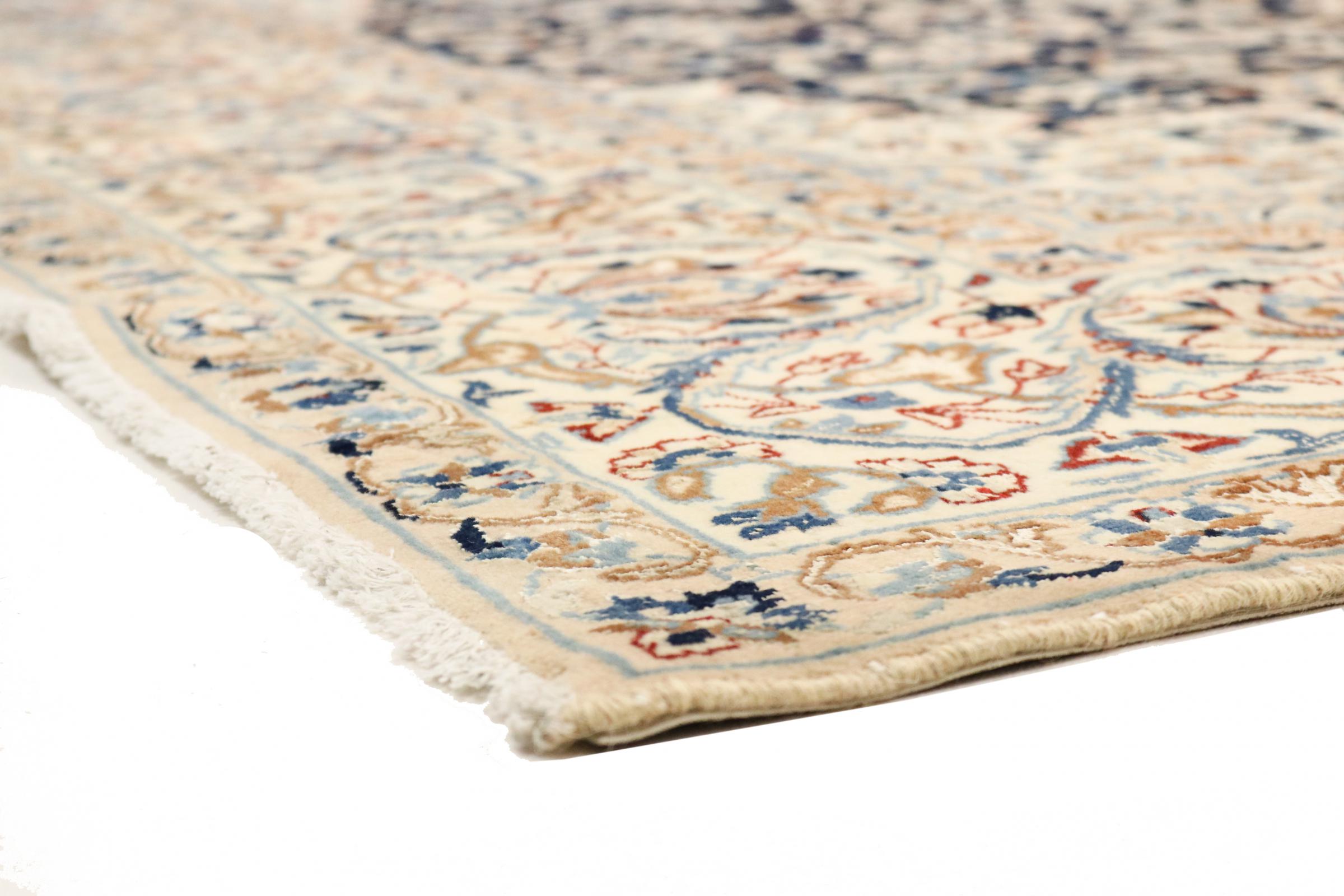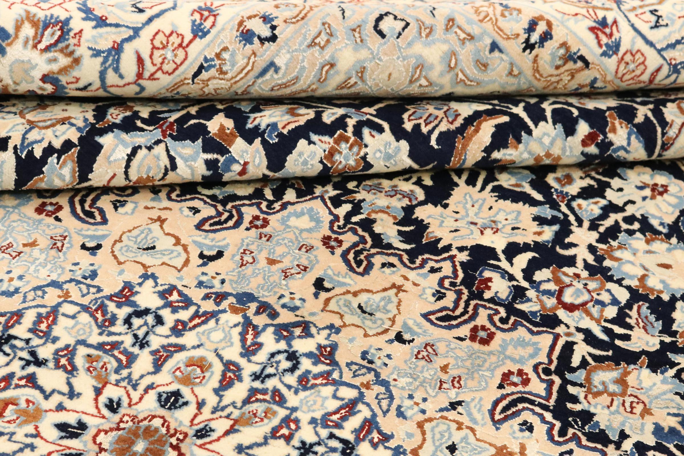 Esta alfombra Nain está clasificada como 12La. Tiene un aspecto elegante y refinado con su colorido típico de Naín. Esta alfombra persa fue anudada a mano en la ciudad de Naín, situada en el extremo occidental del desierto de Dasht-e-Kavir, con lana de alta calidad y seda natural. Con un tamaño de 12La, no está tan finamente detallada con ornamentos como una Nain 9La o 6La.