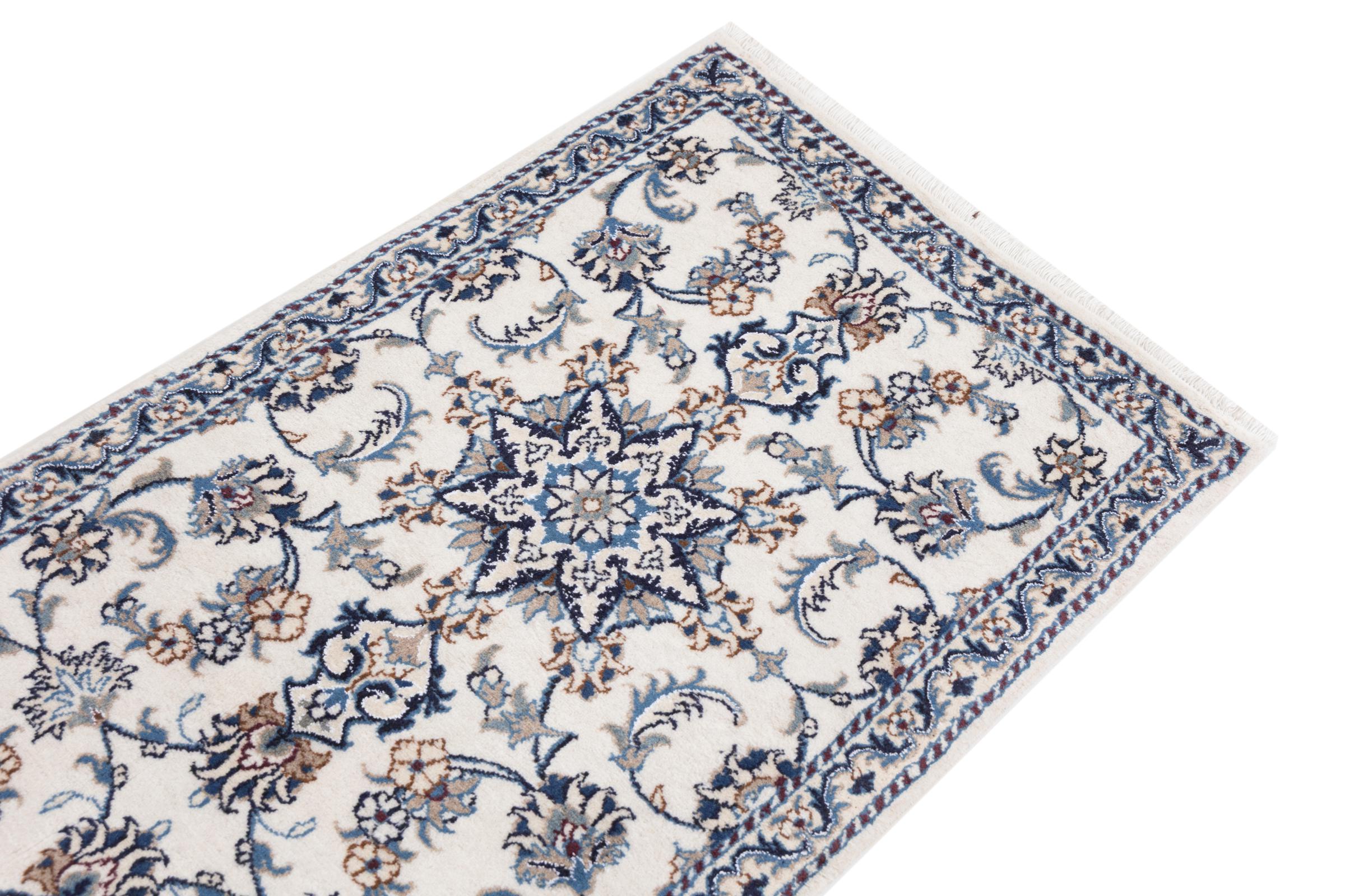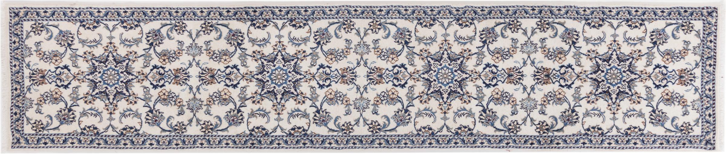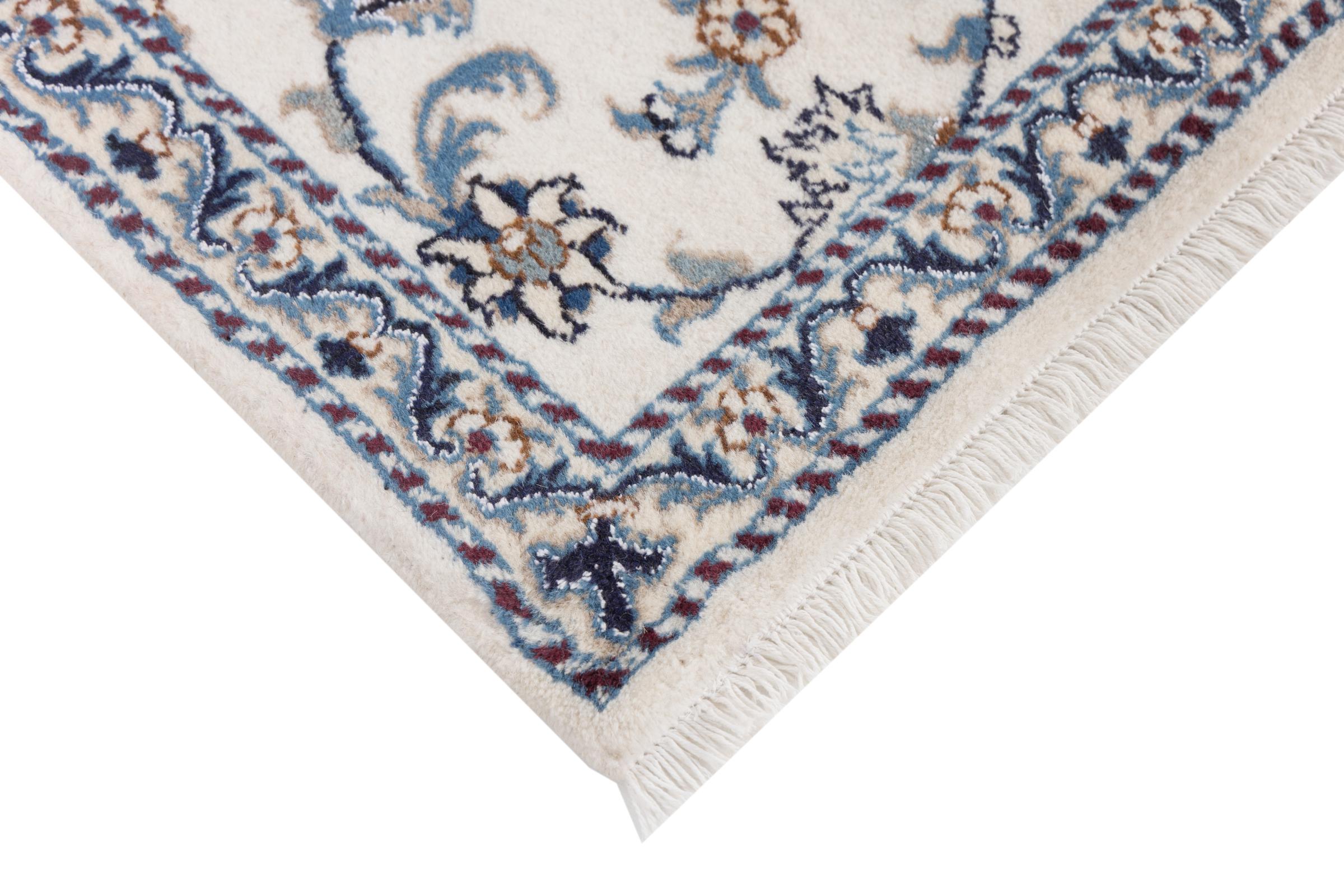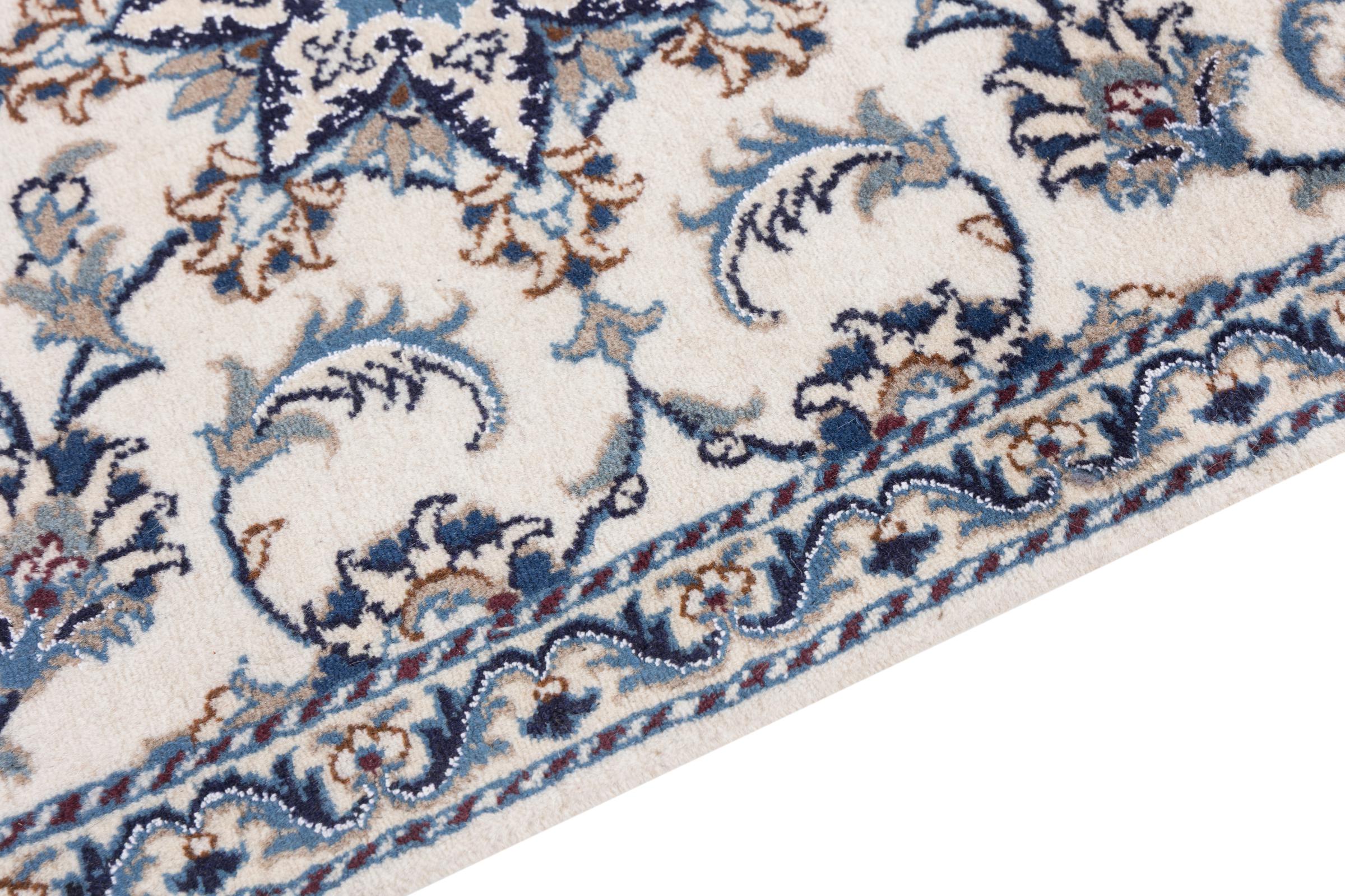 Esta alfombra Nain está clasificada como 12La. Tiene un aspecto elegante y refinado con su colorido típico de Naín. Esta alfombra persa fue anudada a mano en la ciudad de Naín, situada en el extremo occidental del desierto de Dasht-e-Kavir, con lana de alta calidad y seda natural. Con un tamaño de 12La, no está tan finamente detallada con ornamentos como una Nain 9La o 6La.