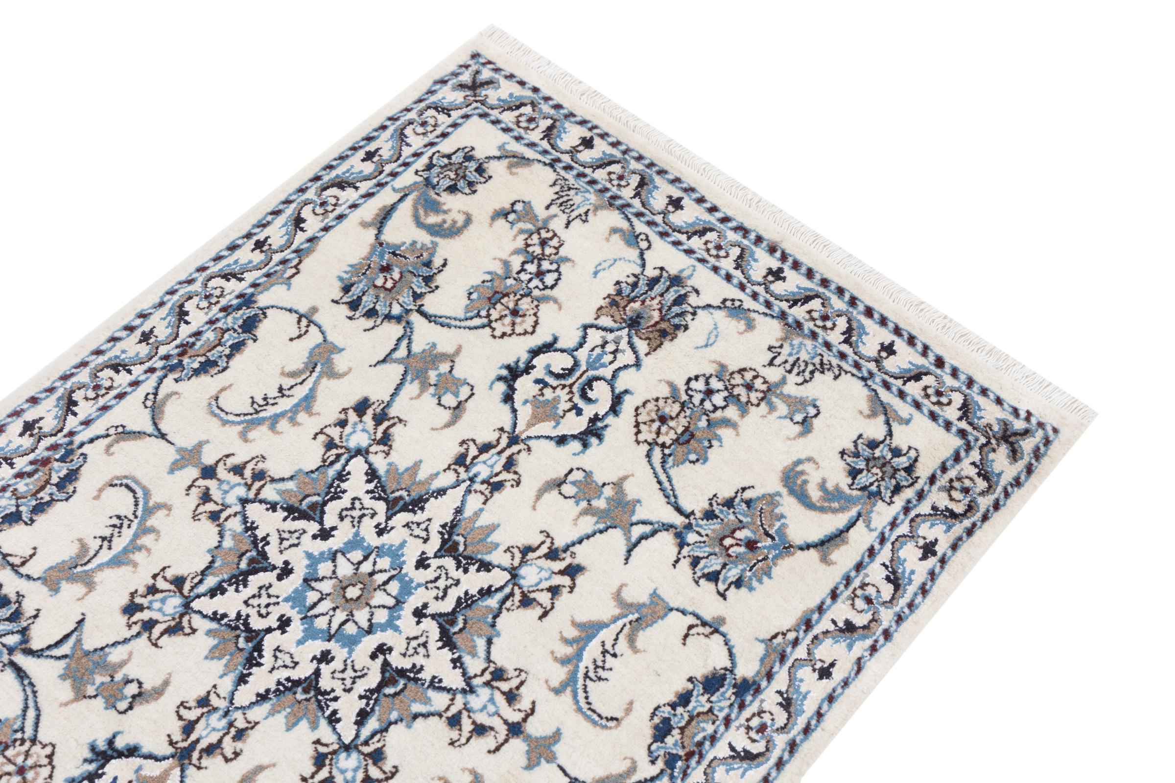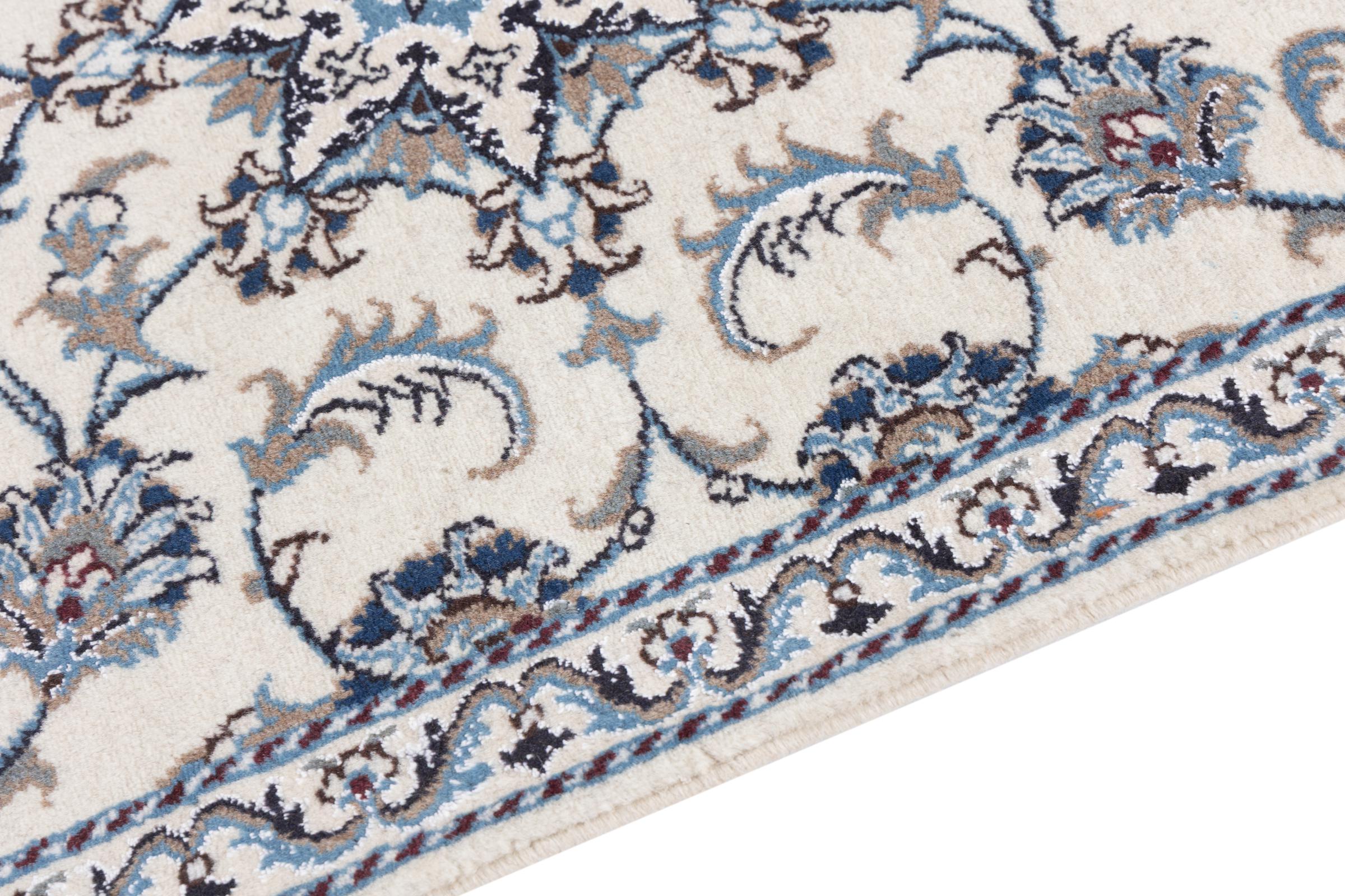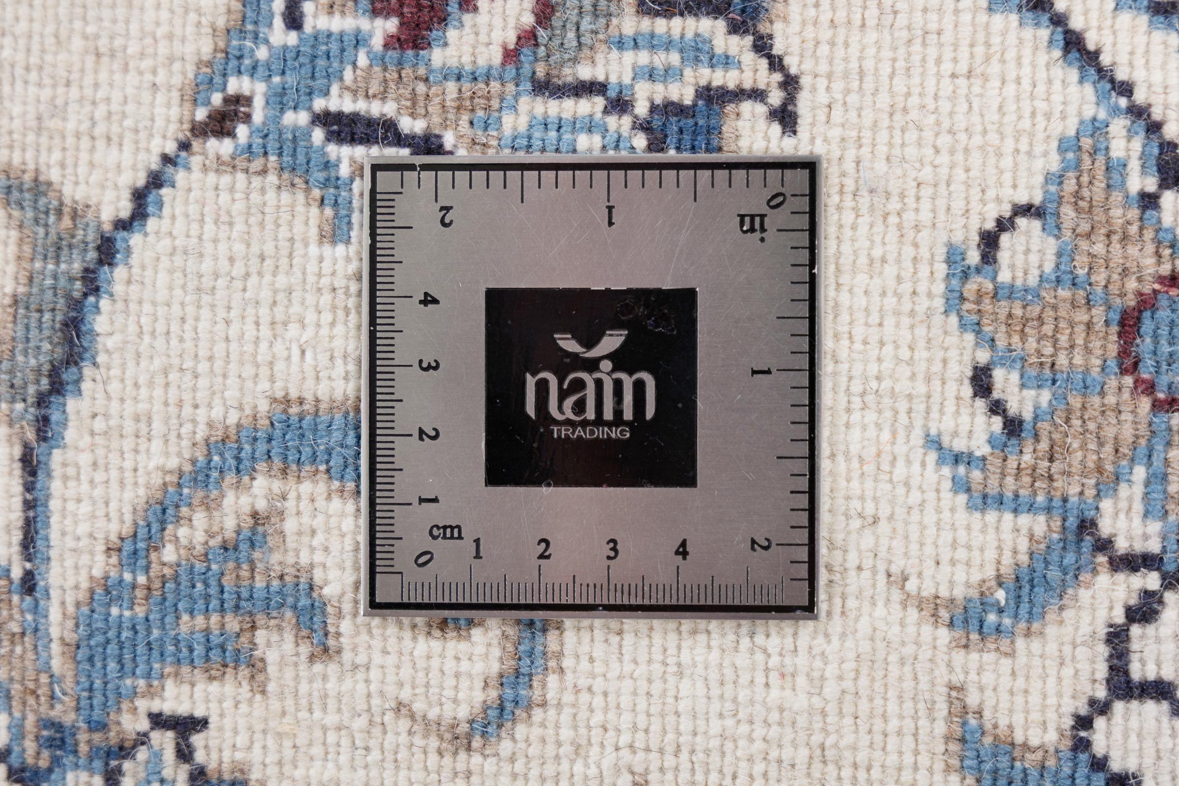 Esta alfombra Nain está clasificada como 12La. Tiene un aspecto elegante y refinado con su colorido típico de Naín. Esta alfombra persa fue anudada a mano en la ciudad de Naín, situada en el extremo occidental del desierto de Dasht-e-Kavir, con lana de alta calidad y seda natural. Con un tamaño de 12La, no está tan finamente detallada con ornamentos como una Nain 9La o 6La.
