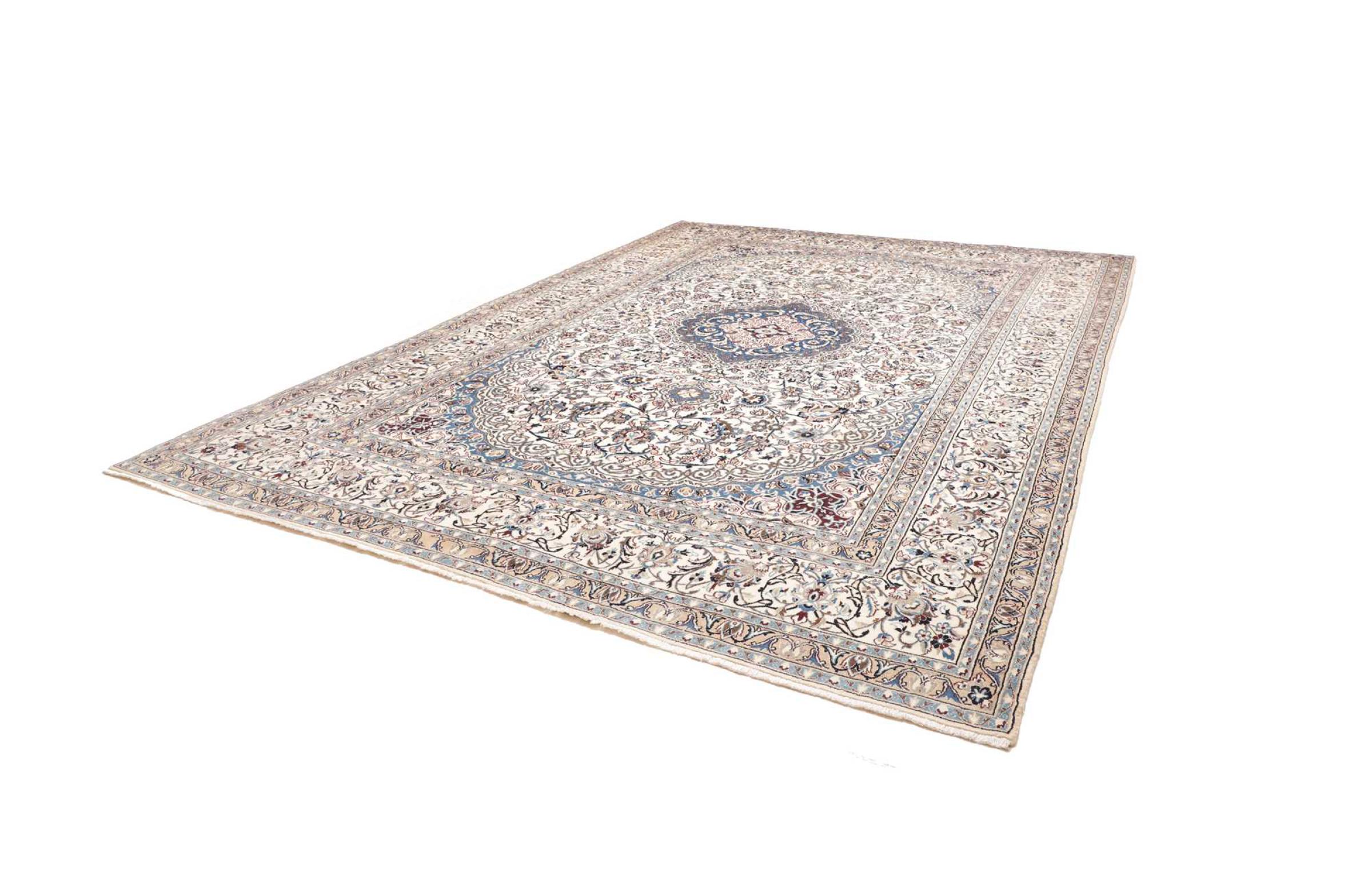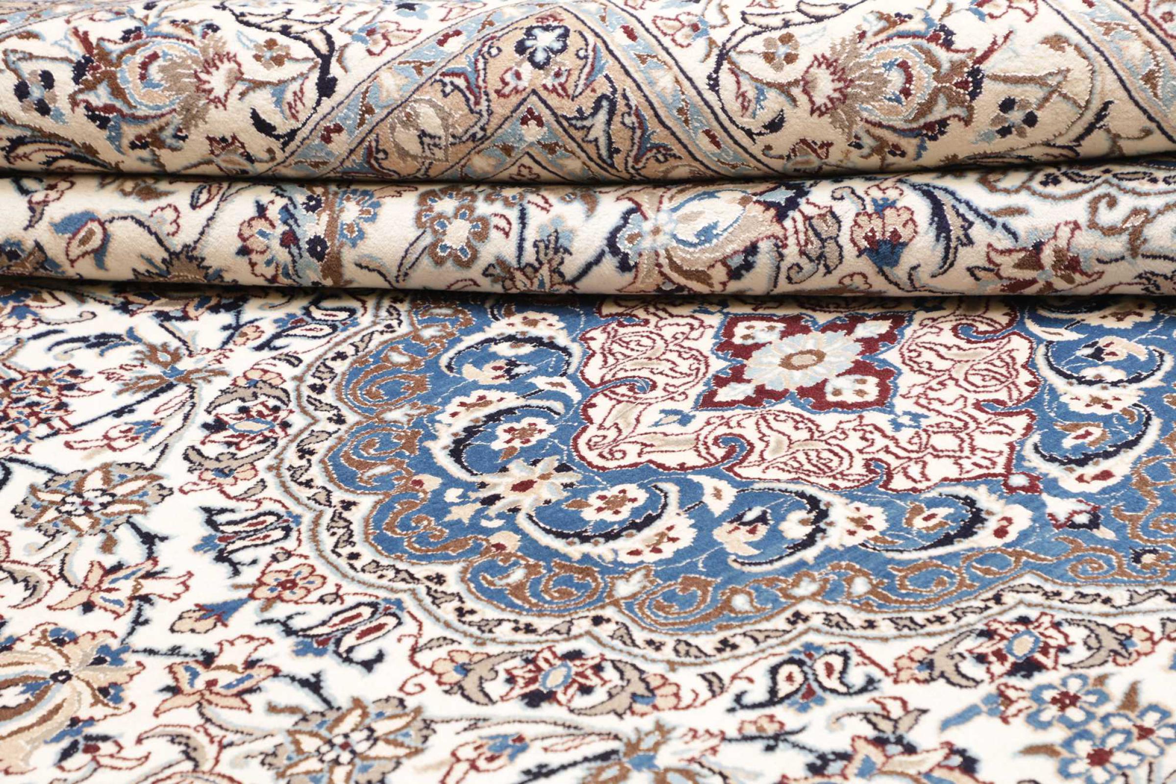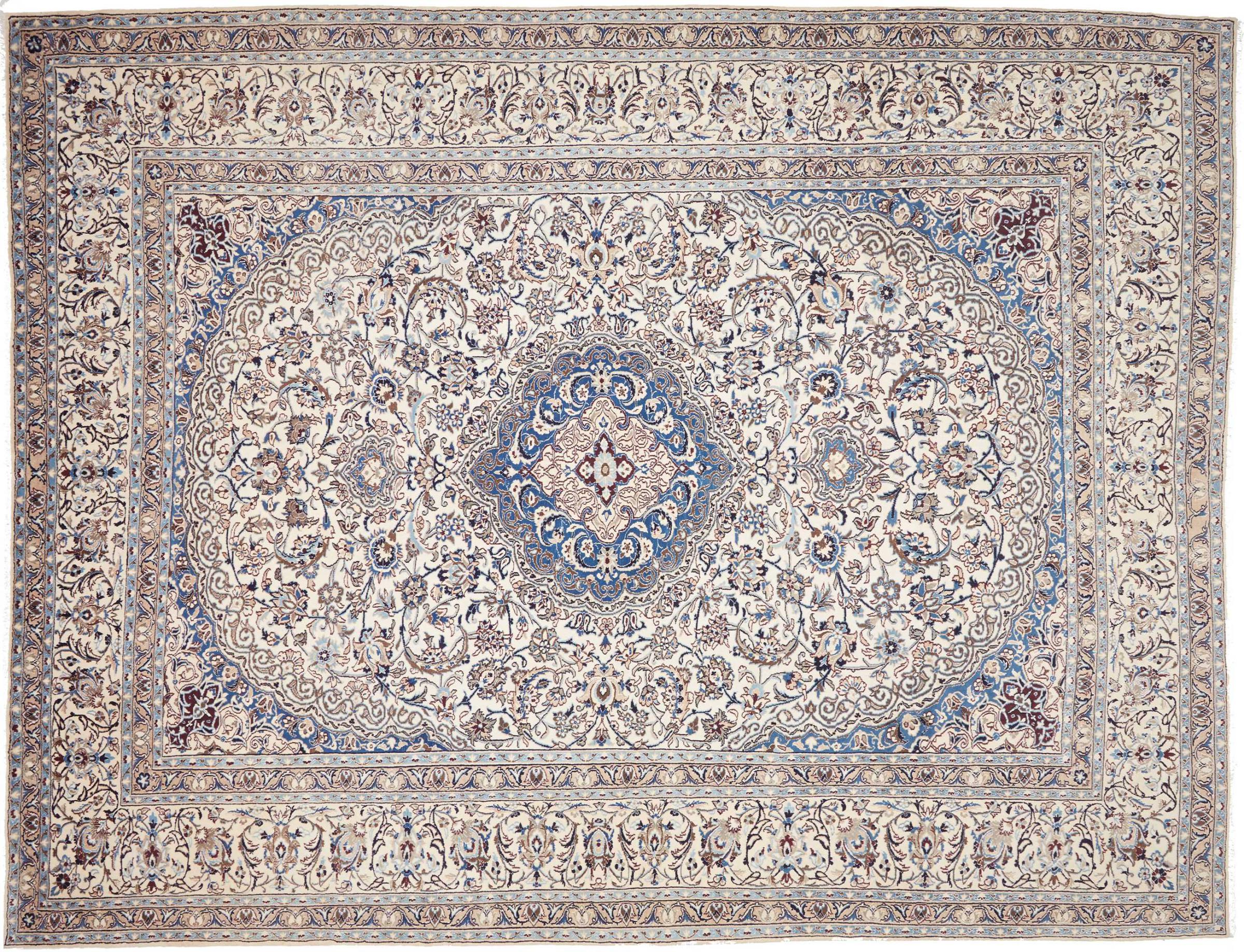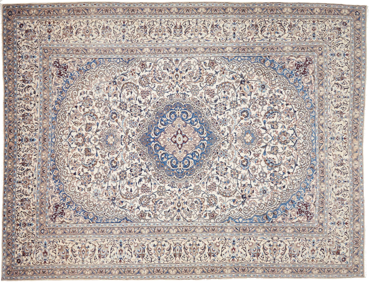 Las alfombras de la ciudad de Nain, en la frontera de uno de los mayores desiertos de Irán, están entre las alfombras persas más famosas del mundo. Su diseño típico es inconfundible con adornos florales, un medallón central y tonos beige y rojo o azul. Gracias a sus designaciones 4La, 6La, 9La y 12La, las sutilezas de una alfombra de Nain se pueden ver a simple vista. Cuanto más bajo sea el número "La", más alta es la densidad del nudo y por lo tanto más fina es la alfombra.