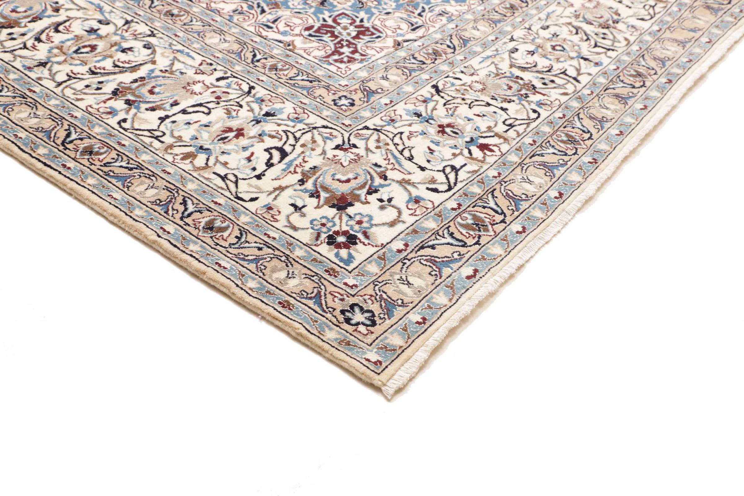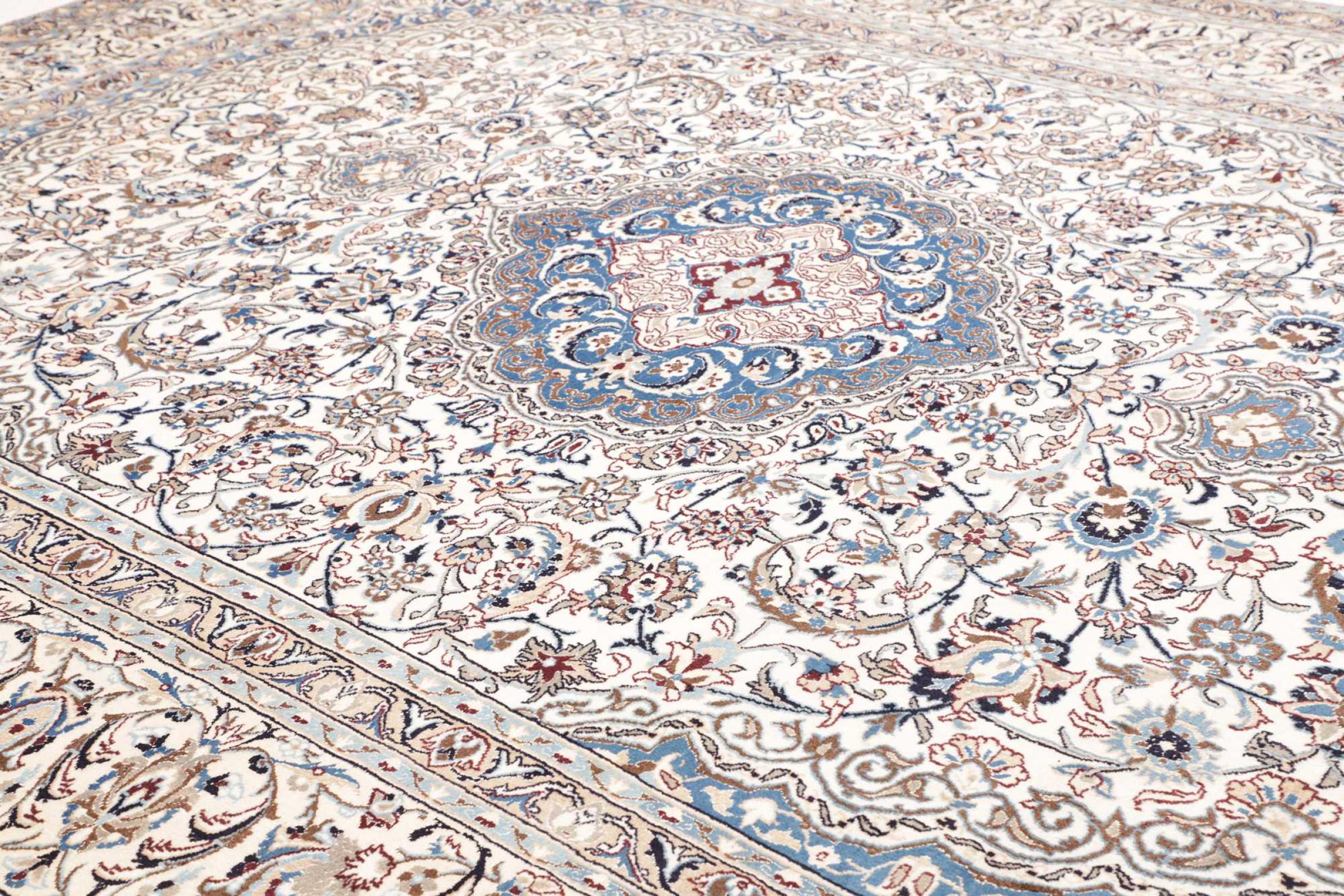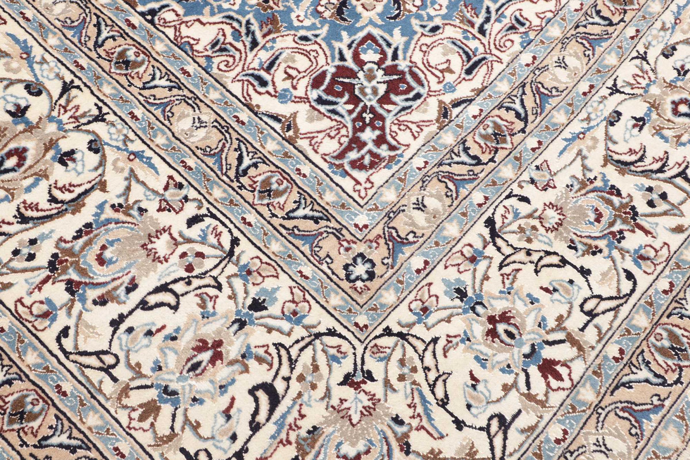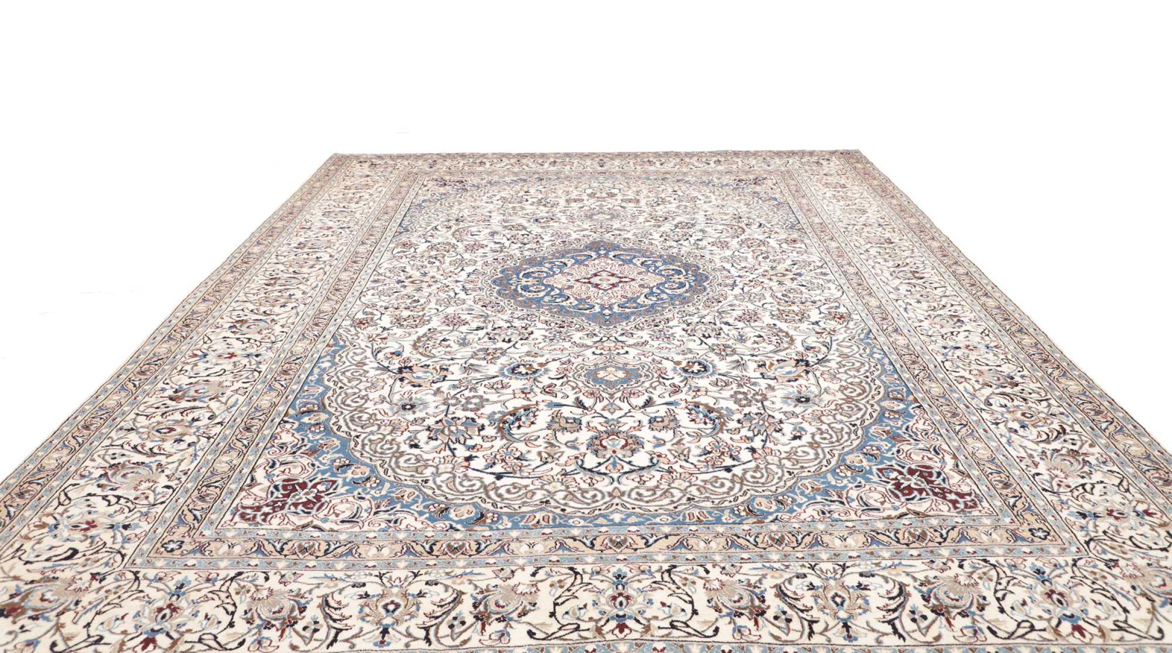 Las alfombras de la ciudad de Nain, en la frontera de uno de los mayores desiertos de Irán, están entre las alfombras persas más famosas del mundo. Su diseño típico es inconfundible con adornos florales, un medallón central y tonos beige y rojo o azul. Gracias a sus designaciones 4La, 6La, 9La y 12La, las sutilezas de una alfombra de Nain se pueden ver a simple vista. Cuanto más bajo sea el número "La", más alta es la densidad del nudo y por lo tanto más fina es la alfombra.