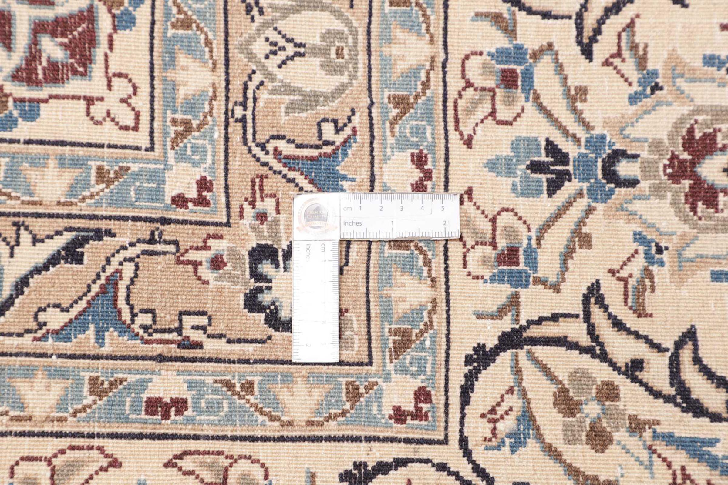 Esta alfombra Nain está clasificada como 12La. Tiene un aspecto elegante y refinado con su colorido típico de Naín. Esta alfombra persa fue anudada a mano en la ciudad de Naín, situada en el extremo occidental del desierto de Dasht-e-Kavir, con lana de alta calidad y seda natural. Con un tamaño de 12La, no está tan finamente detallada con ornamentos como una Nain 9La o 6La.