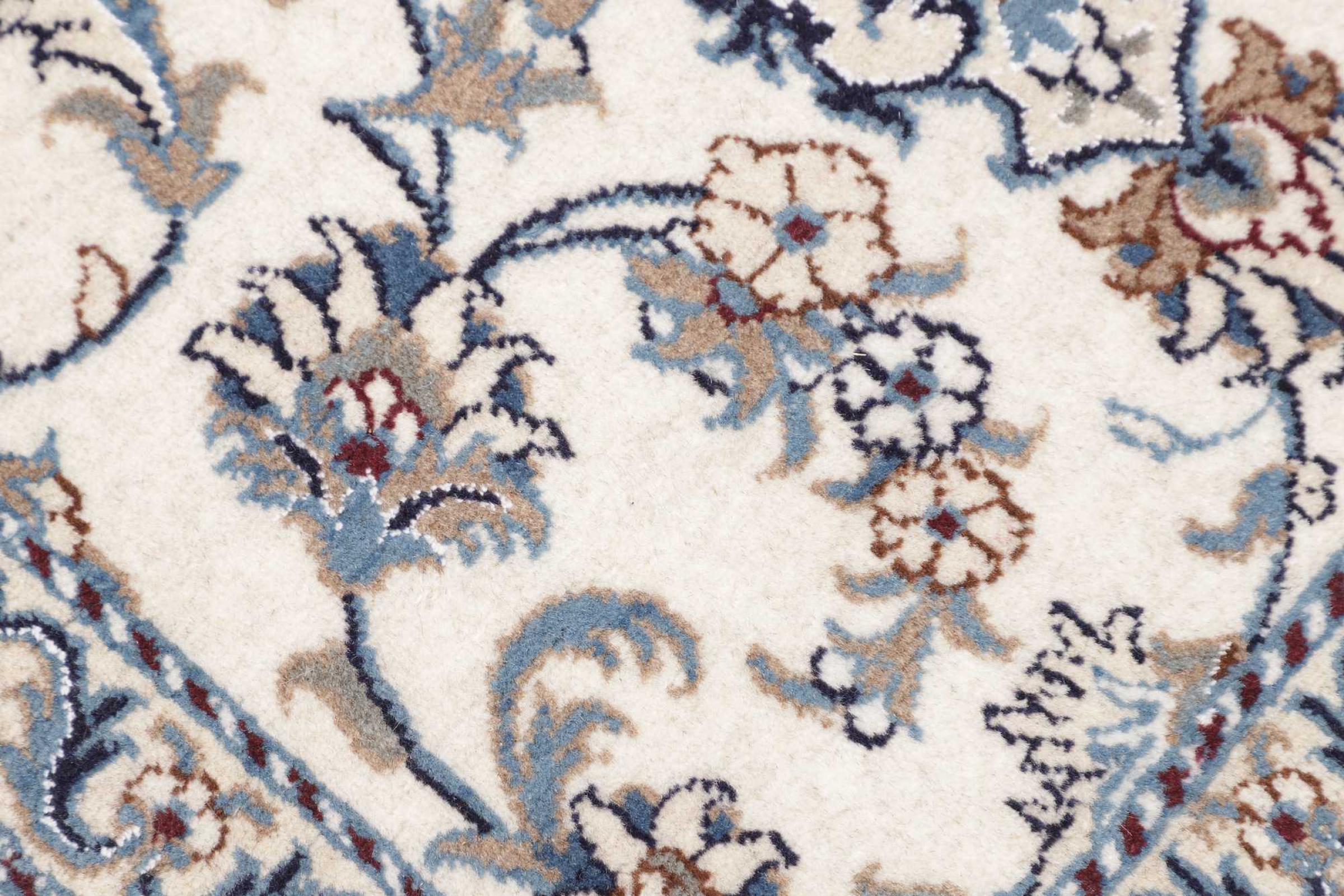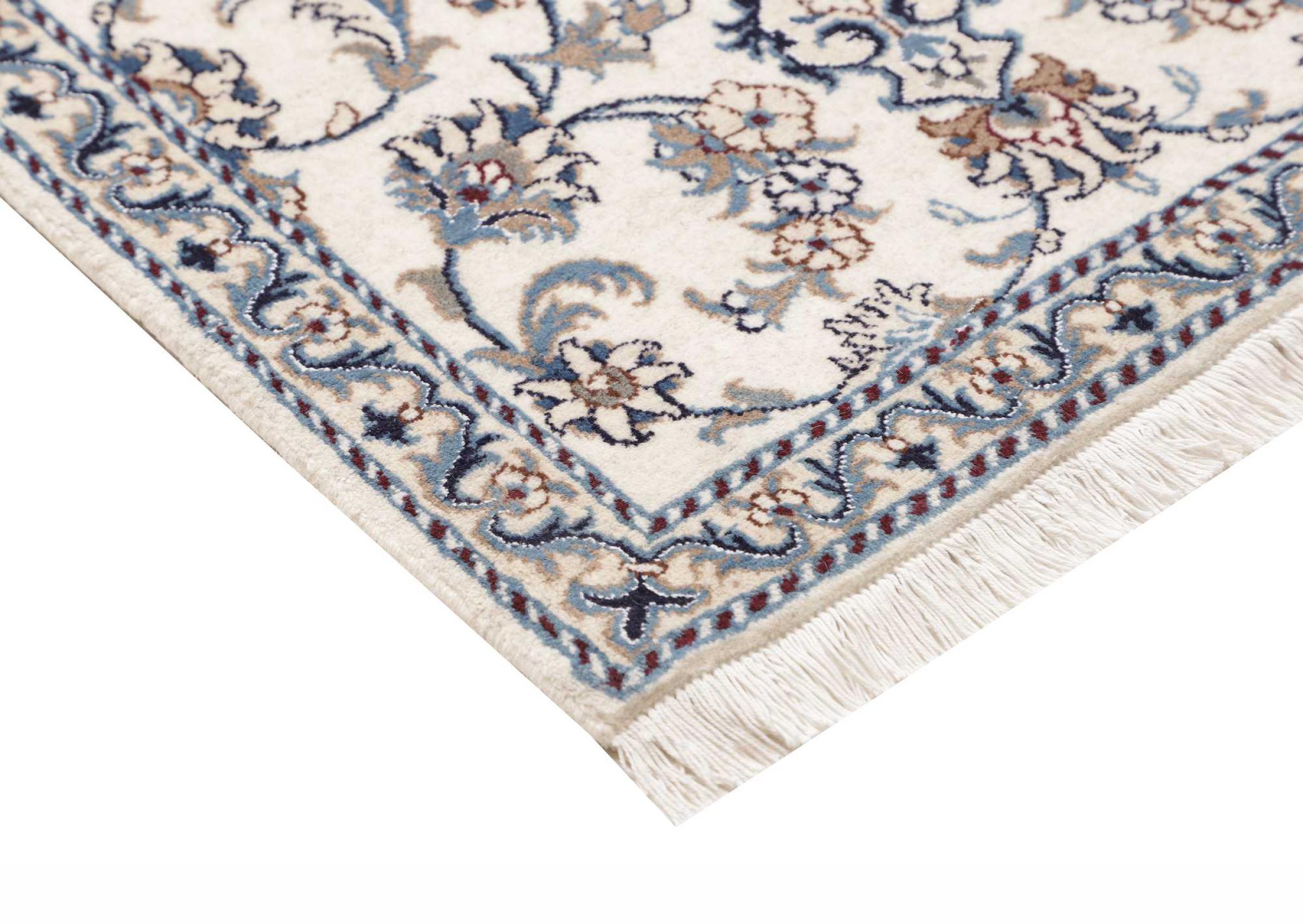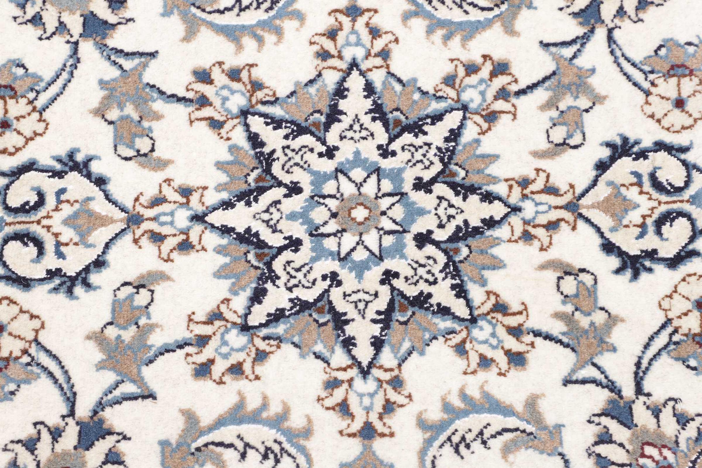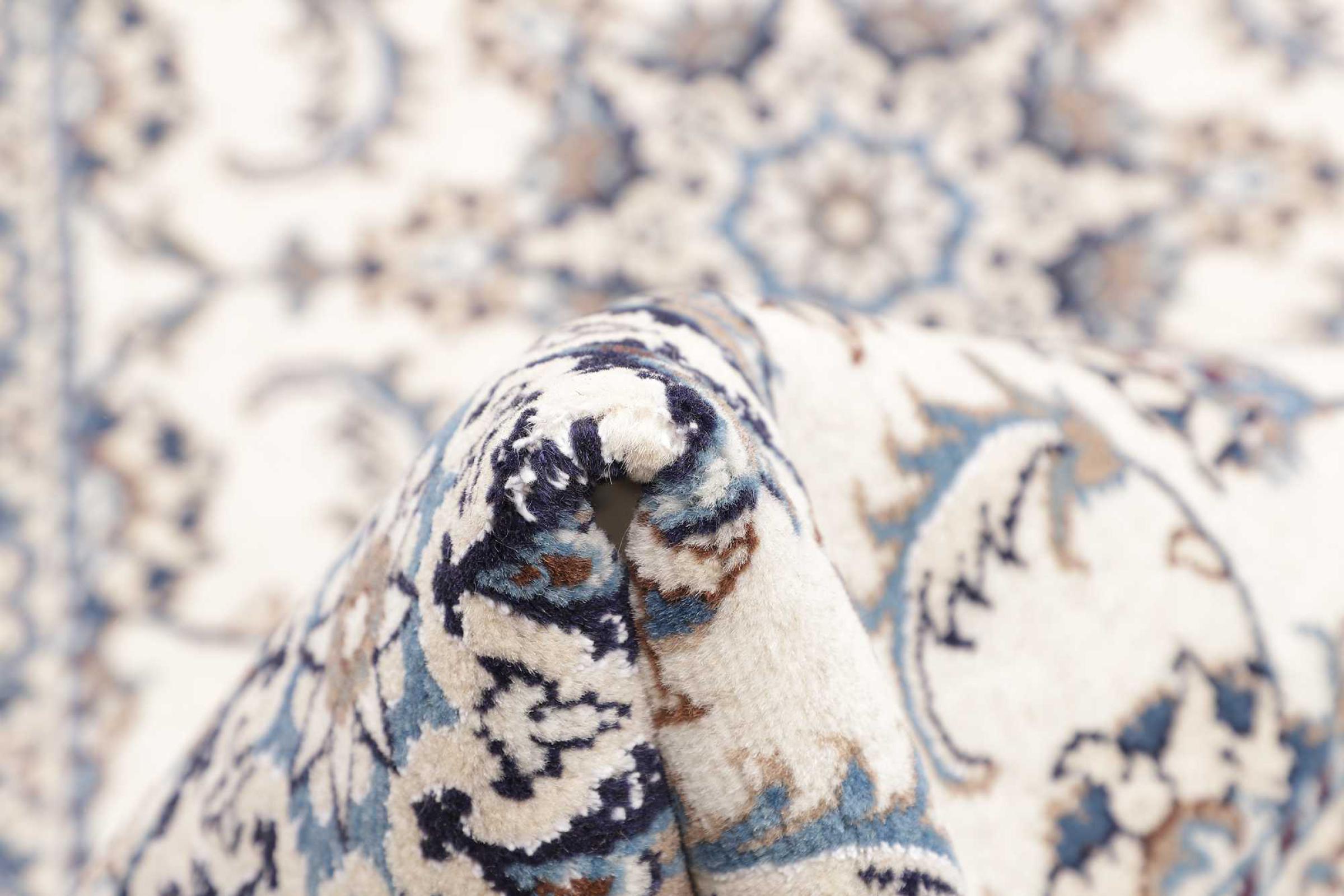 Las alfombras de la ciudad de Nain, en la frontera de uno de los mayores desiertos de Irán, están entre las alfombras persas más famosas del mundo. Su diseño típico es inconfundible con adornos florales, un medallón central y tonos beige y rojo o azul. Gracias a sus designaciones 4La, 6La, 9La y 12La, las sutilezas de una alfombra de Nain se pueden ver a simple vista. Cuanto más bajo sea el número "La", más alta es la densidad del nudo y por lo tanto más fina es la alfombra.