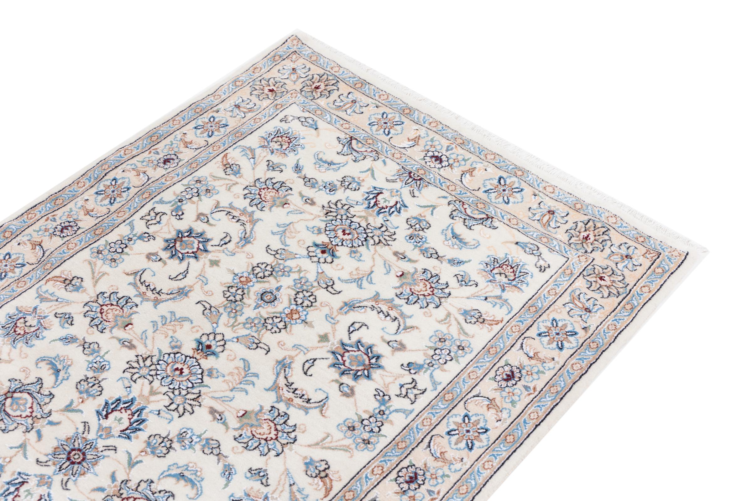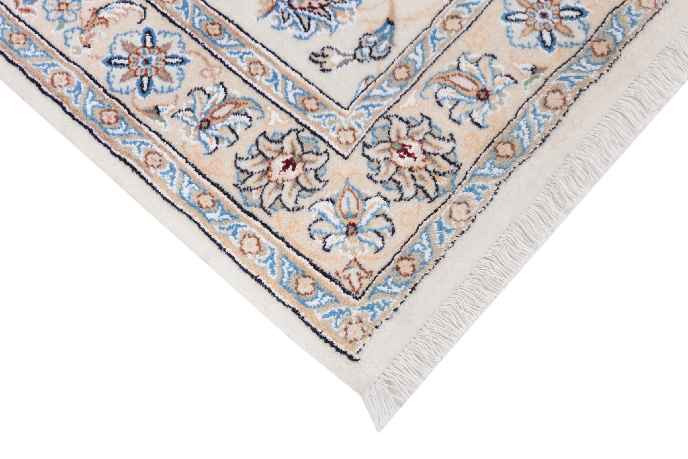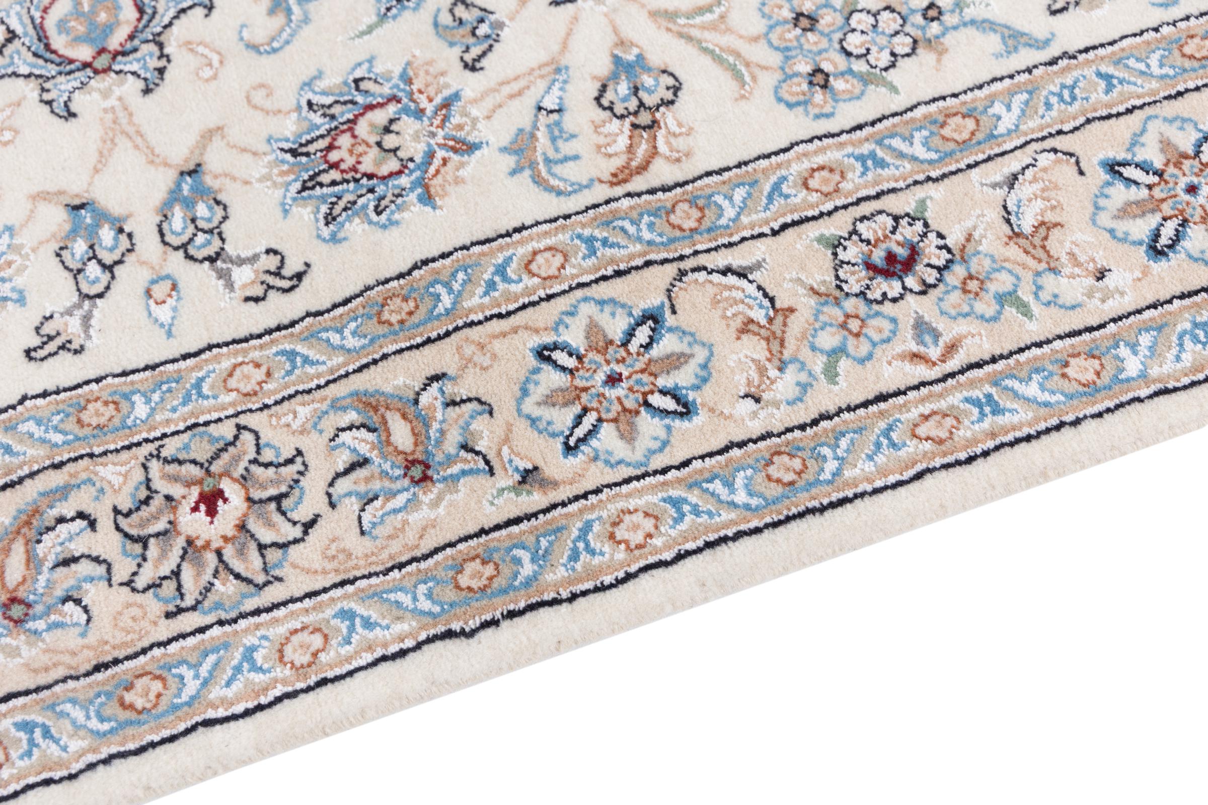 Esta alfombra Nain está clasificada como 9La. Su excelente calidad y su bello diseño oriental con motivos curvilíneos harán las delicias de cualquier comprador. Esta alfombra persa fue anudada a mano en la ciudad de Nain, situada en el extremo occidental del desierto de Dasht-e-Kavir, con lana de alta calidad y seda natural. Las alfombras Nain 9La son claramente más finas que las 12La y ya muestran bellos detalles.