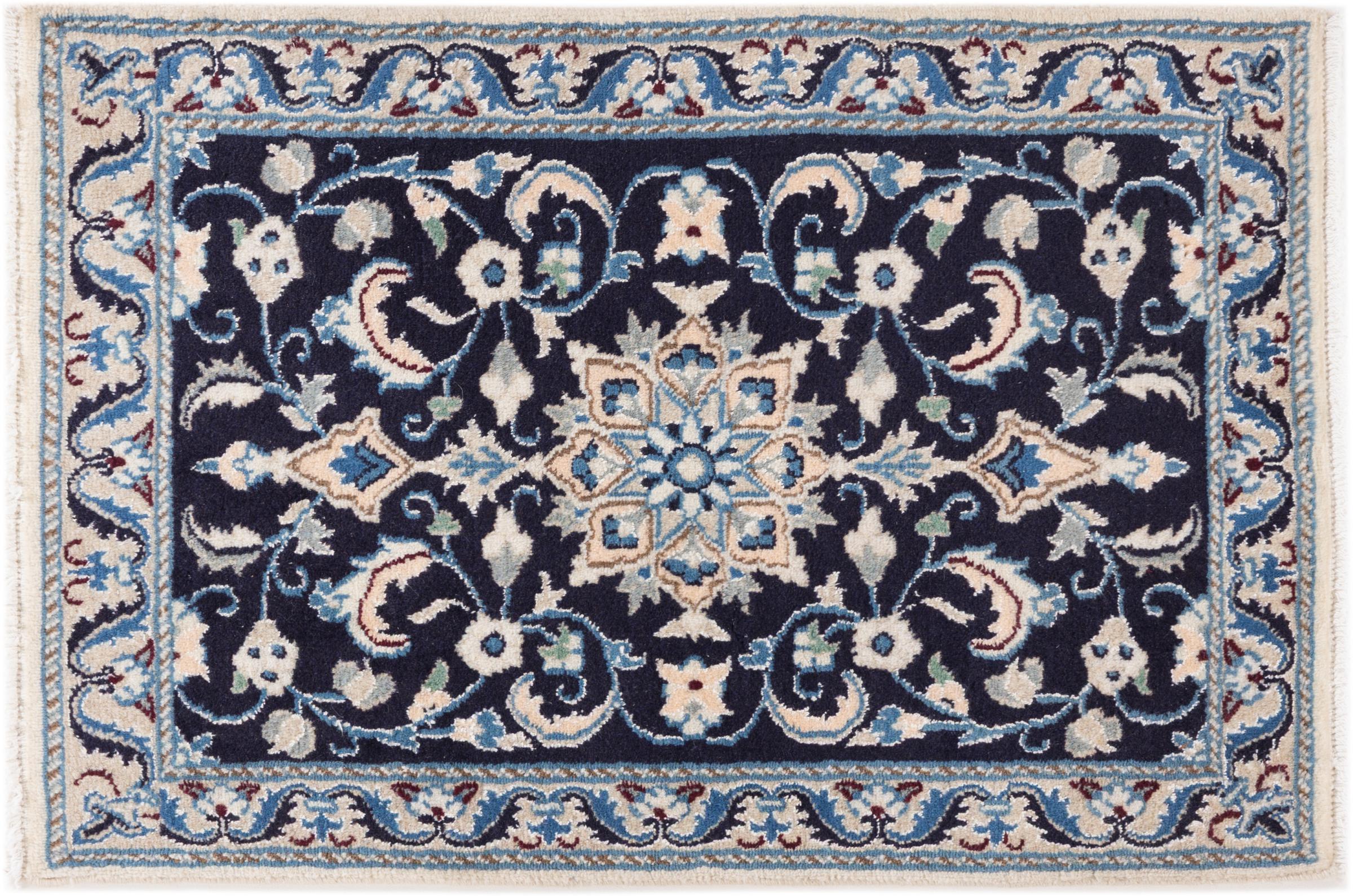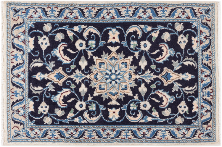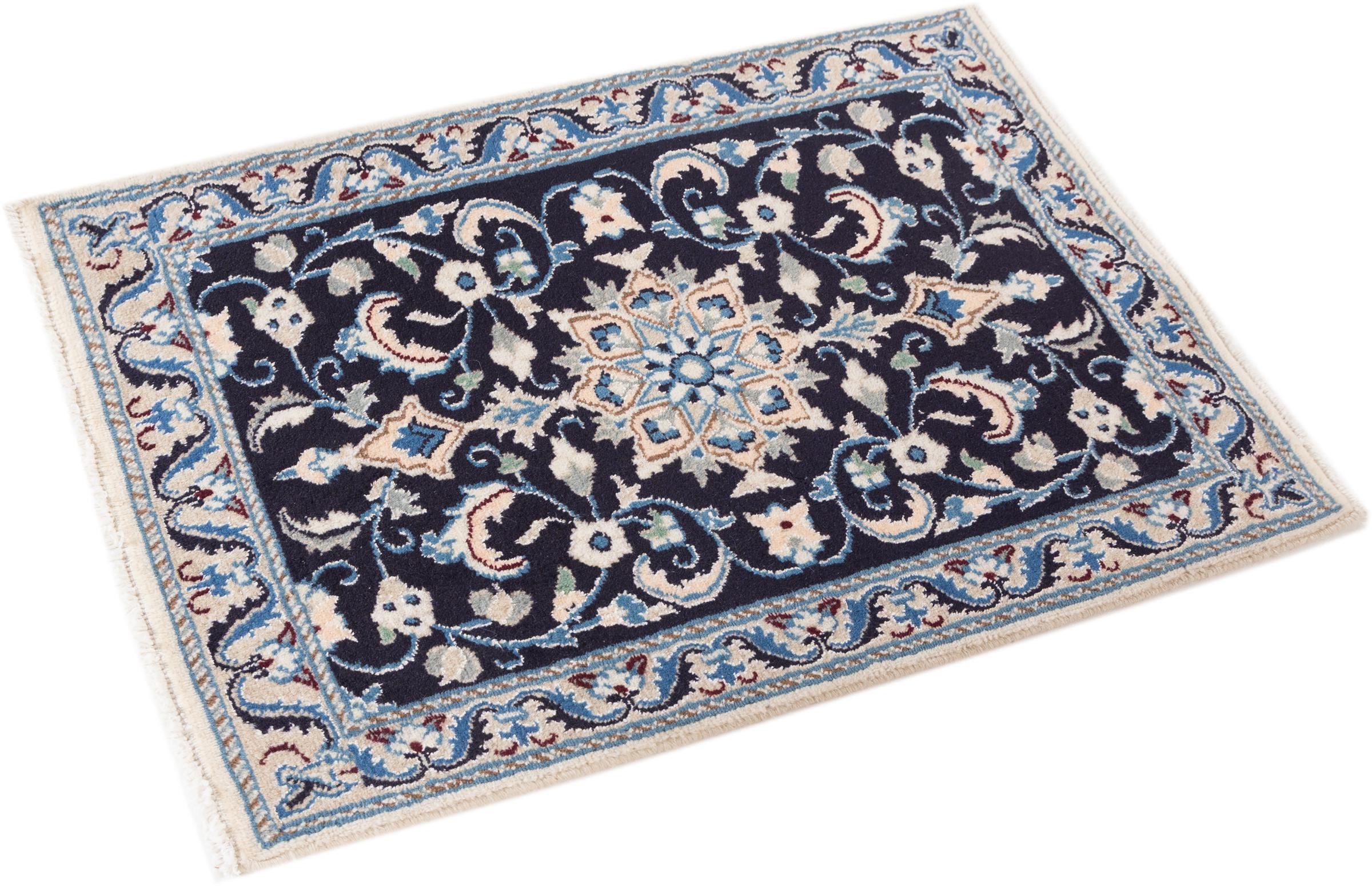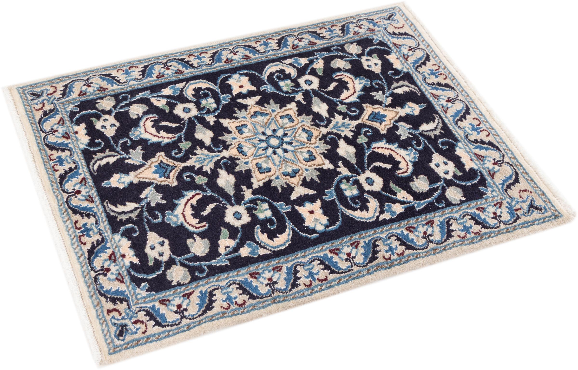 Esta alfombra Nain está clasificada como 9La. Su excelente calidad y su bello diseño oriental con motivos curvilíneos harán las delicias de cualquier comprador. Esta alfombra persa fue anudada a mano en la ciudad de Nain, situada en el extremo occidental del desierto de Dasht-e-Kavir, con lana de alta calidad y seda natural. Las alfombras Nain 9La son claramente más finas que las 12La y ya muestran bellos detalles.