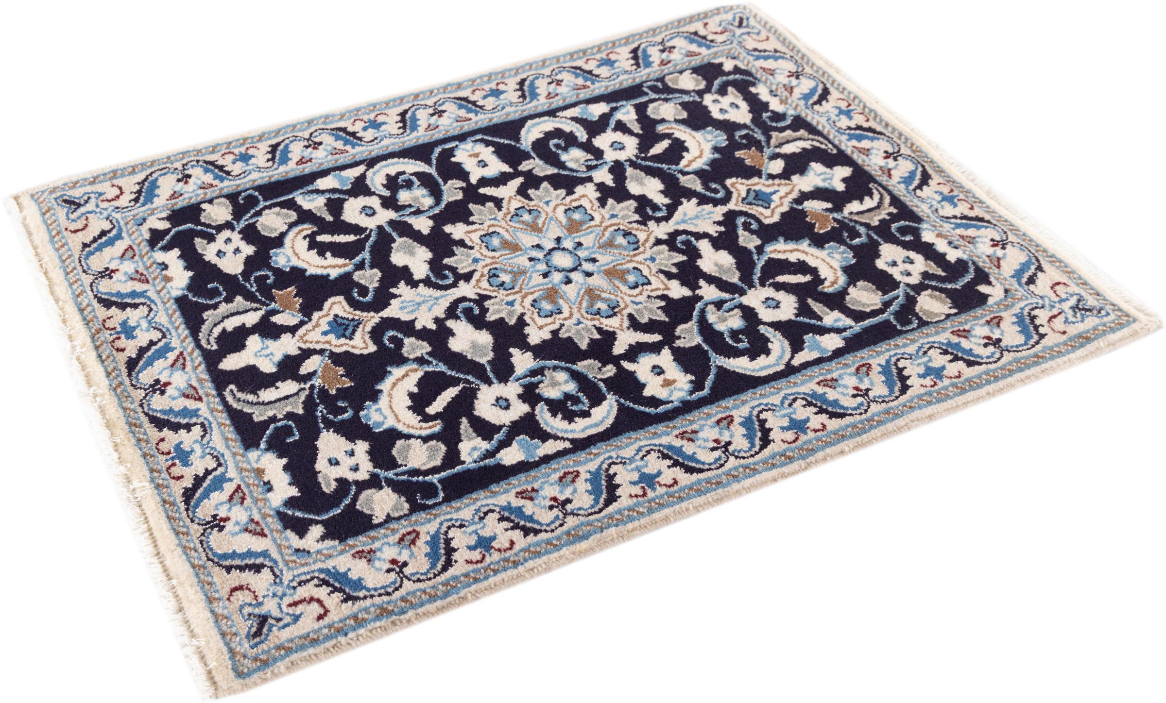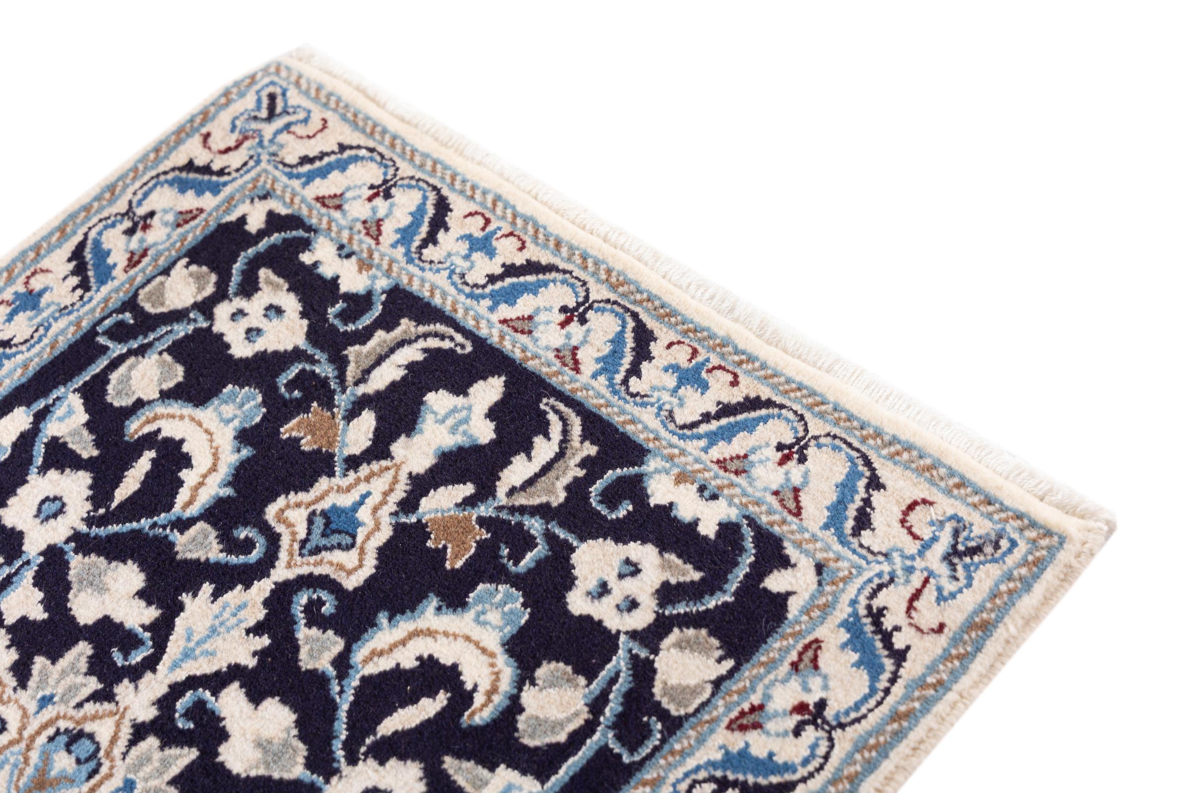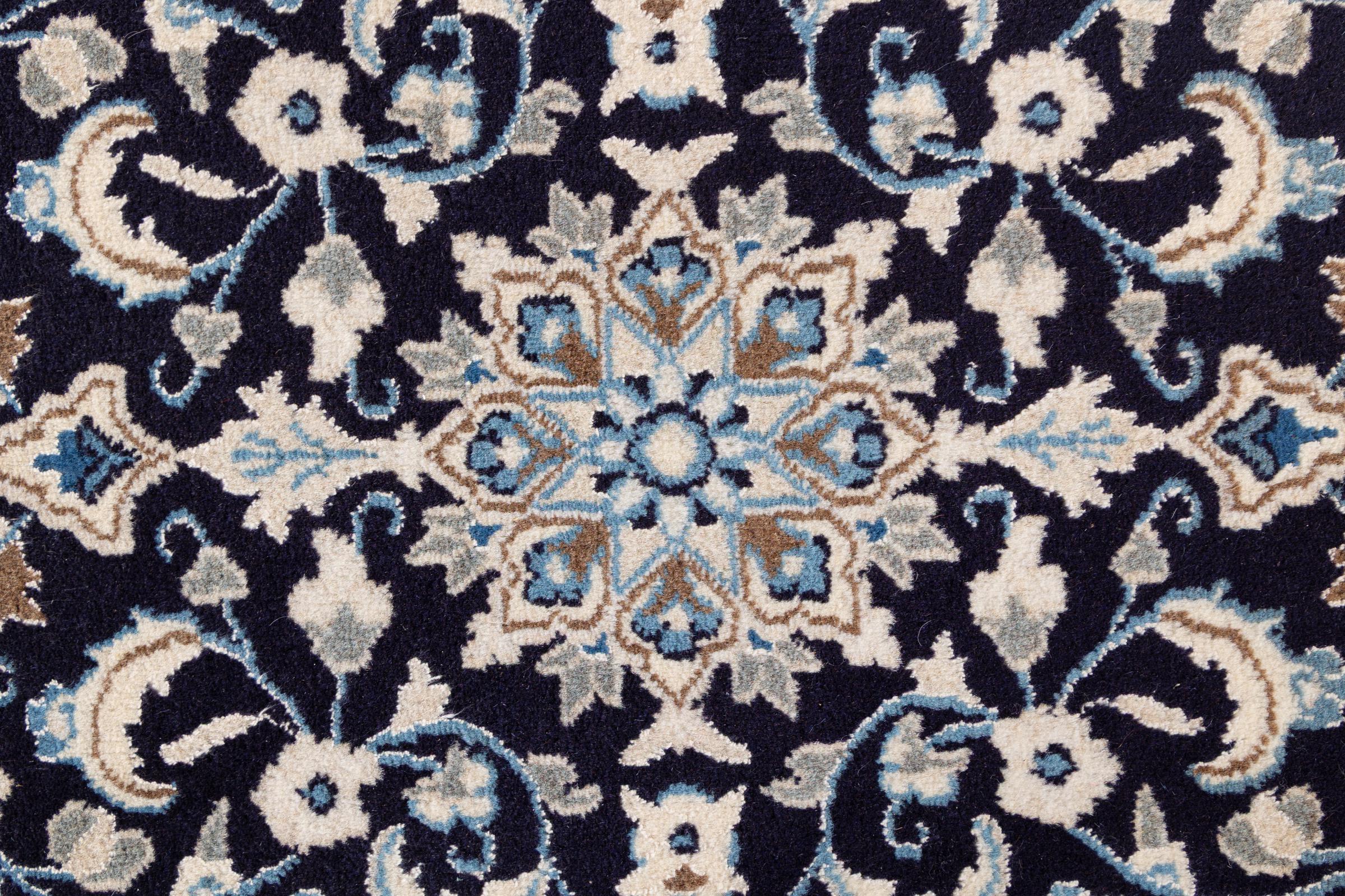Esta alfombra Nain está clasificada como 9La. Su excelente calidad y su bello diseño oriental con motivos curvilíneos harán las delicias de cualquier comprador. Esta alfombra persa fue anudada a mano en la ciudad de Nain, situada en el extremo occidental del desierto de Dasht-e-Kavir, con lana de alta calidad y seda natural. Las alfombras Nain 9La son claramente más finas que las 12La y ya muestran bellos detalles.