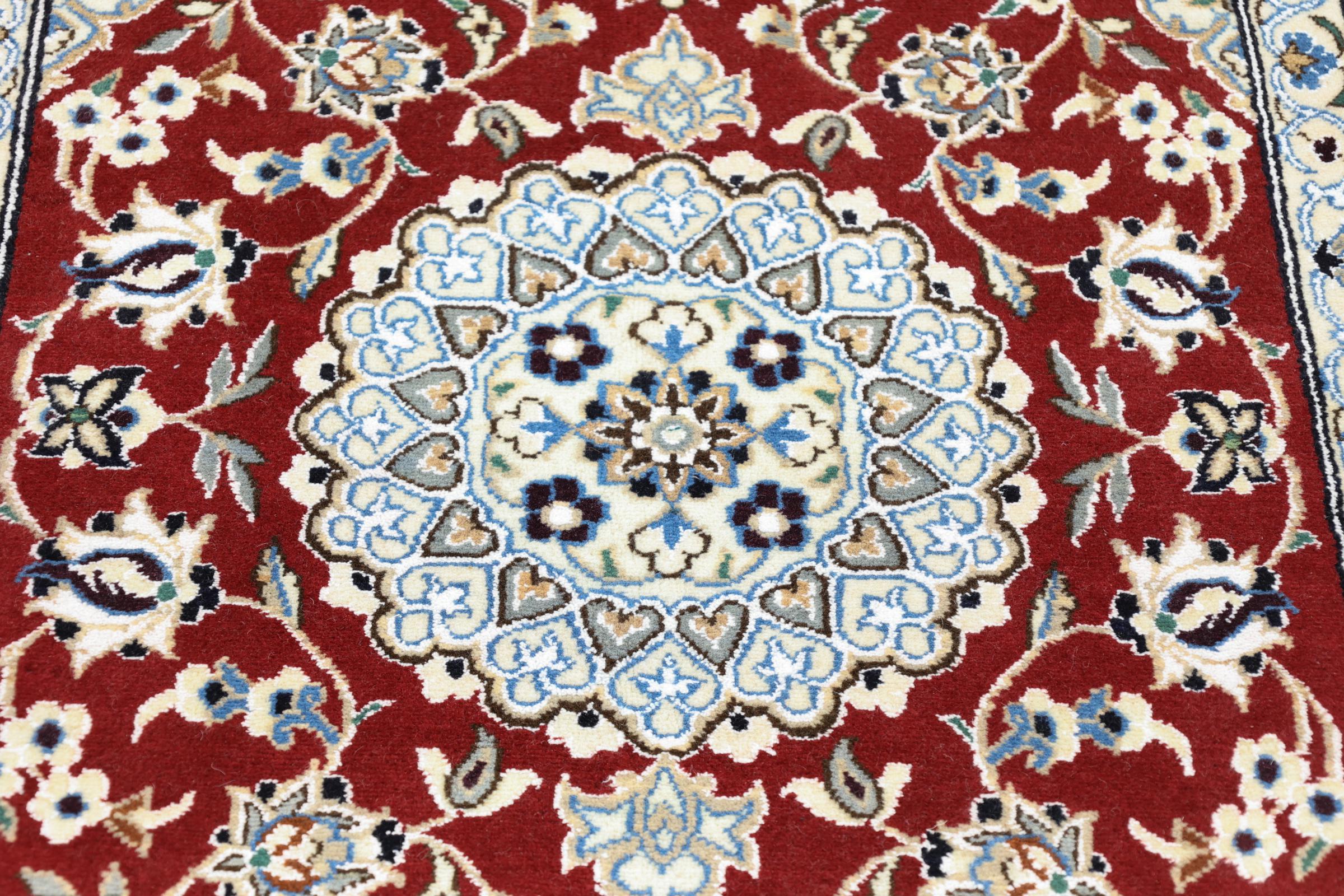 Esta alfombra Nain está clasificada como 9La. Su excelente calidad y su bello diseño oriental con motivos curvilíneos harán las delicias de cualquier comprador. Esta alfombra persa fue anudada a mano en la ciudad de Nain, situada en el extremo occidental del desierto de Dasht-e-Kavir, con lana de alta calidad y seda natural. Las alfombras Nain 9La son claramente más finas que las 12La y ya muestran bellos detalles.