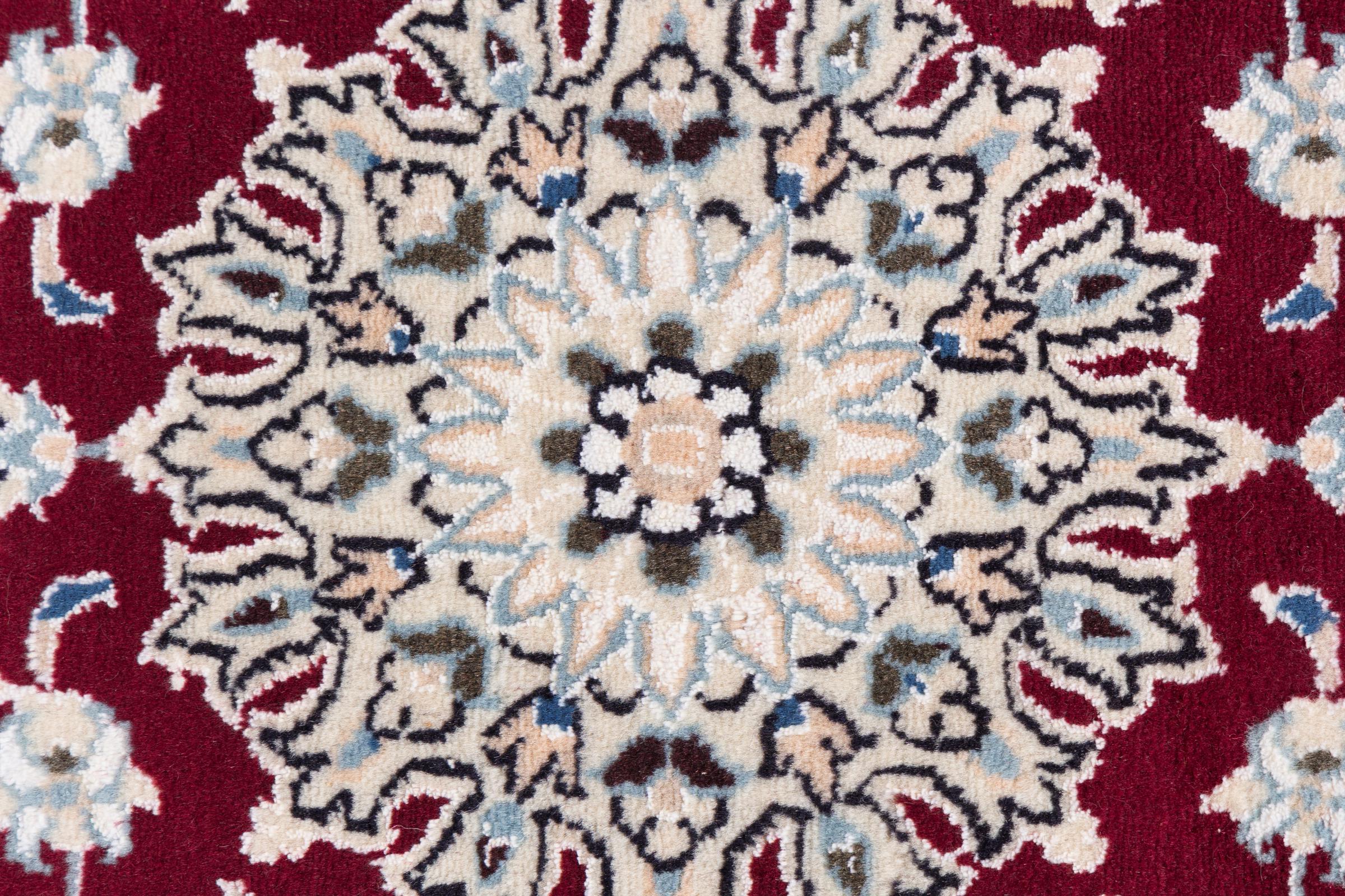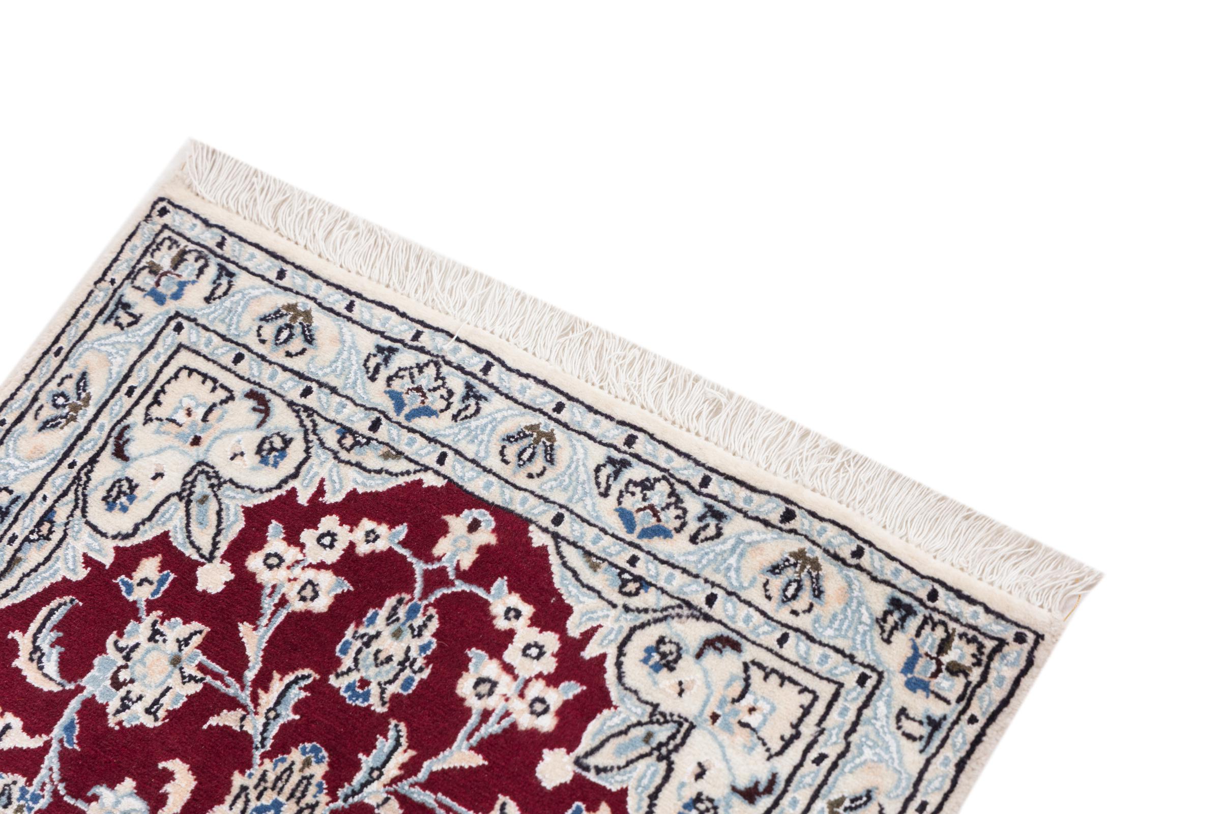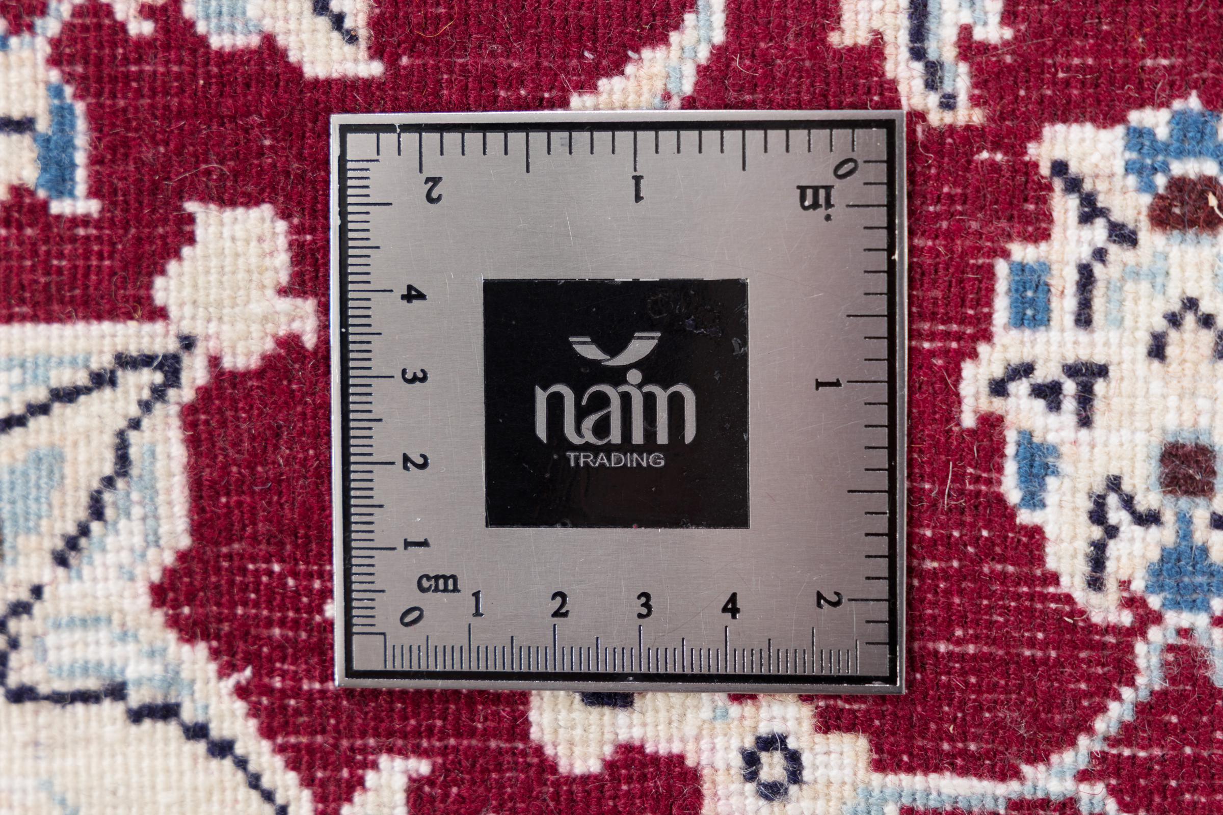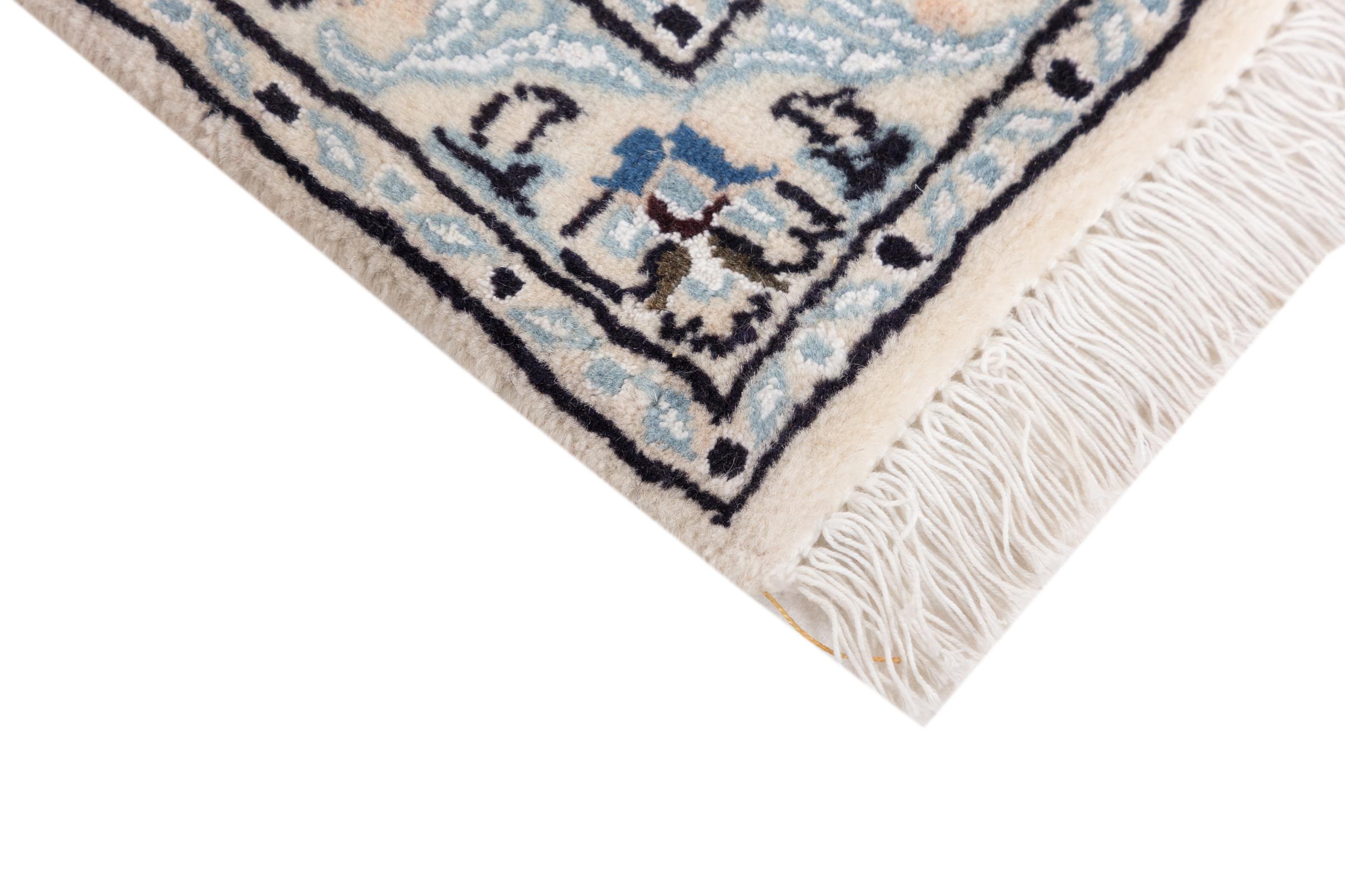 Esta alfombra Nain está clasificada como 9La. Su excelente calidad y su bello diseño oriental con motivos curvilíneos harán las delicias de cualquier comprador. Esta alfombra persa fue anudada a mano en la ciudad de Nain, situada en el extremo occidental del desierto de Dasht-e-Kavir, con lana de alta calidad y seda natural. Las alfombras Nain 9La son claramente más finas que las 12La y ya muestran bellos detalles.