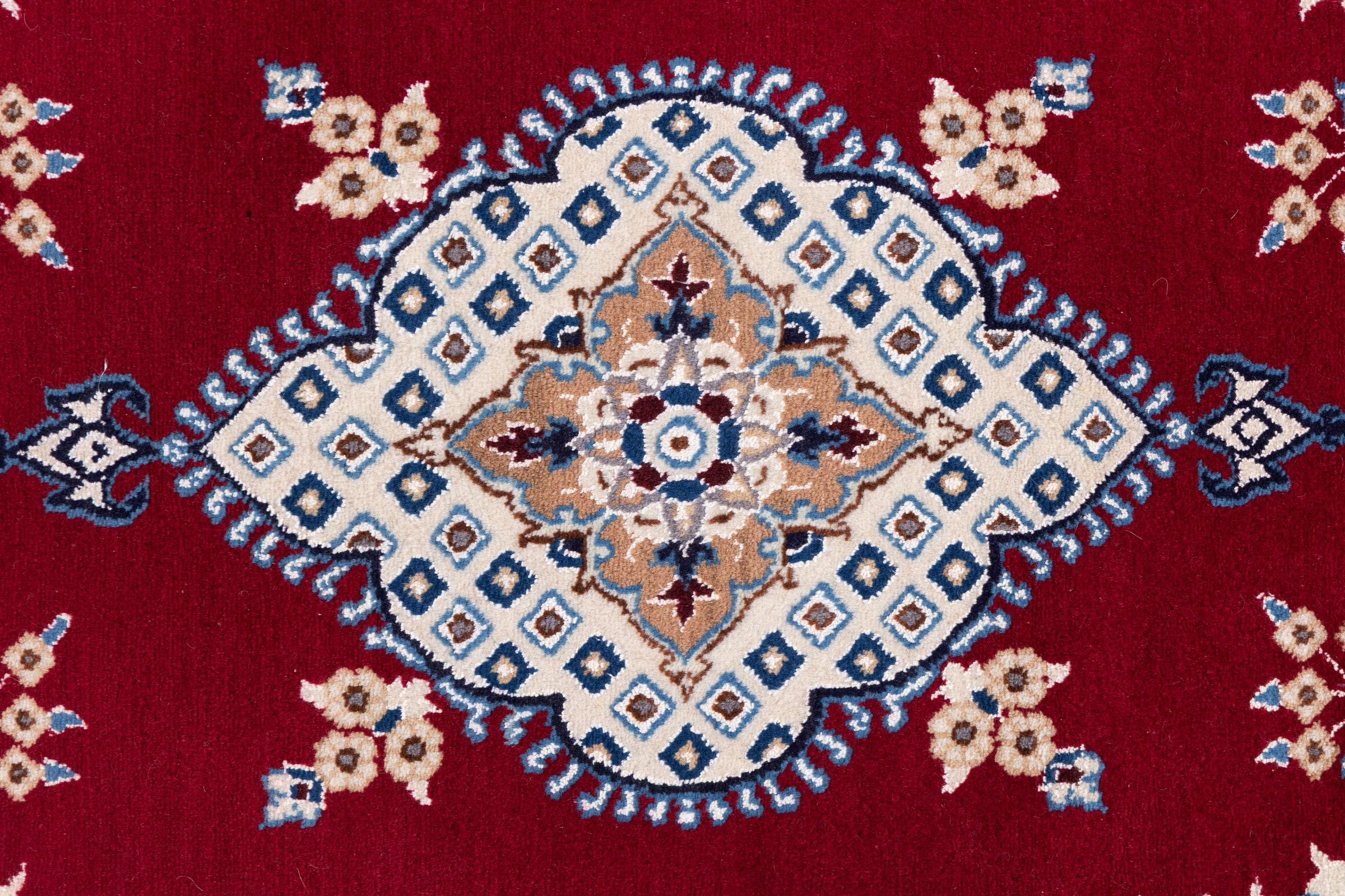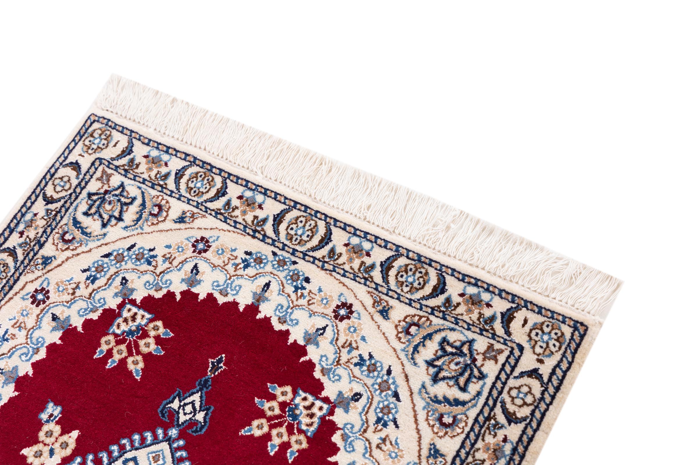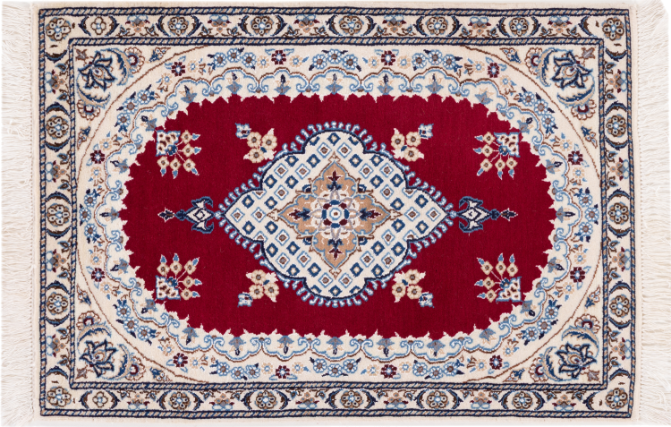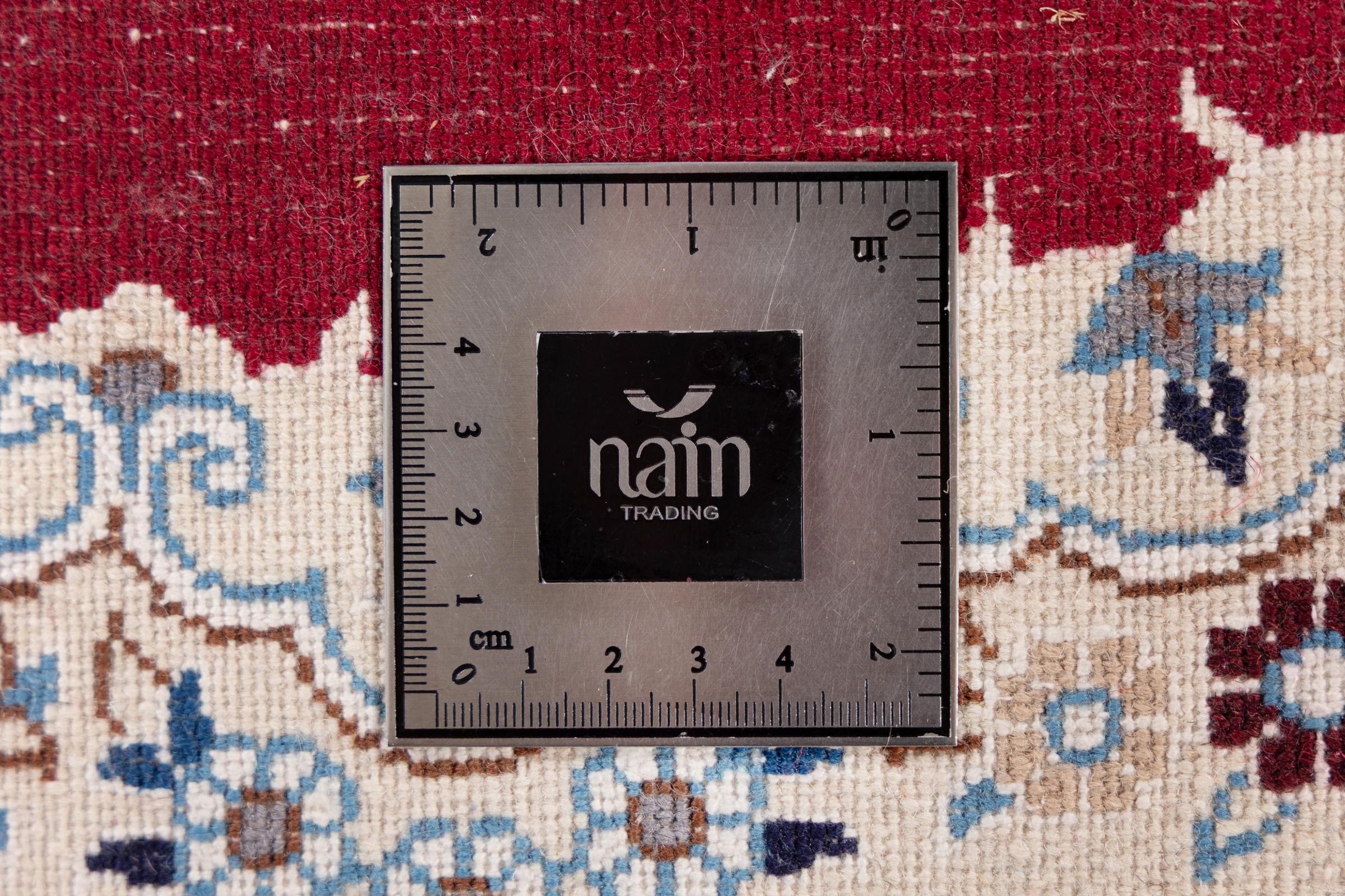 Las alfombras de la ciudad de Nain, en la frontera de uno de los mayores desiertos de Irán, están entre las alfombras persas más famosas del mundo. Su diseño típico es inconfundible con adornos florales, un medallón central y tonos beige y rojo o azul. Gracias a sus designaciones 4La, 6La, 9La y 12La, las sutilezas de una alfombra de Nain se pueden ver a simple vista. Cuanto más bajo sea el número "La", más alta es la densidad del nudo y por lo tanto más fina es la alfombra.
