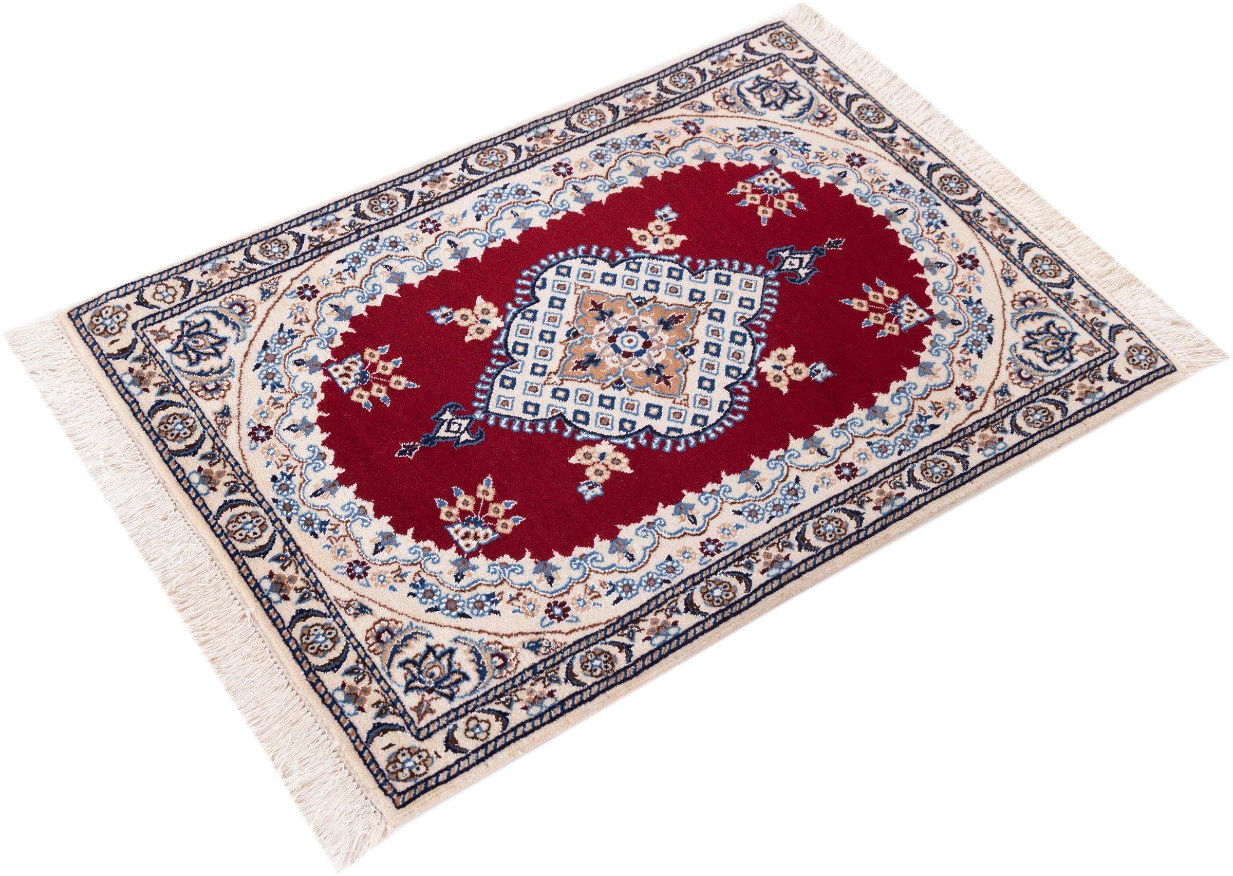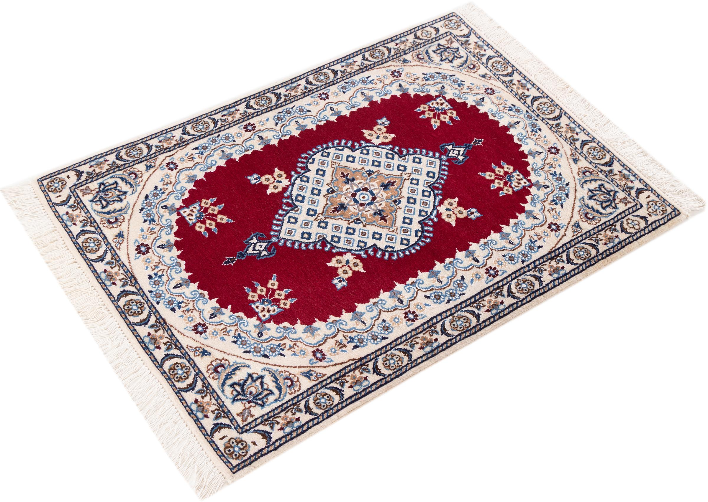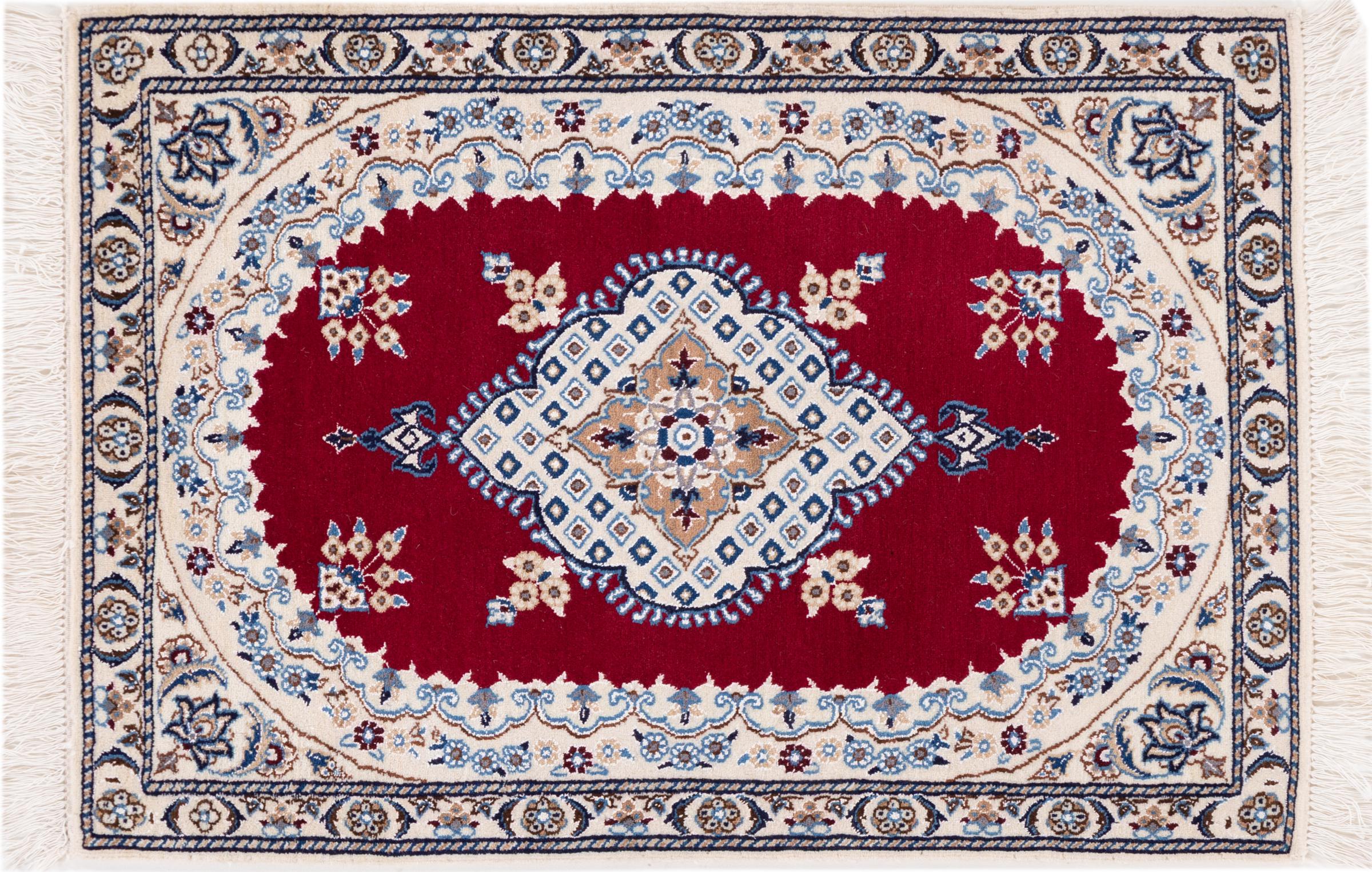Las alfombras de la ciudad de Nain, en la frontera de uno de los mayores desiertos de Irán, están entre las alfombras persas más famosas del mundo. Su diseño típico es inconfundible con adornos florales, un medallón central y tonos beige y rojo o azul. Gracias a sus designaciones 4La, 6La, 9La y 12La, las sutilezas de una alfombra de Nain se pueden ver a simple vista. Cuanto más bajo sea el número "La", más alta es la densidad del nudo y por lo tanto más fina es la alfombra.