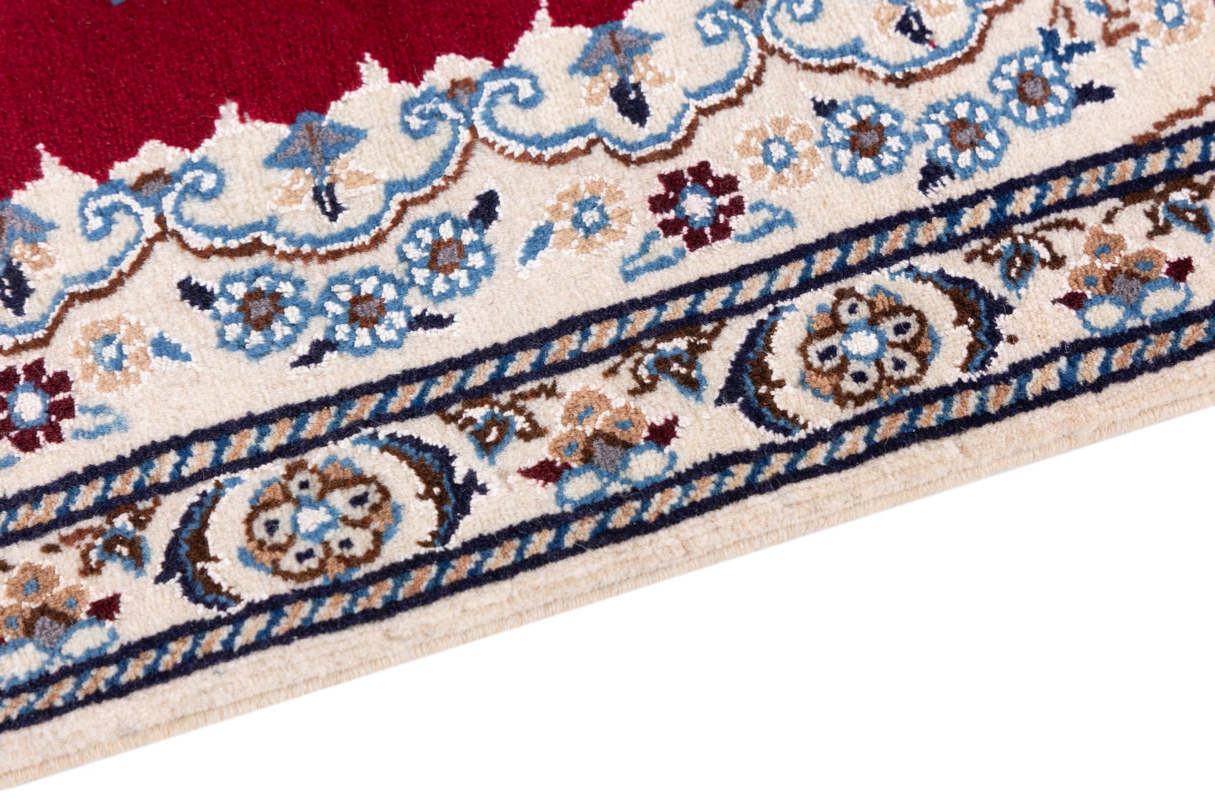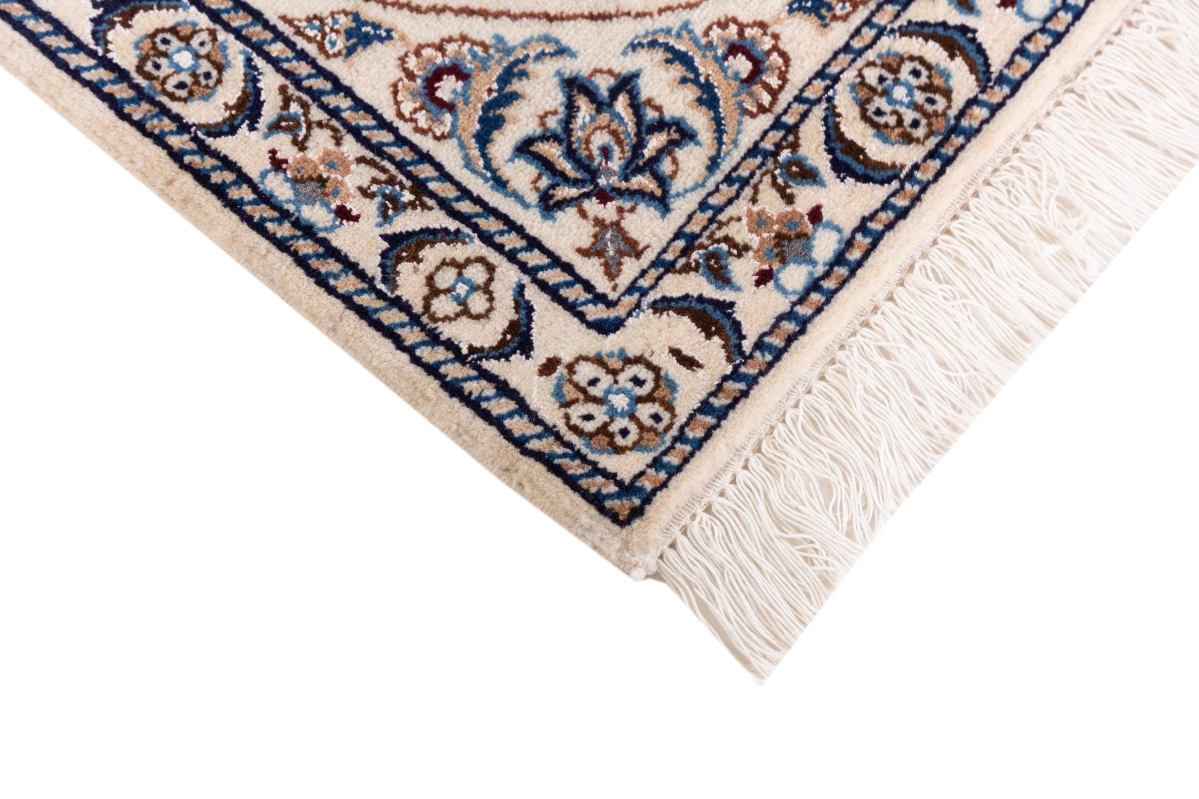 Esta alfombra Nain está clasificada como 9La. Su excelente calidad y su bello diseño oriental con motivos curvilíneos harán las delicias de cualquier comprador. Esta alfombra persa fue anudada a mano en la ciudad de Nain, situada en el extremo occidental del desierto de Dasht-e-Kavir, con lana de alta calidad y seda natural. Las alfombras Nain 9La son claramente más finas que las 12La y ya muestran bellos detalles.