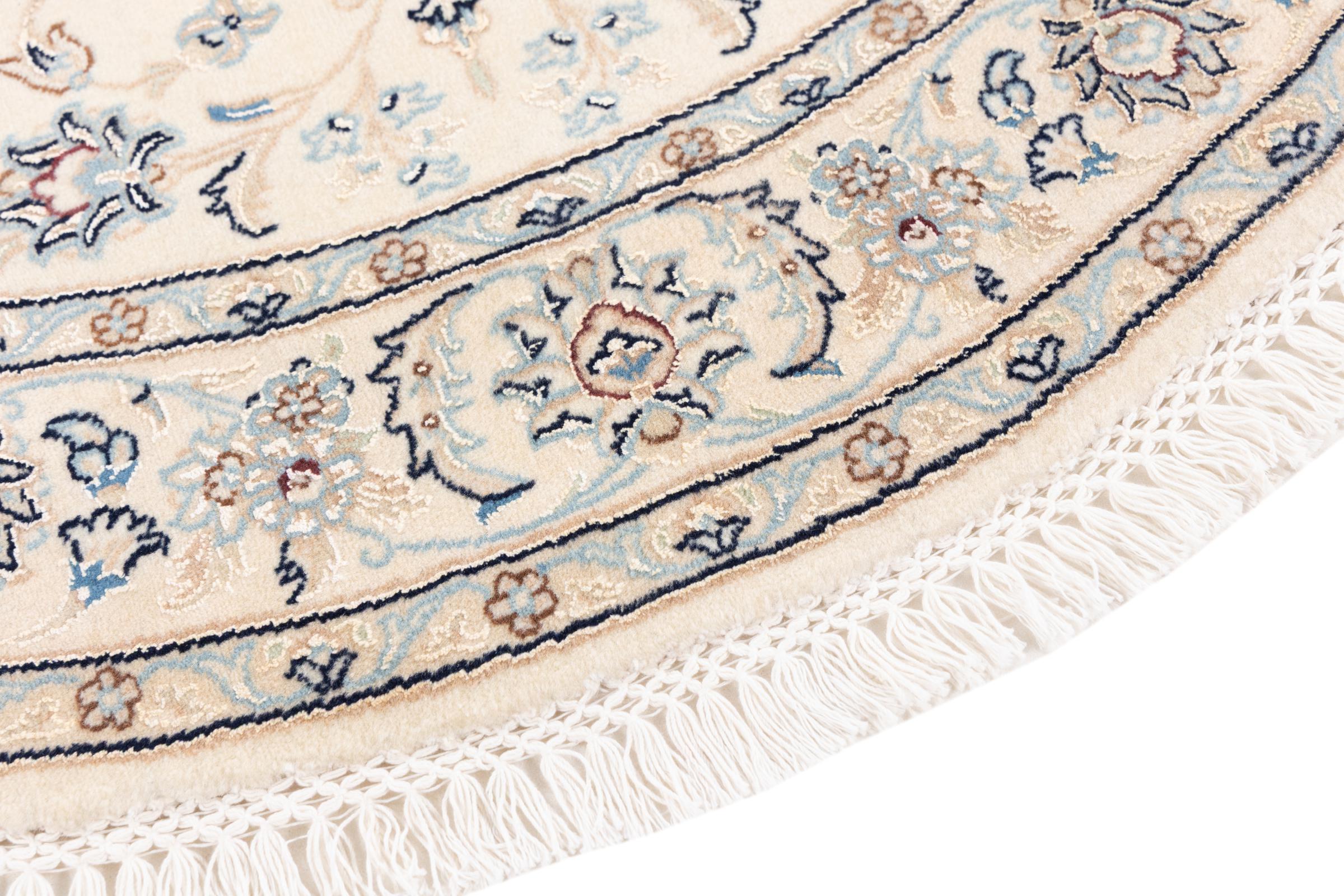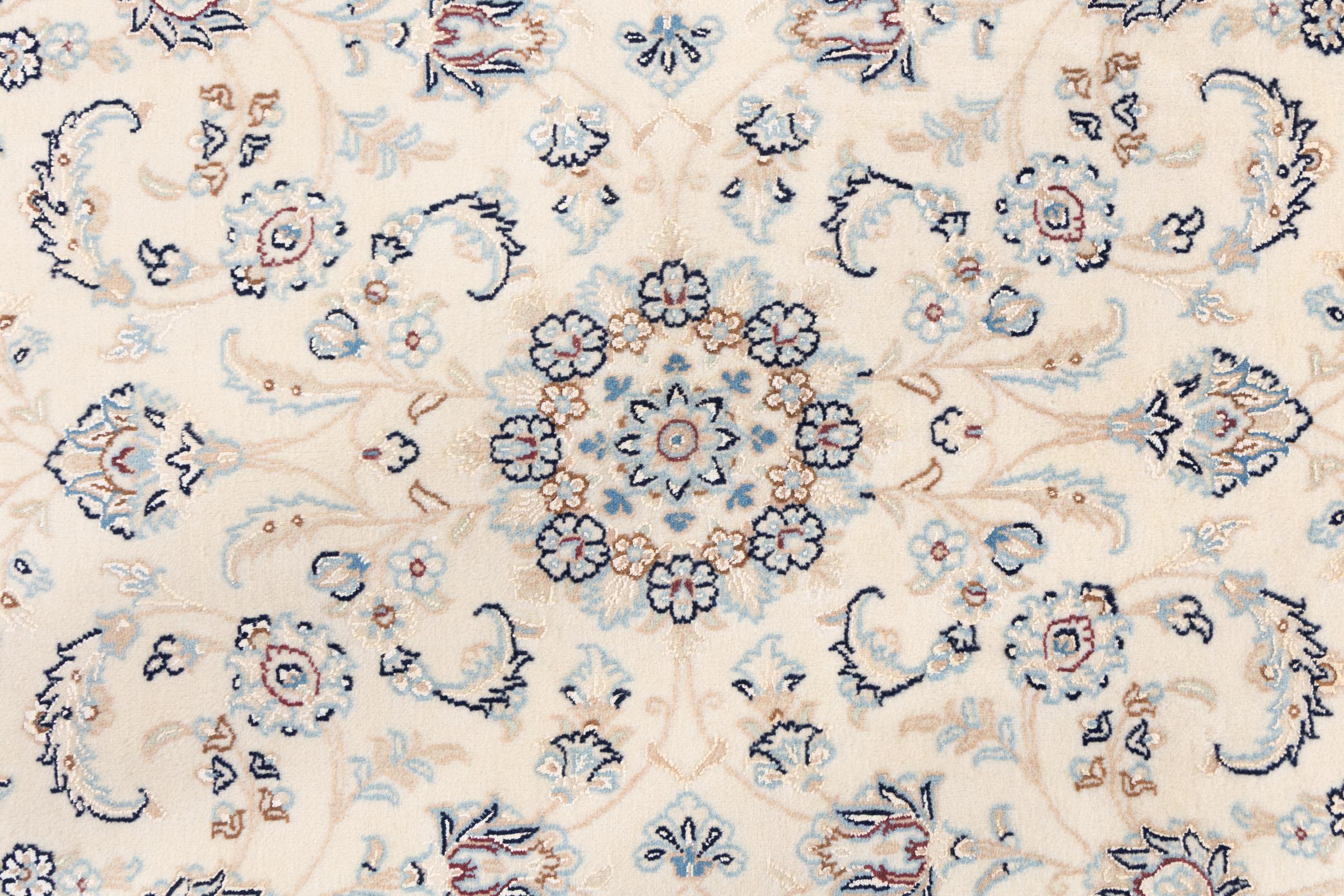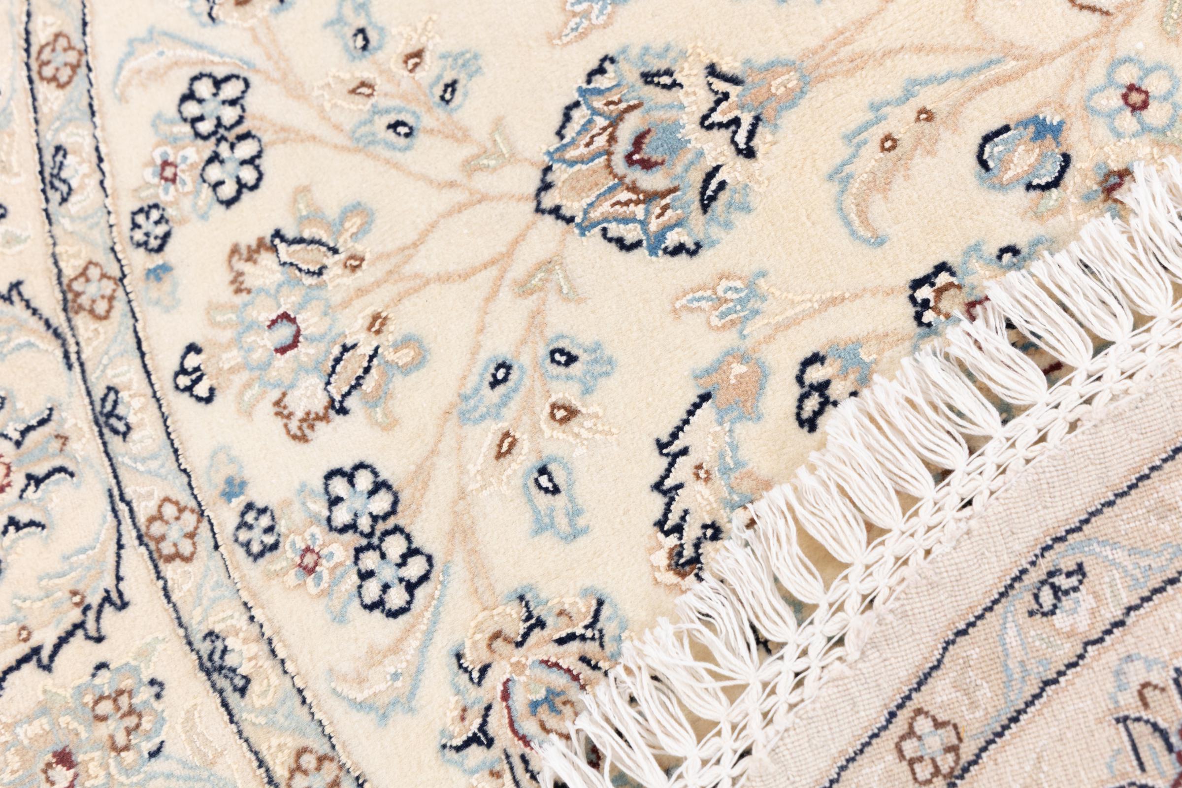 Esta alfombra Nain está clasificada como 9La. Su excelente calidad y su bello diseño oriental con motivos curvilíneos harán las delicias de cualquier comprador. Esta alfombra persa fue anudada a mano en la ciudad de Nain, situada en el extremo occidental del desierto de Dasht-e-Kavir, con lana de alta calidad y seda natural. Las alfombras Nain 9La son claramente más finas que las 12La y ya muestran bellos detalles.