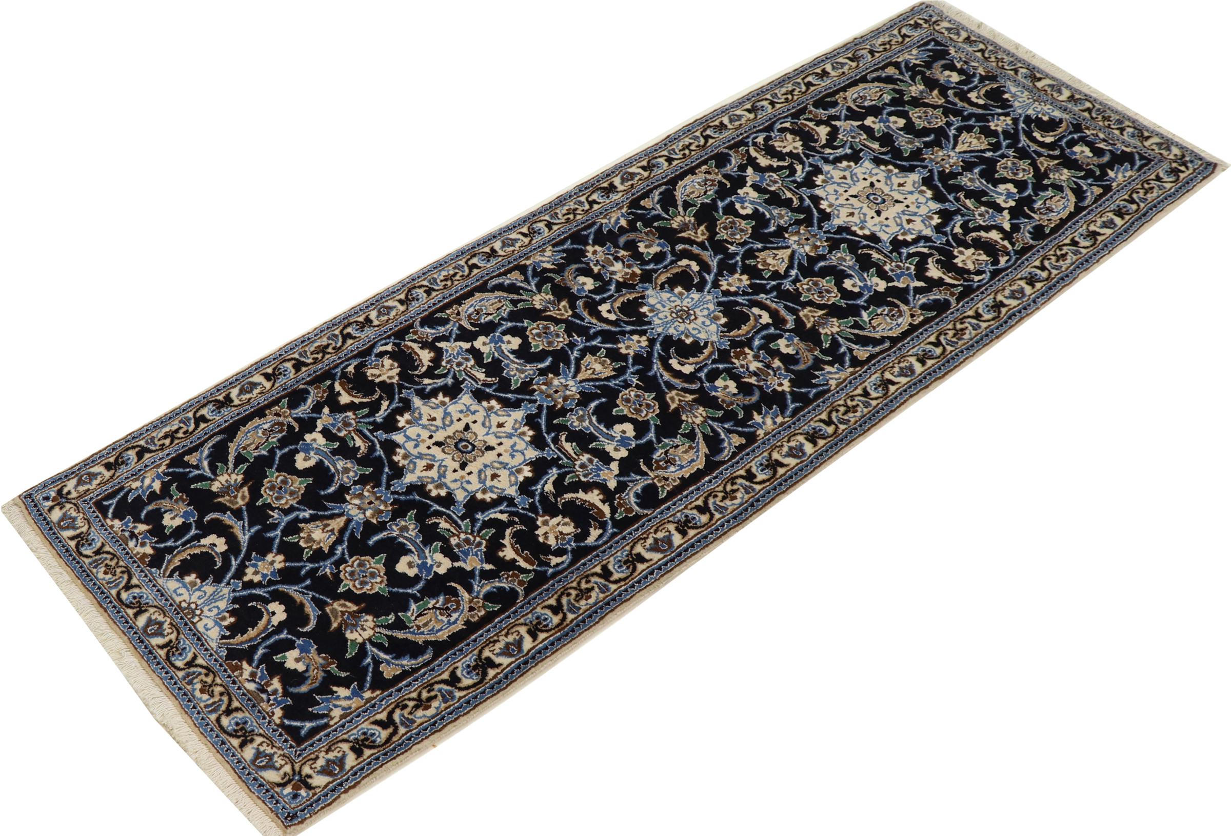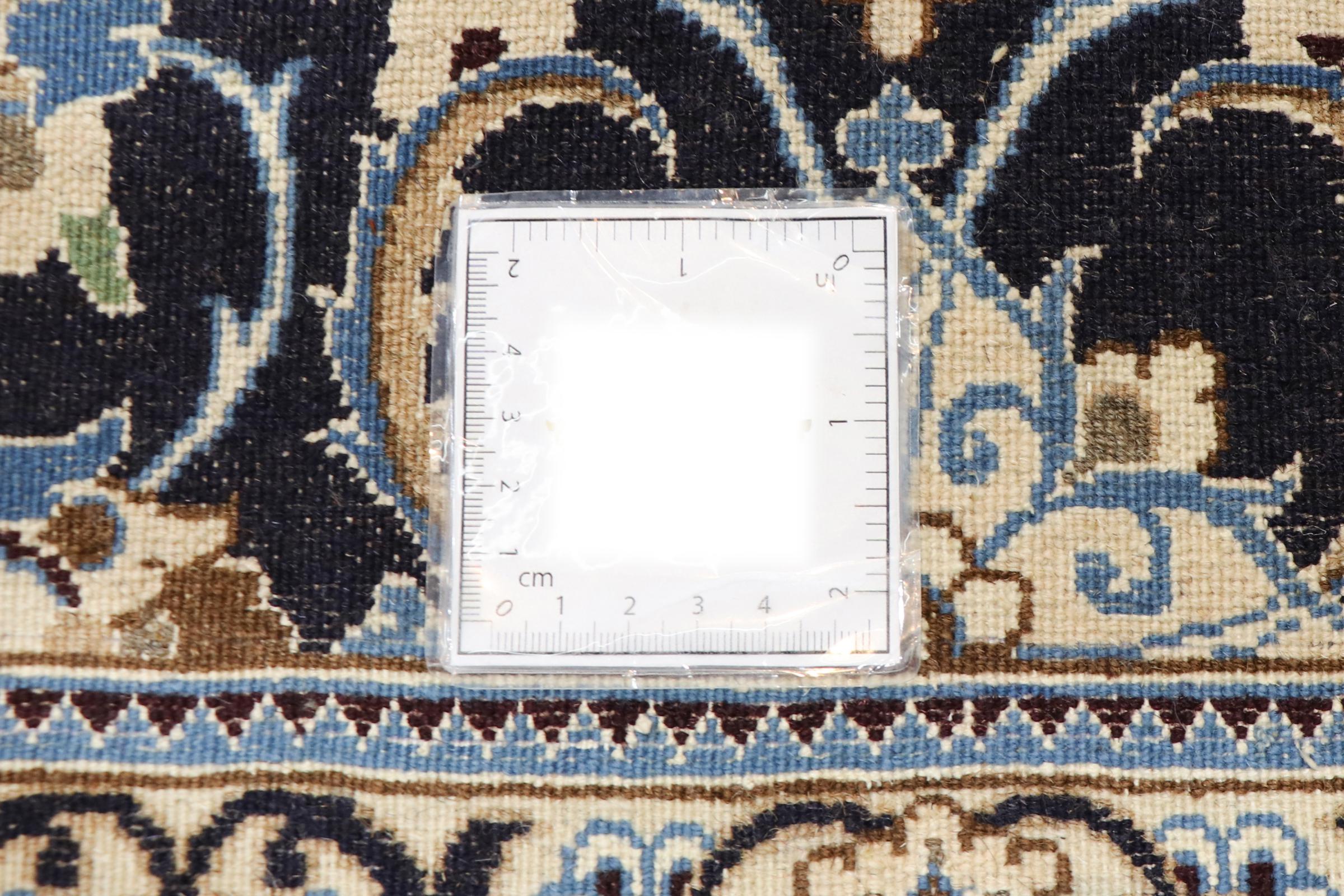 Esta alfombra Nain está clasificada como 9La. Su excelente calidad y su bello diseño oriental con motivos curvilíneos harán las delicias de cualquier comprador. Esta alfombra persa fue anudada a mano en la ciudad de Nain, situada en el extremo occidental del desierto de Dasht-e-Kavir, con lana de alta calidad y seda natural. Las alfombras Nain 9La son claramente más finas que las 12La y ya muestran bellos detalles.