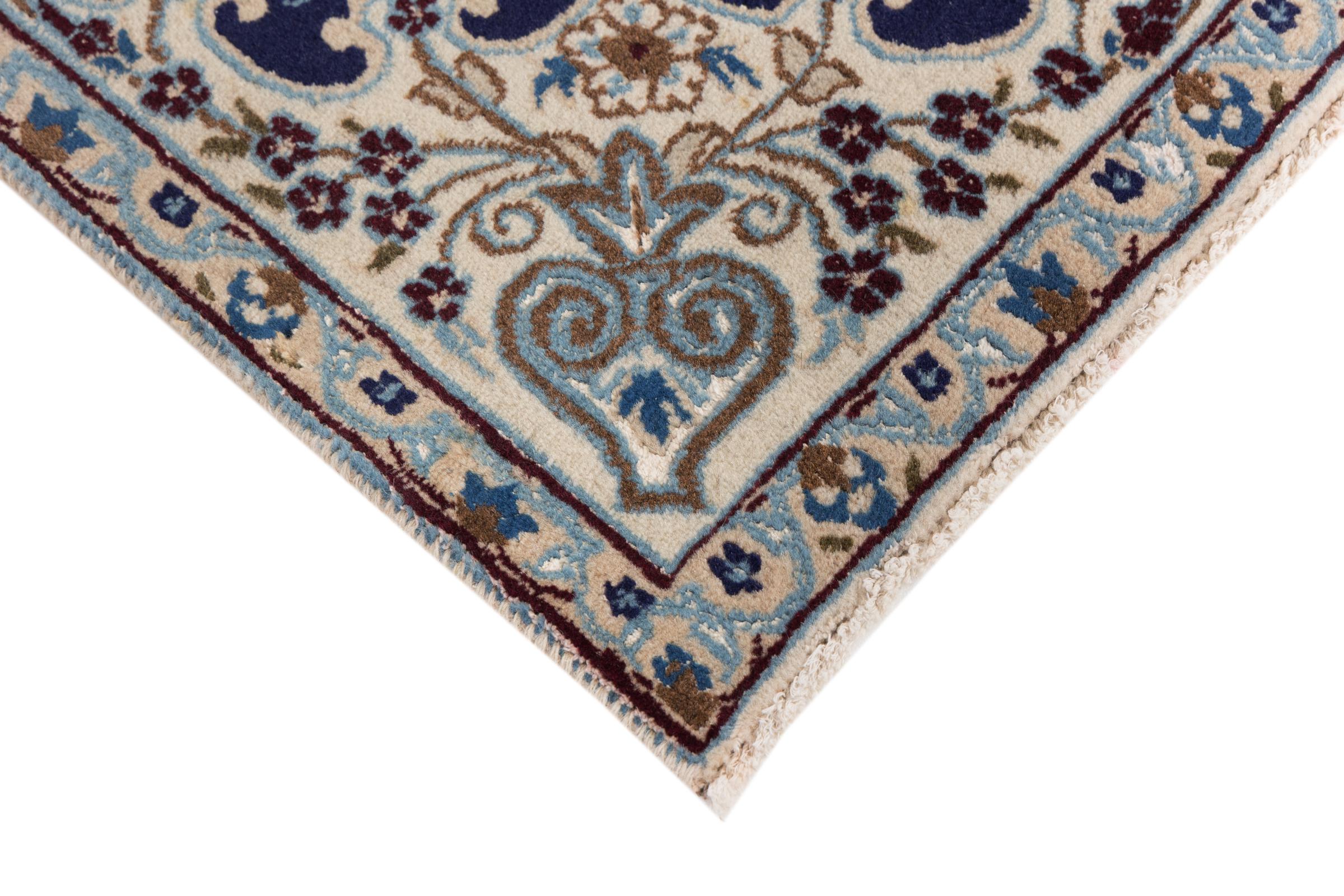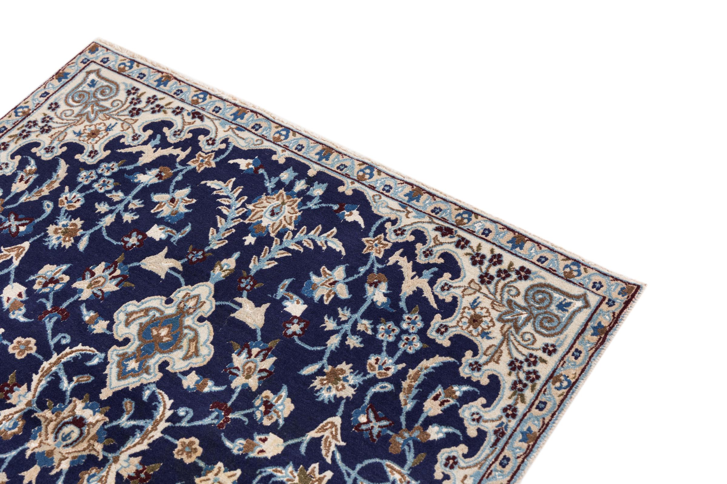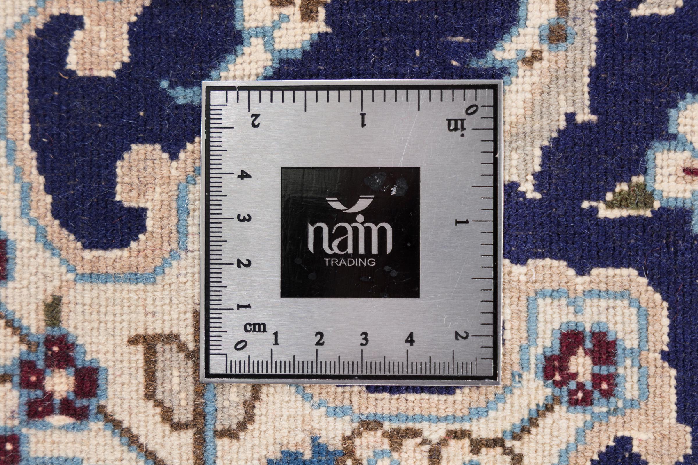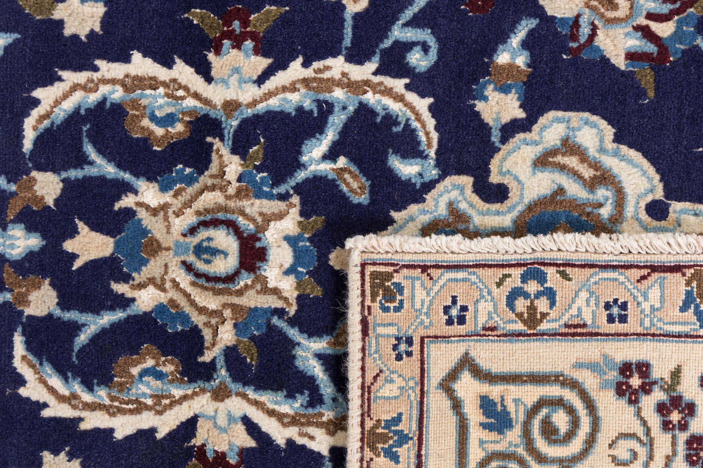 Esta alfombra Nain está clasificada como 9La. Su excelente calidad y su bello diseño oriental con motivos curvilíneos harán las delicias de cualquier comprador. Esta alfombra persa fue anudada a mano en la ciudad de Nain, situada en el extremo occidental del desierto de Dasht-e-Kavir, con lana de alta calidad y seda natural. Las alfombras Nain 9La son claramente más finas que las 12La y ya muestran bellos detalles.
