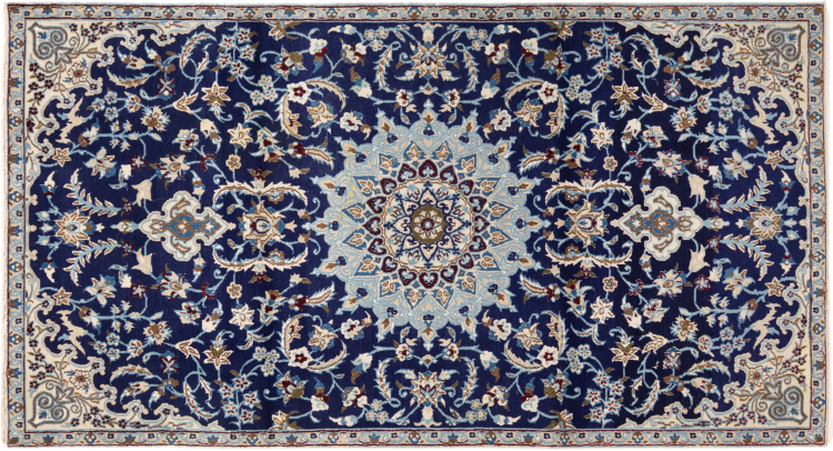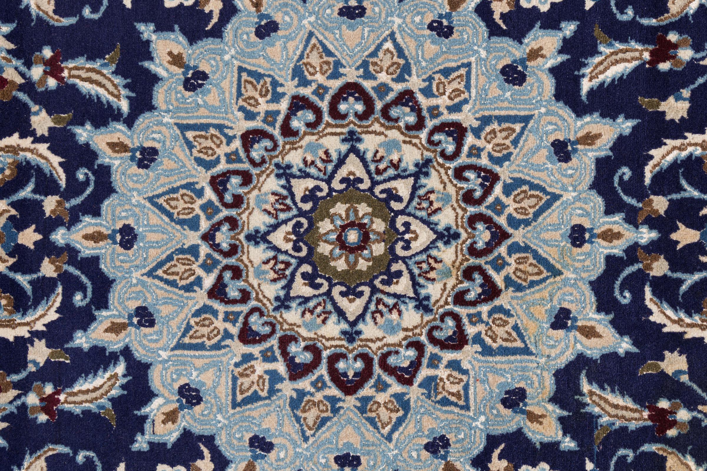 Las alfombras de la ciudad de Nain, en la frontera de uno de los mayores desiertos de Irán, están entre las alfombras persas más famosas del mundo. Su diseño típico es inconfundible con adornos florales, un medallón central y tonos beige y rojo o azul. Gracias a sus designaciones 4La, 6La, 9La y 12La, las sutilezas de una alfombra de Nain se pueden ver a simple vista. Cuanto más bajo sea el número "La", más alta es la densidad del nudo y por lo tanto más fina es la alfombra.